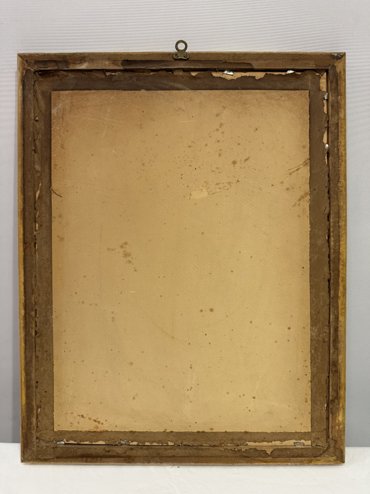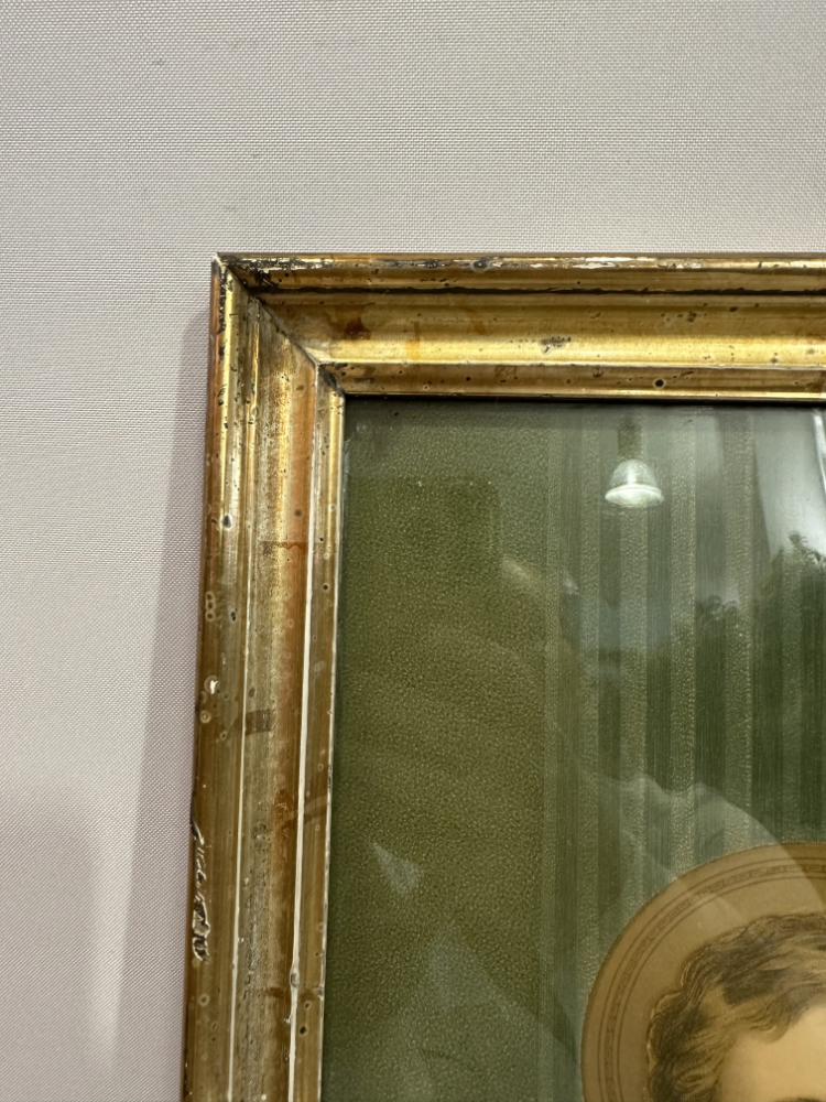 Der Druck besticht durch seine sanfte Kolorierung und feine Schattierung, die auf das aufwendige Lithografieverfahren hinweist. Unter Glas präsentiert und im originalen, vergoldeten Holzrahmen gefasst, zeigt das Werk eine warme, spirituelle Ausstrahlung. Altersbedingte Spuren am Rahmen unterstreichen seinen authentischen Charakter.