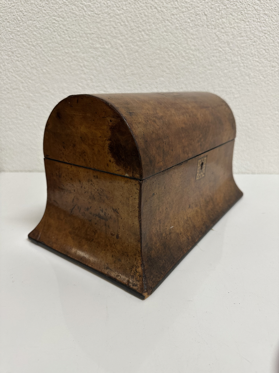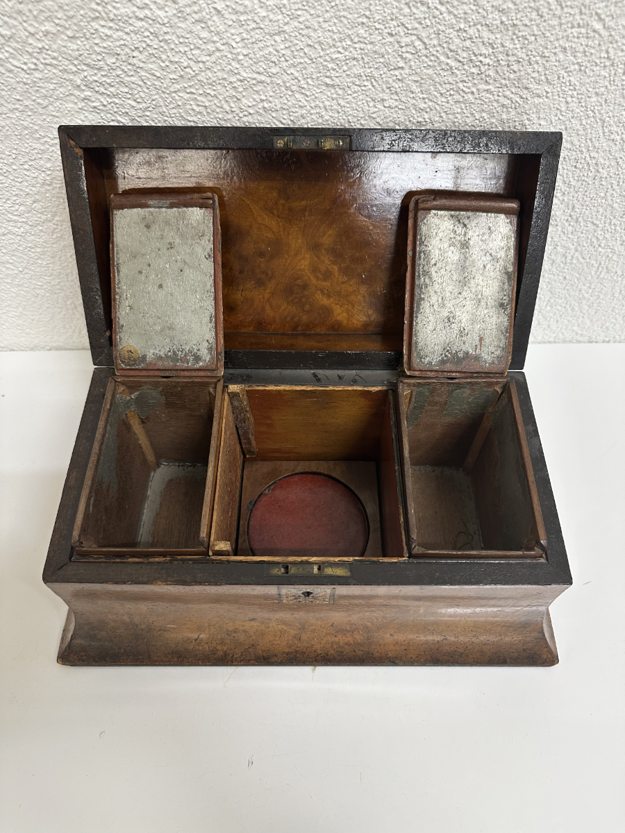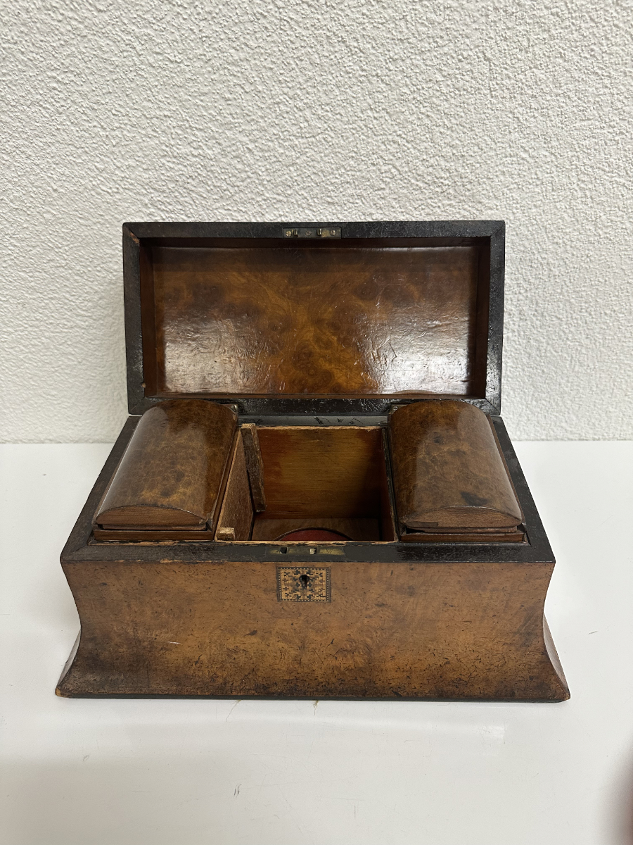 Zwei seitliche Einsätze, ein Mittelbereich und der klassische Wölbdeckel: Das ist kein Nähkästchen, sondern ein Tea Caddy wie man ihn im 19. Jahrhundert genutzt hat, um hochwertigen Tee stilvoll aufzubewahren. Die ruhige Form, das warme Wurzelholz Furnier und die feine Intarsie auf dem Deckel passen wunderbar zum Biedermeier-Stil. Innen findest du die typische Aufteilung für Teesorten, dazu die kleinen Klappdeckel für die Einsätze.