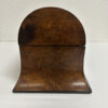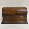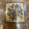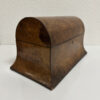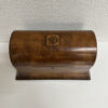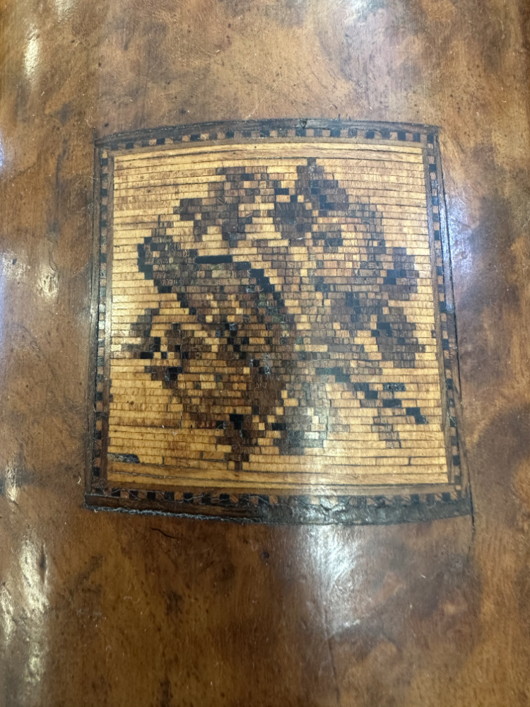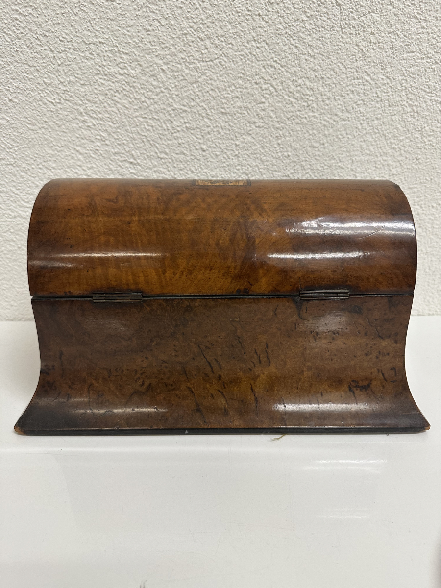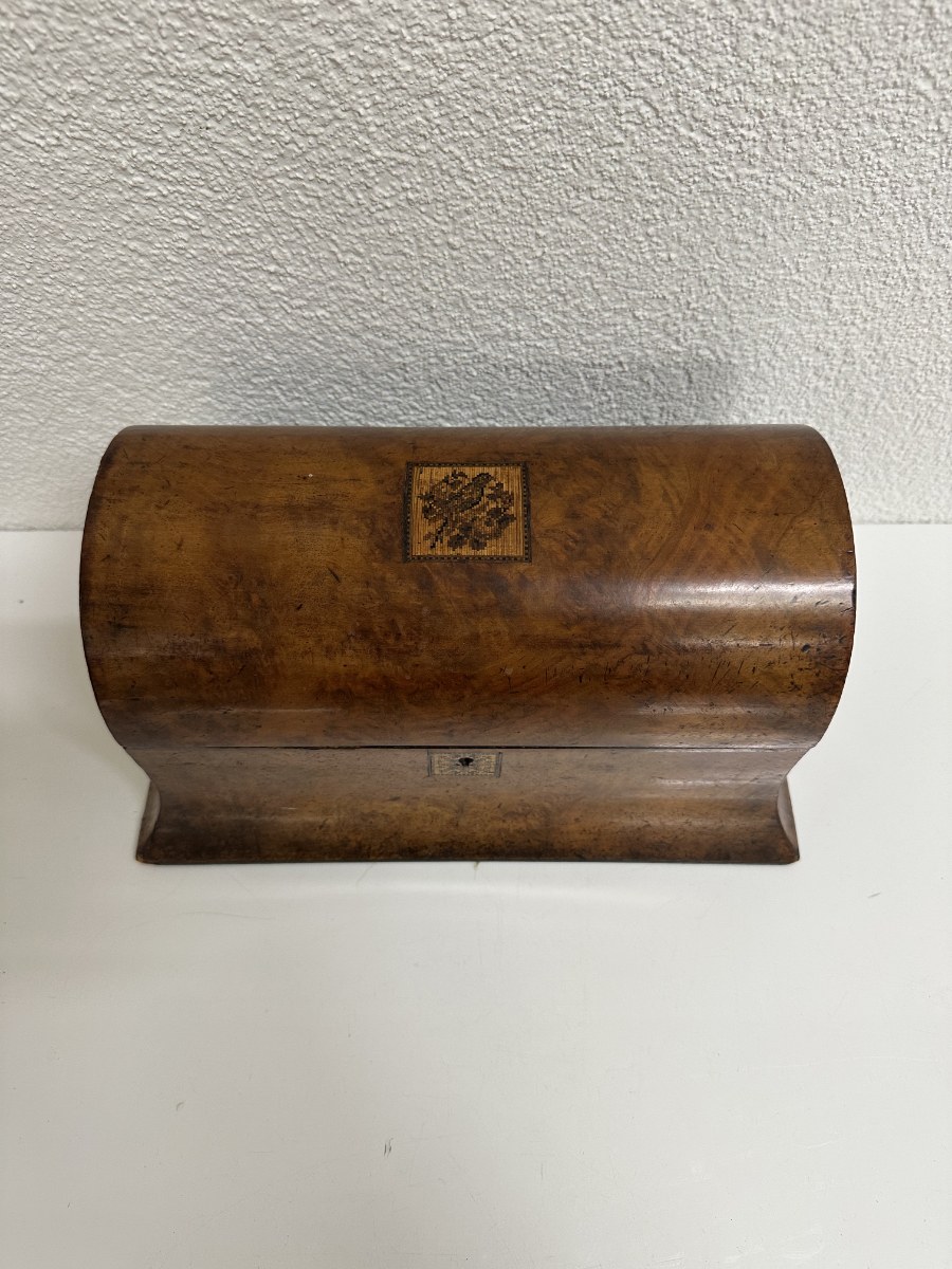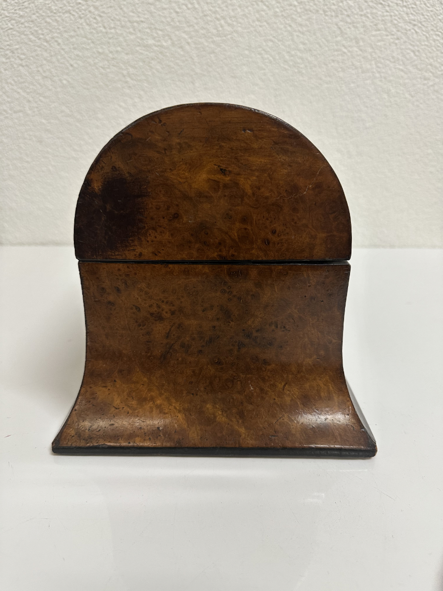 Zwei seitliche Einsätze, ein Mittelbereich und der klassische Wölbdeckel: Das ist kein Nähkästchen, sondern ein Tea Caddy wie man ihn im 19. Jahrhundert genutzt hat, um hochwertigen Tee stilvoll aufzubewahren. Die ruhige Form, das warme Wurzelholz Furnier und die feine Intarsie auf dem Deckel passen wunderbar zum Biedermeier-Stil. Innen findest du die typische Aufteilung für Teesorten, dazu die kleinen Klappdeckel für die Einsätze.