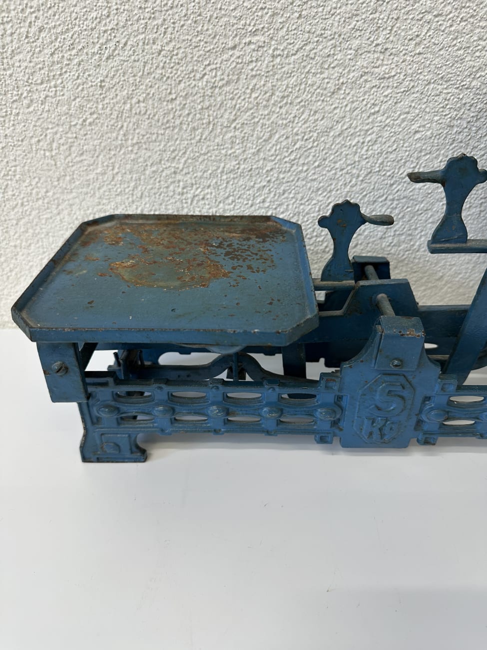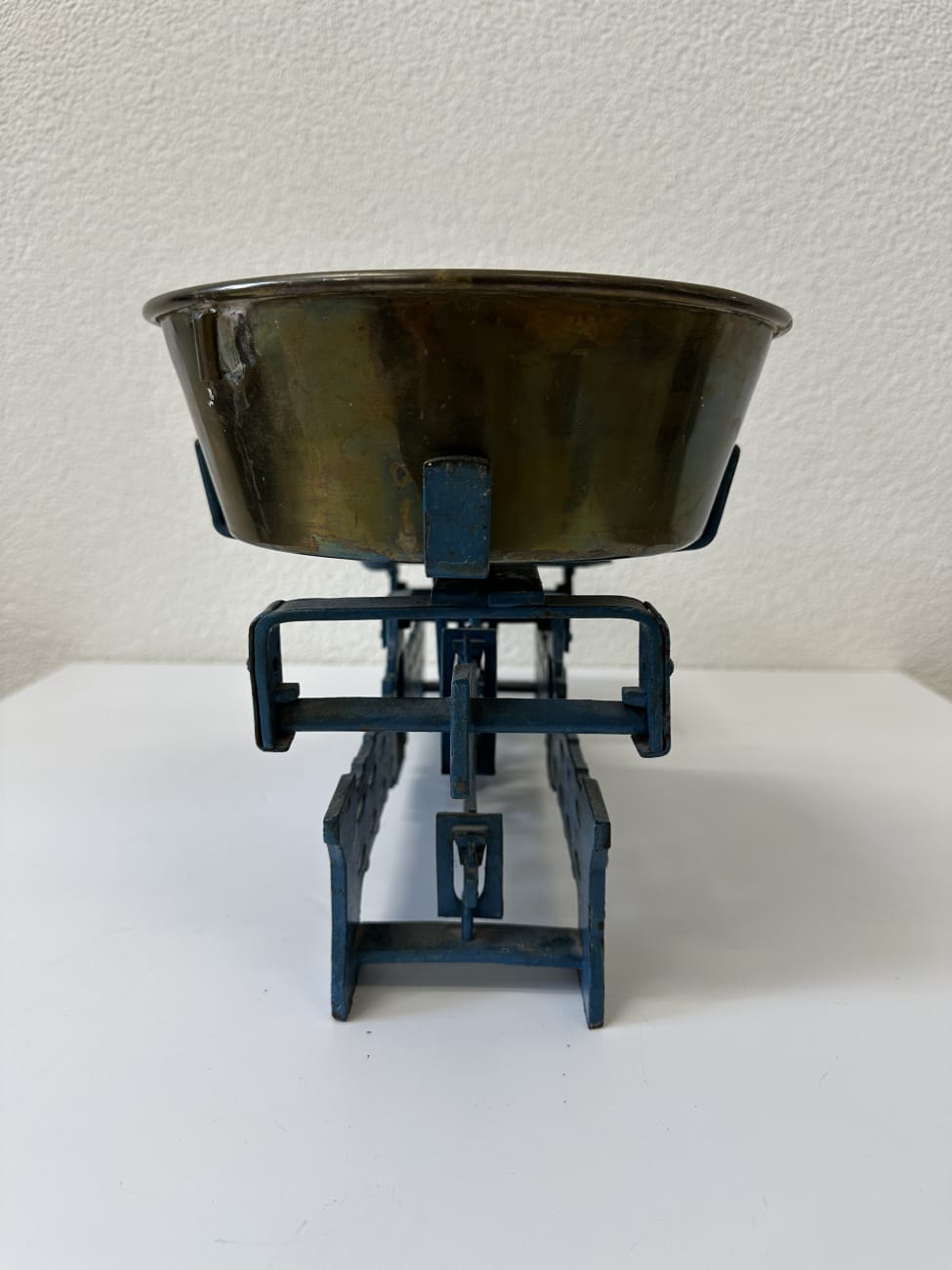 Schwere, robuste Ausführung mit klarer Mechanik und ehrlicher Ausstrahlung. Diese antike Balkenwaage besteht aus massivem Gusseisen und einer grossen Messingschale, die mit der Zeit eine schöne Patina entwickelt hat. Die typische Bauweise mit sichtbaren Hebeln und der 5 kg Kennzeichnung zeigt, dass sie früher im Handel oder Haushalt im Einsatz war. Heute wirkt sie besonders stark als Dekostück mit Charakter.