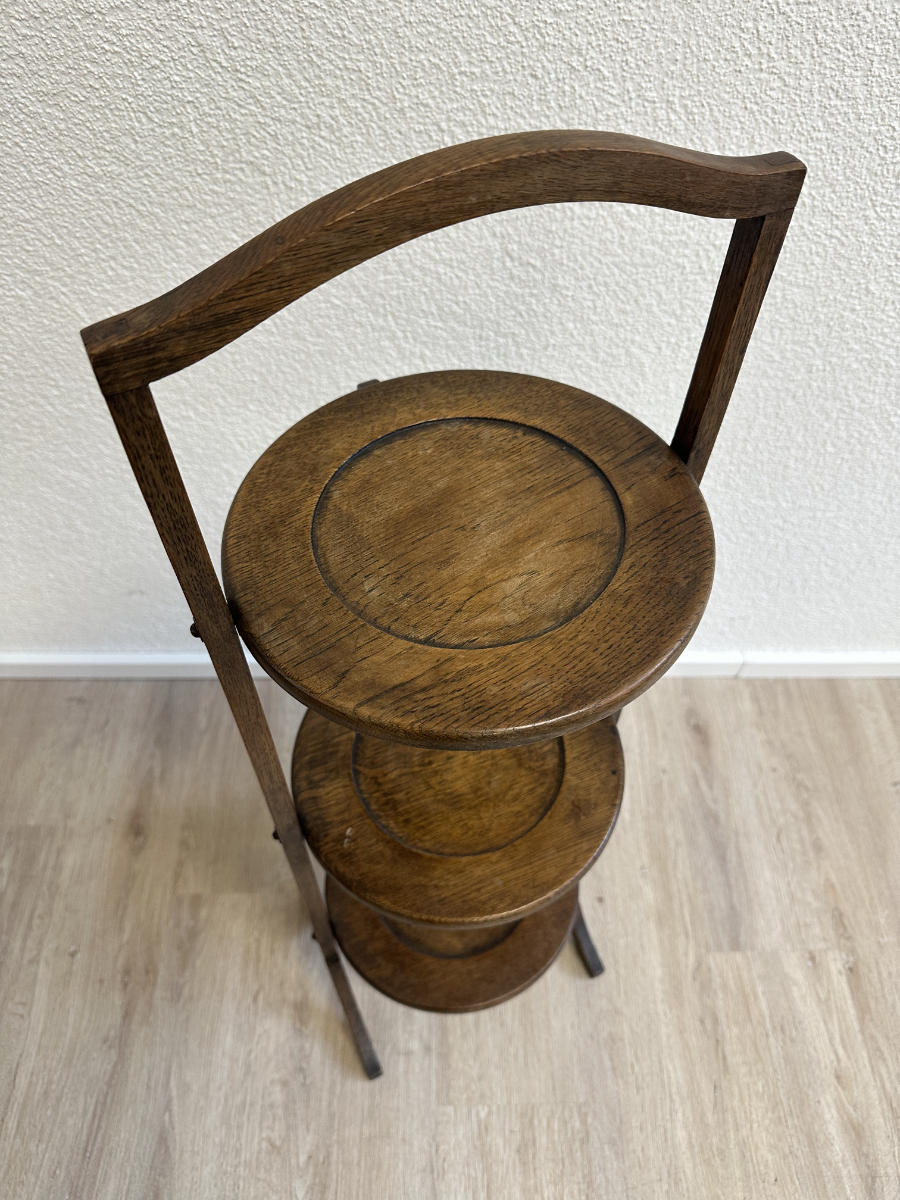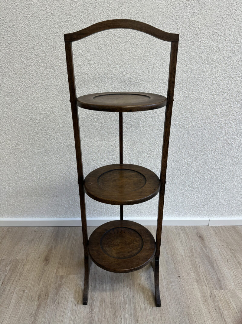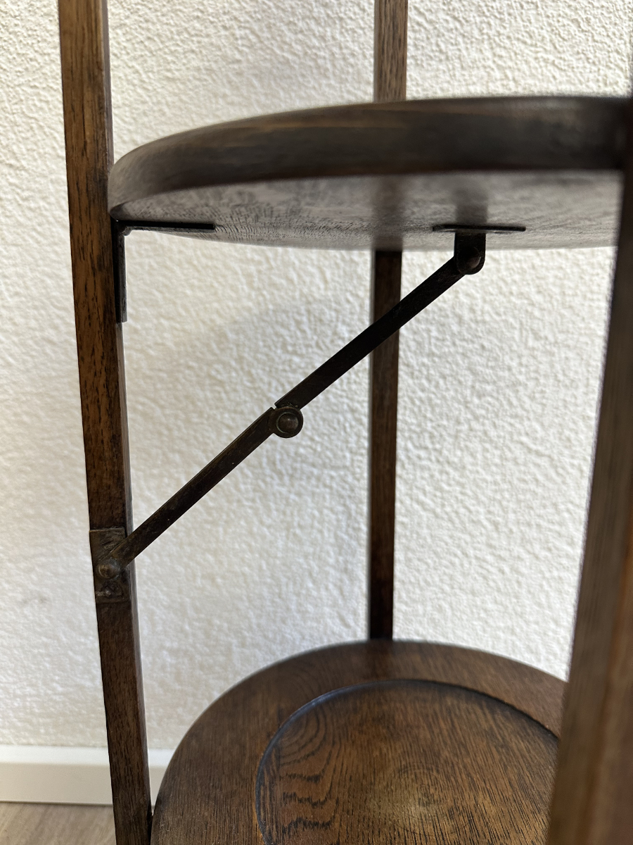 Drei runde Ablagen, ein geschwungener Tragebogen oben und diese schlanke, elegante Silhouette: Genau so sieht praktische Wohnkultur aus der Jugendstilzeit aus. Die Form wirkt leicht und dekorativ, gleichzeitig steckt dahinter ein cleveres Klappsystem, mit dem sich die Etagere platzsparend verstauen lässt. Ideal als Blumenständer, für kleine Dekoobjekte oder als stilvolle Ablage im Eingangsbereich.