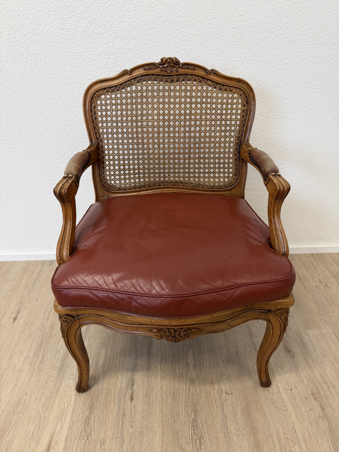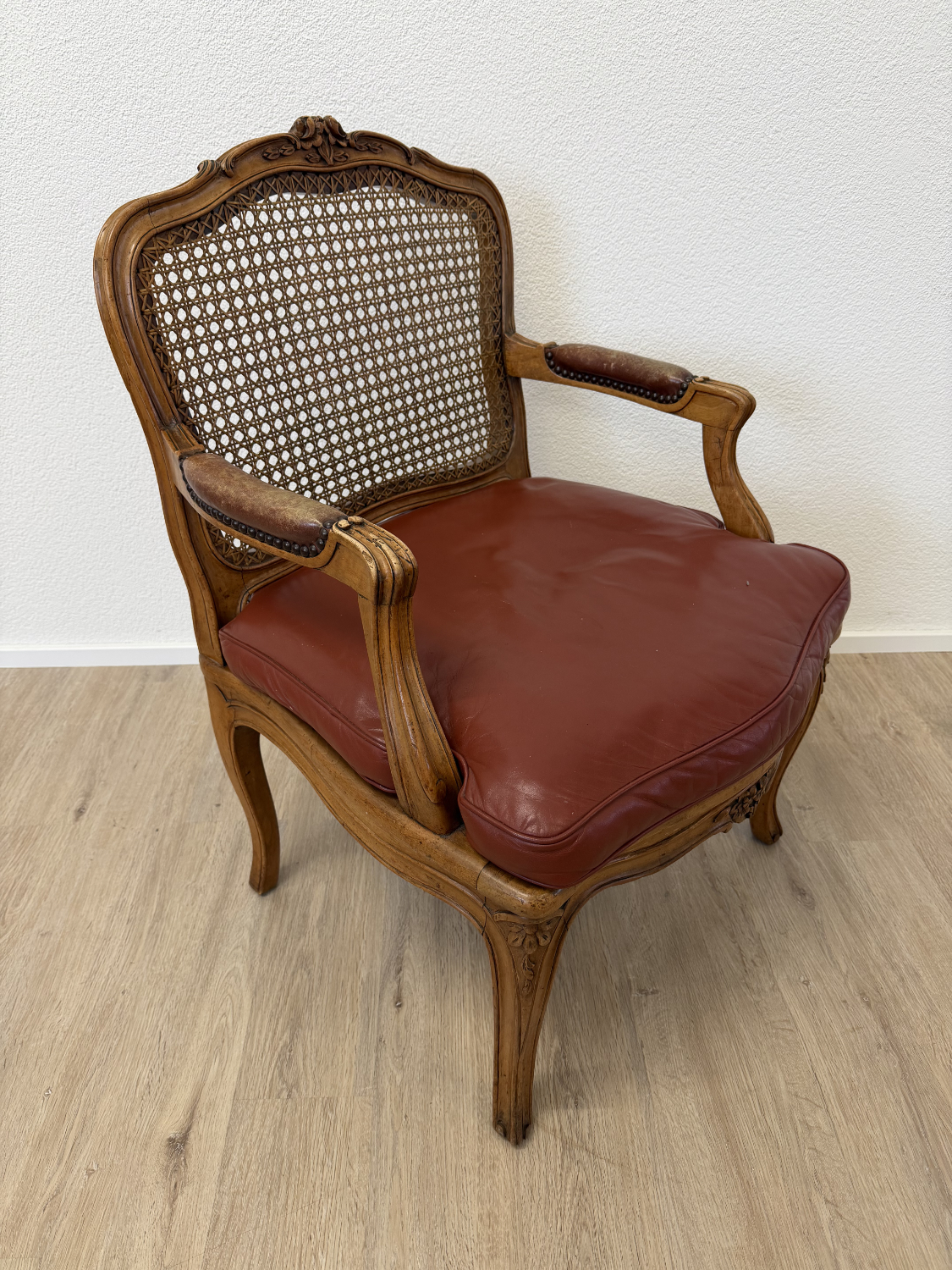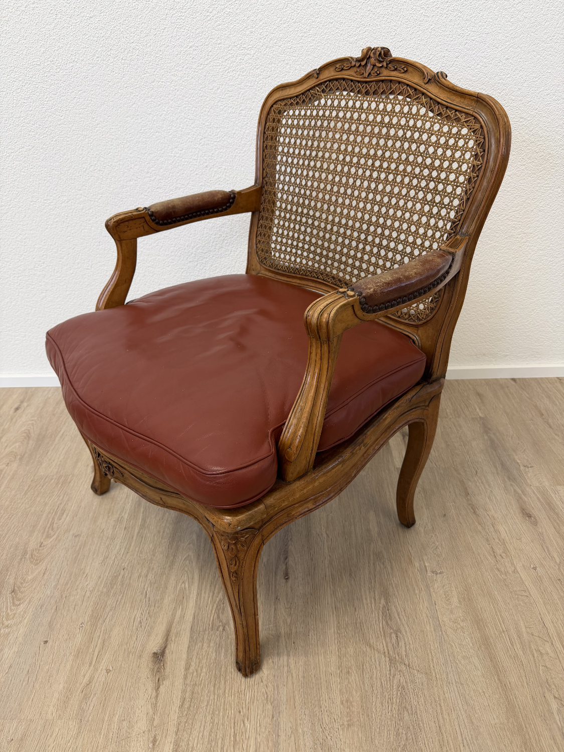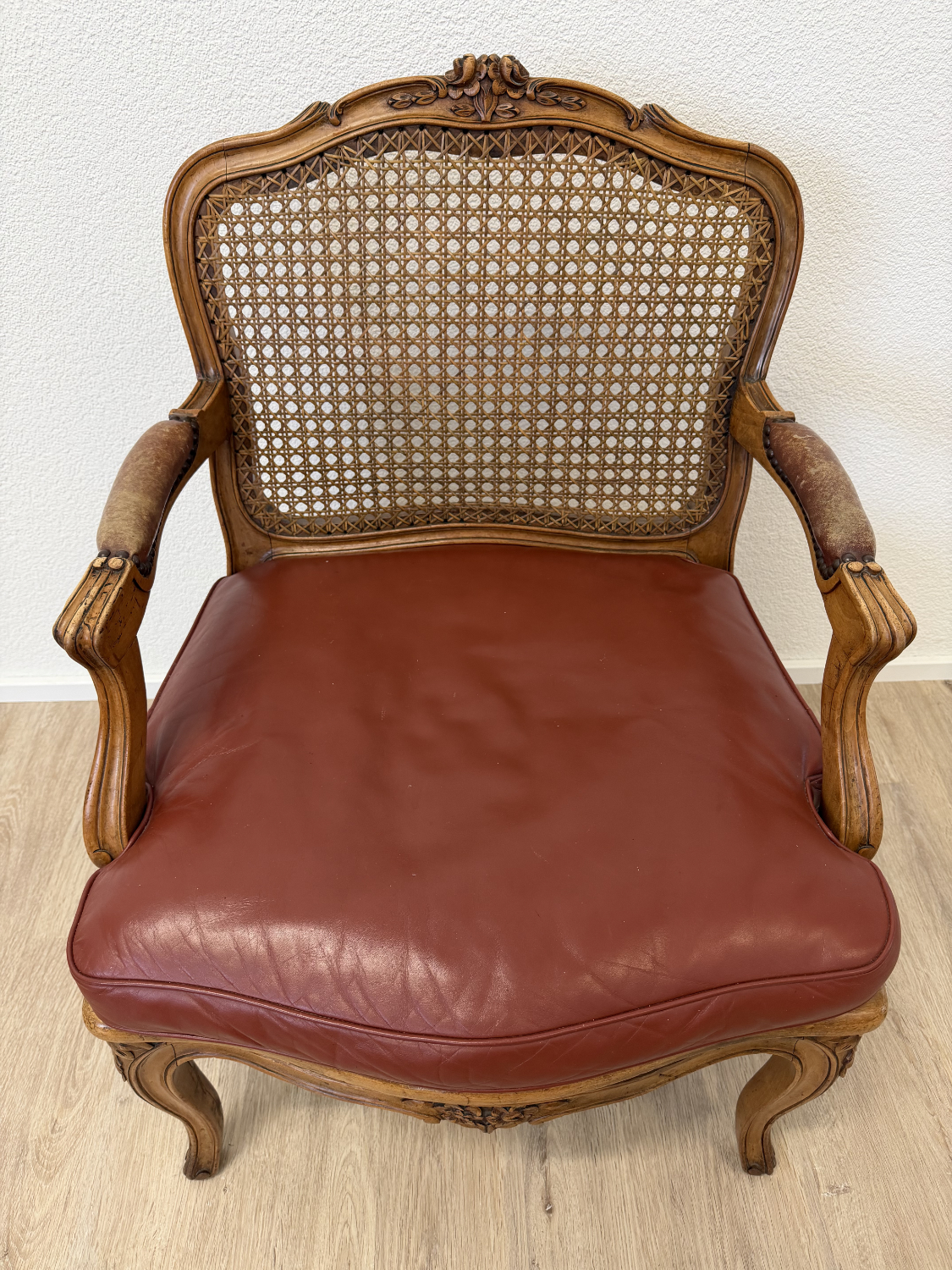 Jahrhundert, Louis XV Zeit, echte Handwerksarbeit mit eleganter Linienführung: Dieser Cabriolet Sessel zeigt alles, was man an französischen Sitzmöbeln dieser Epoche liebt. Geschwungene Beine, fein geschnitzte Details und das klassische Wiener Geflecht sorgen für eine leichte, edle Wirkung. Die Armlehnen sind mit rotem Leder bezogen und mit Ziernägeln eingefasst. Dazu kommt ein passendes rotes Sitzkissen, das den Sessel noch bequemer macht. Eine schöne Patina rundet das Ganze ab.