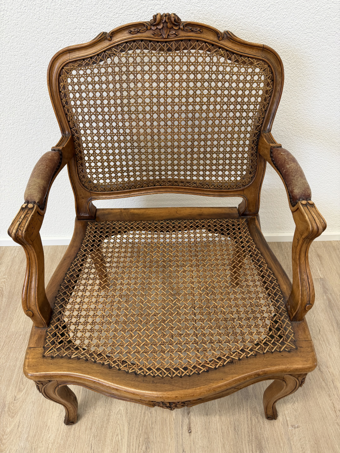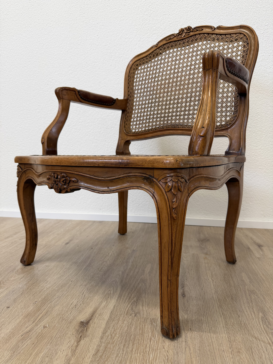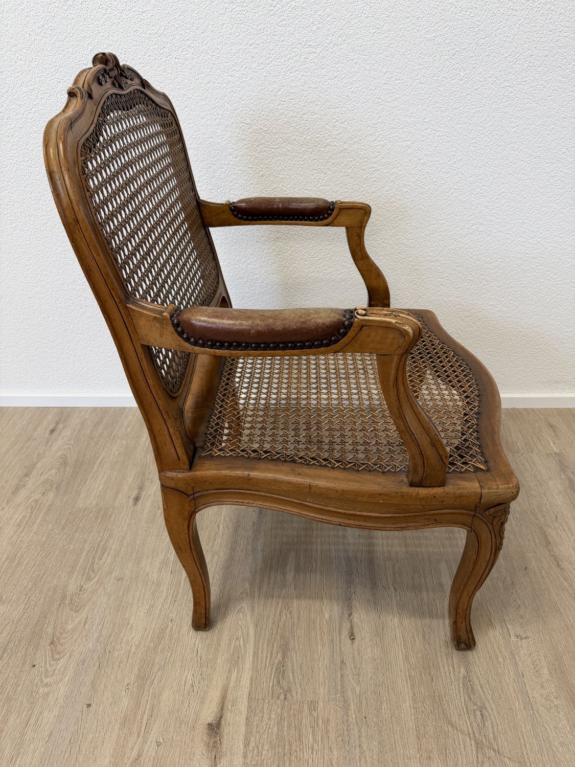 Antik Louis XV Cabriolet Sessel mit Wiener Geflecht und Leder, 18. Jahrhundert