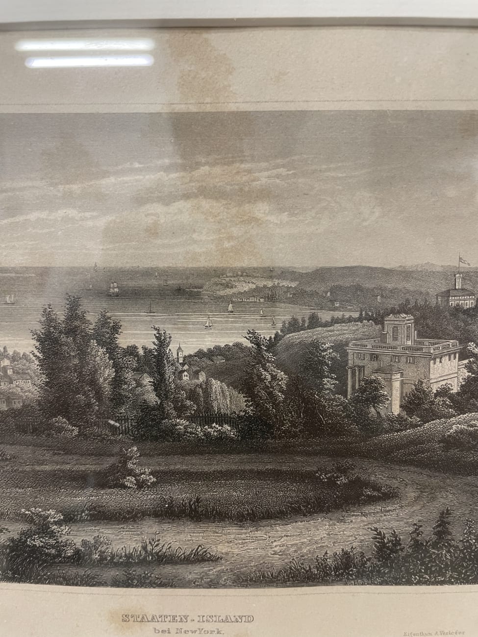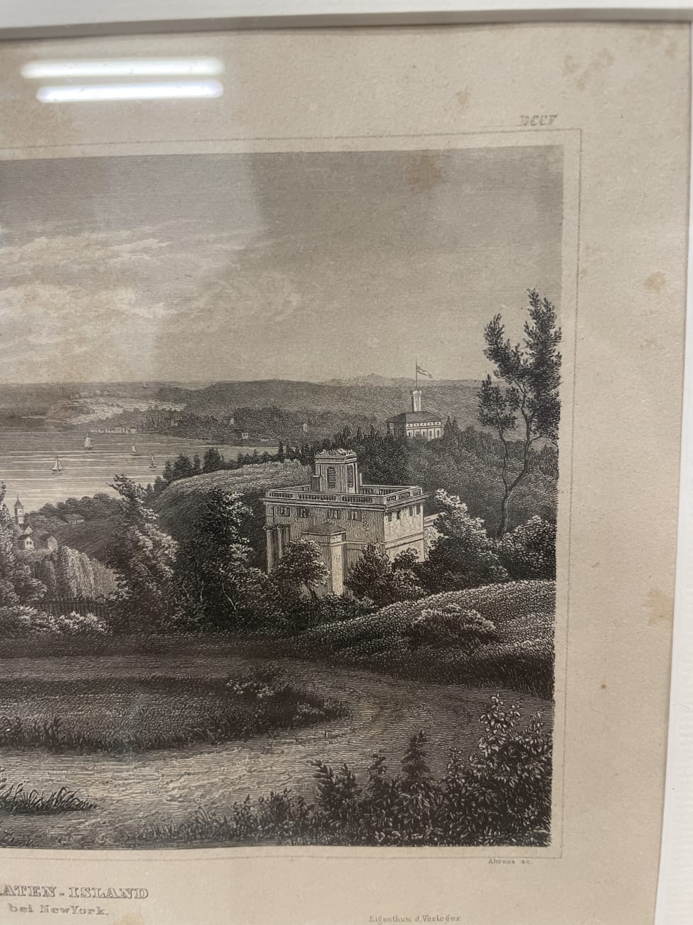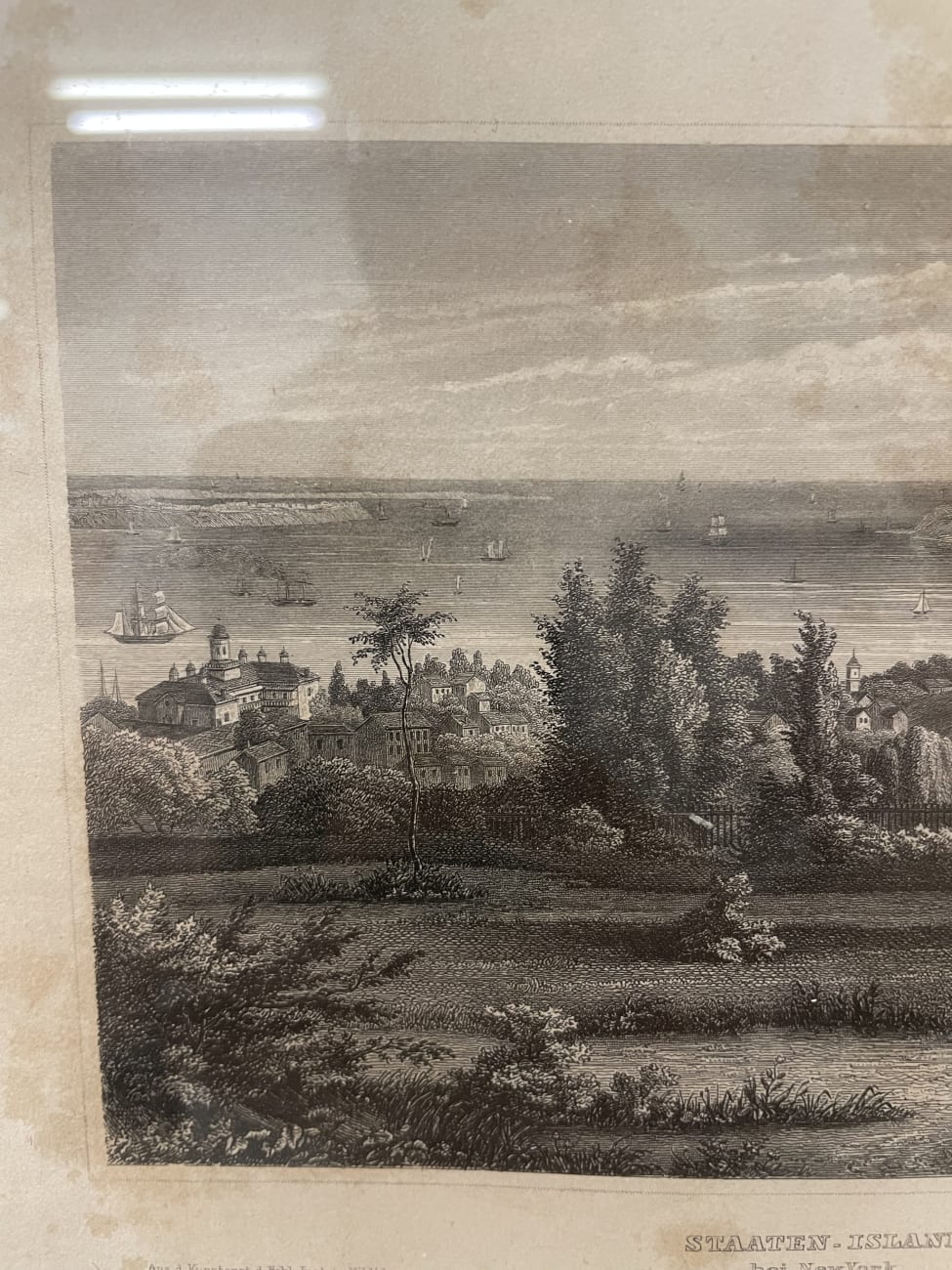 Feine Linien und eine ruhige Szenerie zeigen hier Staten Island bei New York in einer historischen Ansicht aus dem 19. Jahrhundert. Typisch für diese Zeit ist die detailreiche Darstellung von Architektur, Natur und Schifffahrt, alles sauber in feiner Stichtechnik umgesetzt. Unten beschriftet mit „Staaten-Island bei New York“, dazu Verlagsangaben, was auf einen originalen oder sehr frühen Druck hinweist. Sichtbar sind altersbedingte Patinaflecken im Papier, die dem Blatt einen authentischen, sammlertypischen Charakter geben. Gerahmt in einem schlichten Holzrahmen mit Passepartout, sofort bereit zum Aufhängen.