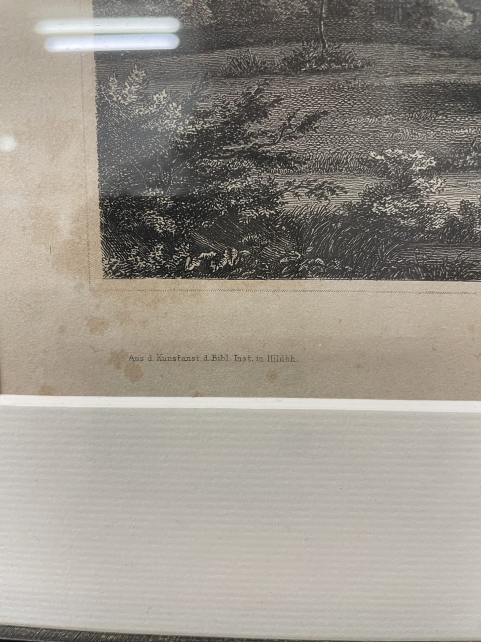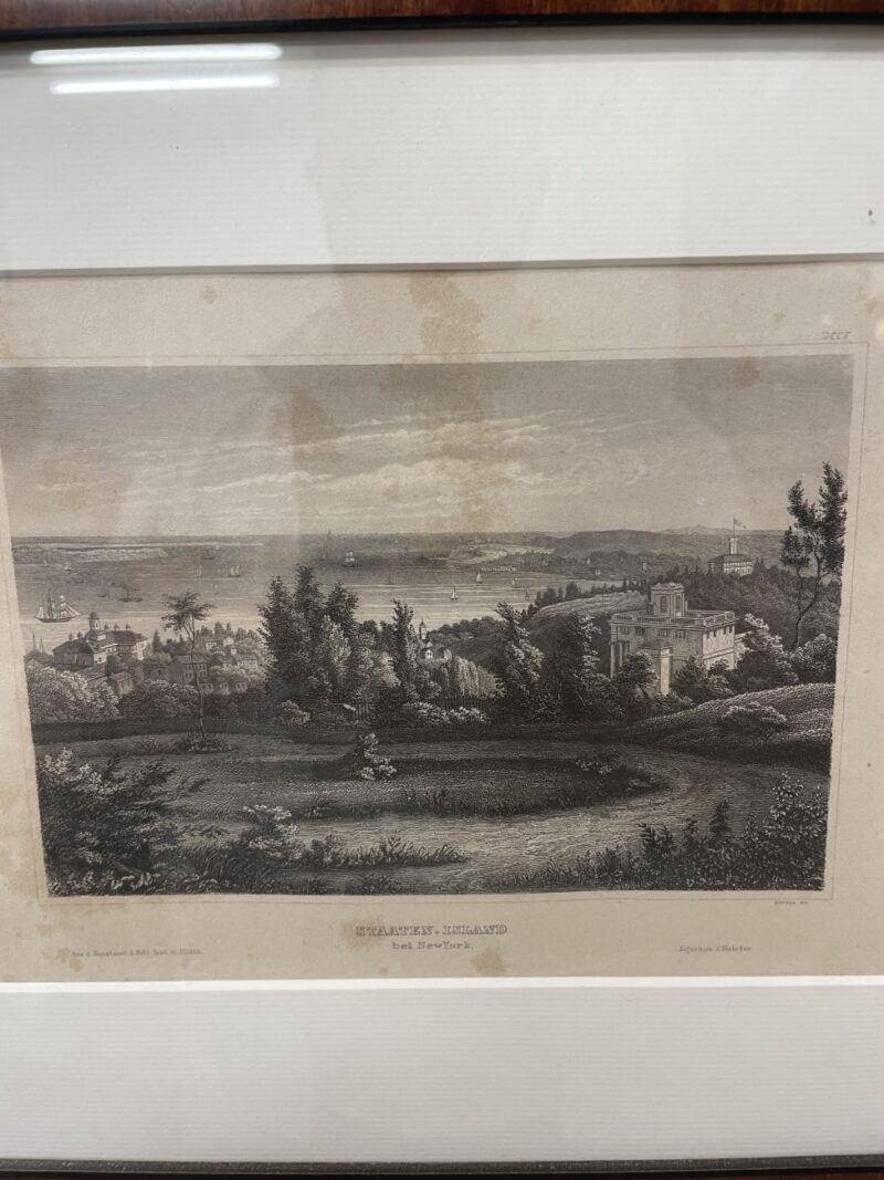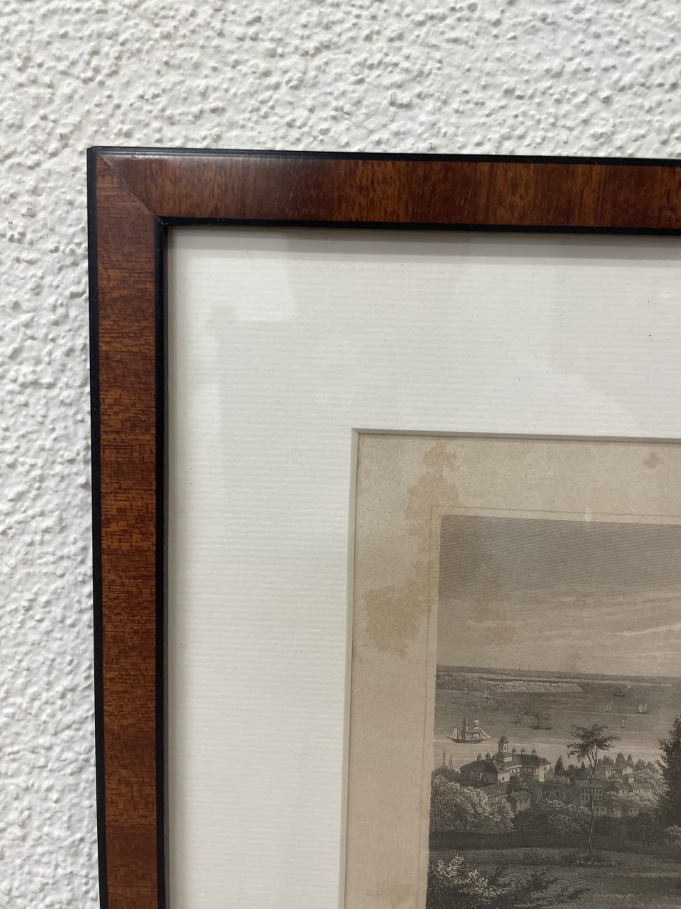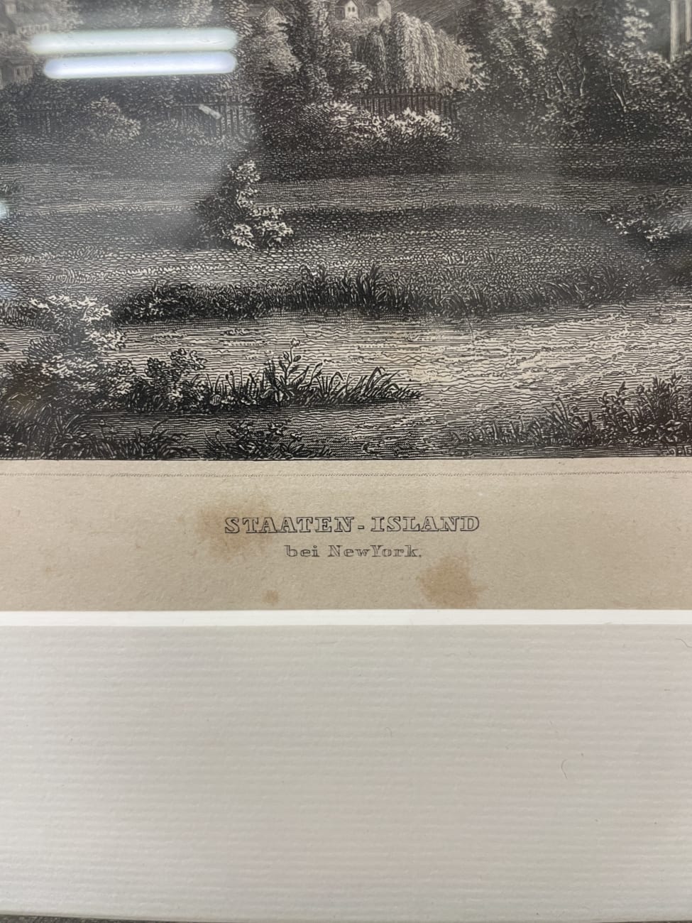 Feine Linien und eine ruhige Szenerie zeigen hier Staten Island bei New York in einer historischen Ansicht aus dem 19. Jahrhundert. Typisch für diese Zeit ist die detailreiche Darstellung von Architektur, Natur und Schifffahrt, alles sauber in feiner Stichtechnik umgesetzt. Unten beschriftet mit „Staaten-Island bei New York“, dazu Verlagsangaben, was auf einen originalen oder sehr frühen Druck hinweist. Sichtbar sind altersbedingte Patinaflecken im Papier, die dem Blatt einen authentischen, sammlertypischen Charakter geben. Gerahmt in einem schlichten Holzrahmen mit Passepartout, sofort bereit zum Aufhängen.