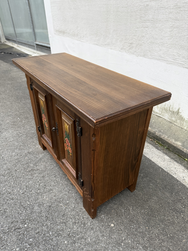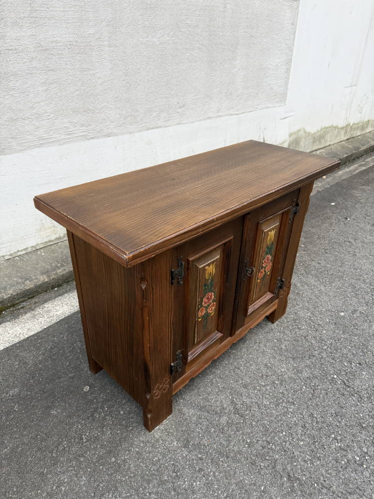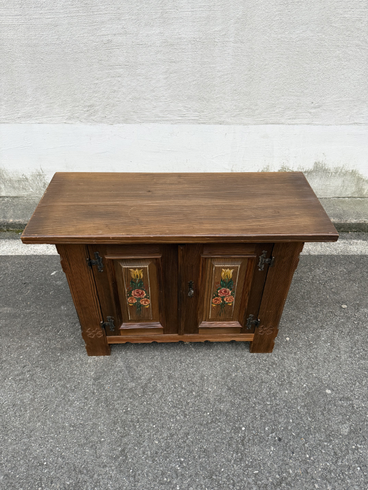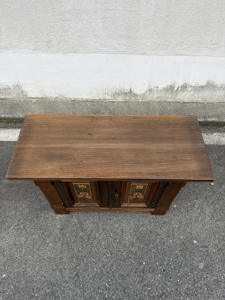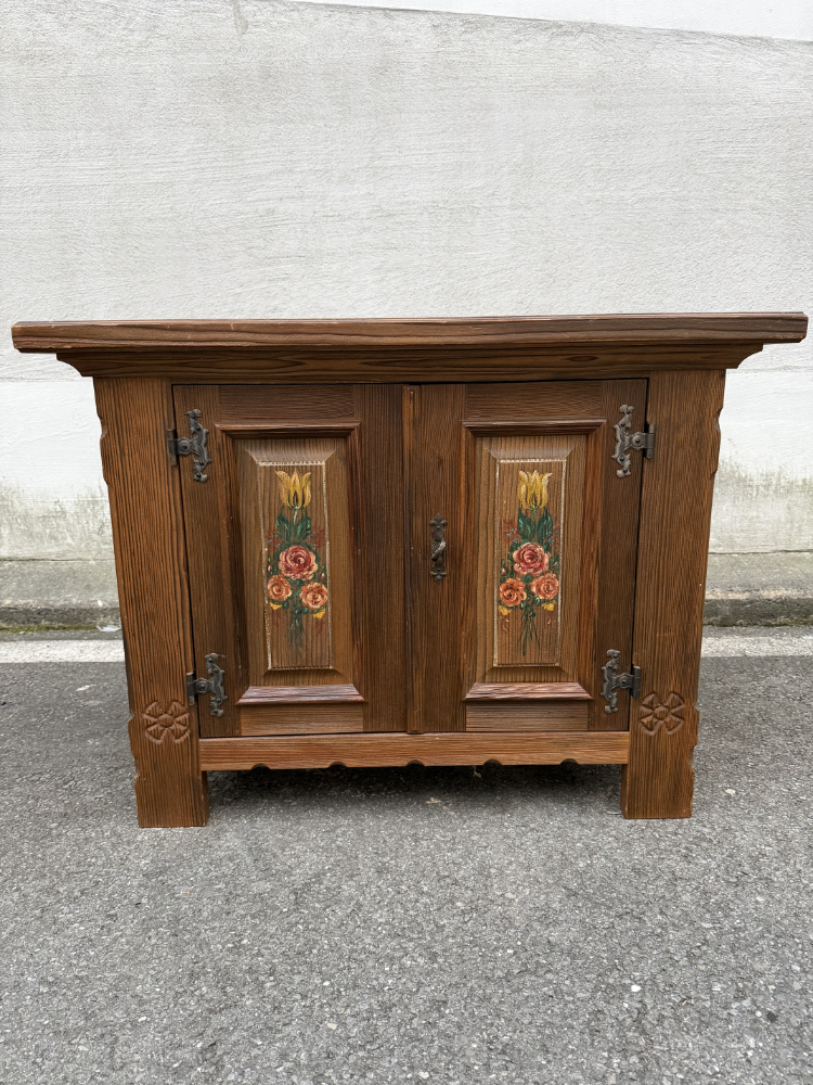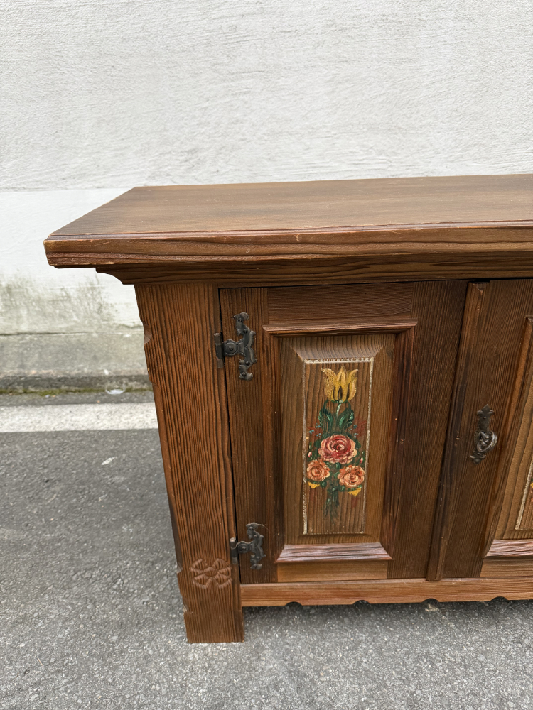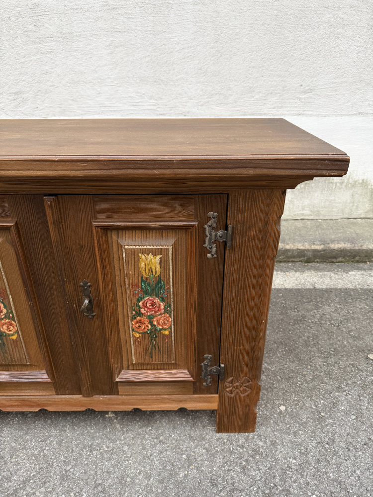 Diese charmante Anrichte aus massivem Tannenholz bringt alpines Flair und liebevolle Handwerkskunst in jeden Raum. Auf den beiden Türen sind farbenfrohe, handgemalte Blumenmotive zu sehen – jedes Stück ein Unikat mit rustikalem Charakter. Die natürliche Maserung des Holzes harmoniert wunderbar mit den geschmiedeten Metallbeschlägen und verleiht dem Möbel eine warme Ausstrahlung.