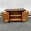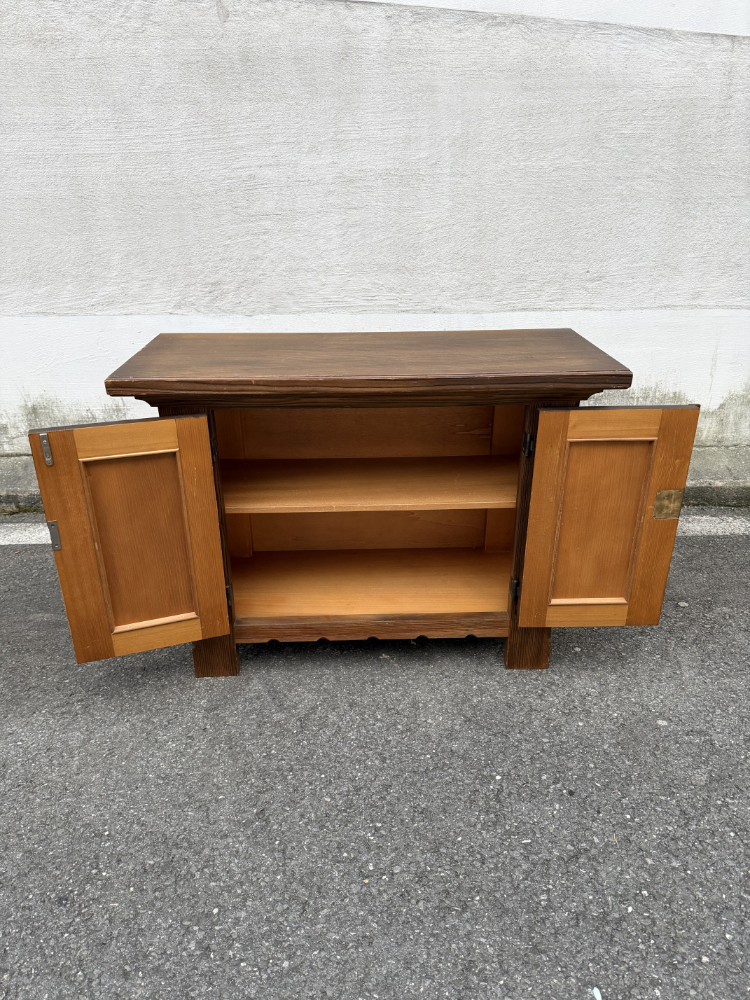 Hinter den Türen verbirgt sich ein praktischer Stauraum mit Einlegeboden, ideal zur Aufbewahrung von Geschirr, Textilien oder Dekoration. Ob im Eingangsbereich, Esszimmer oder Chalet-Interior – dieses Möbelstück verbindet Funktionalität mit traditioneller Gemütlichkeit und zeitlosem Stil.