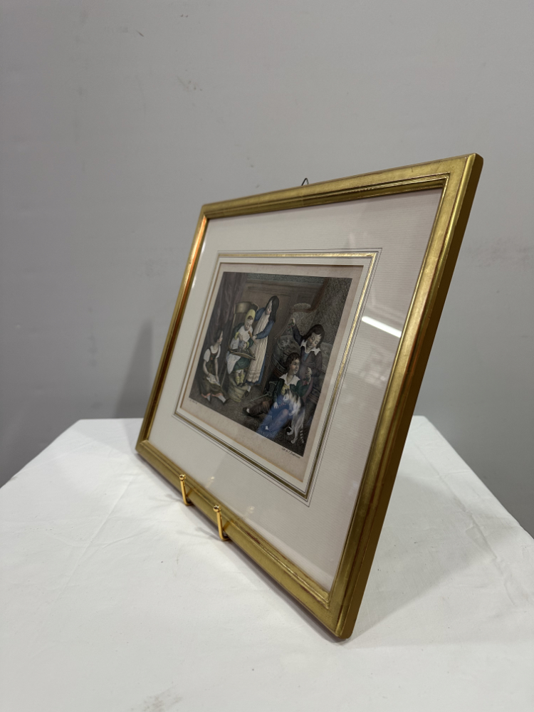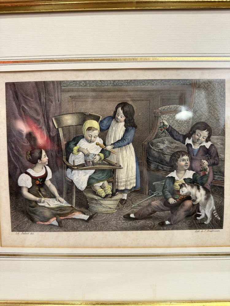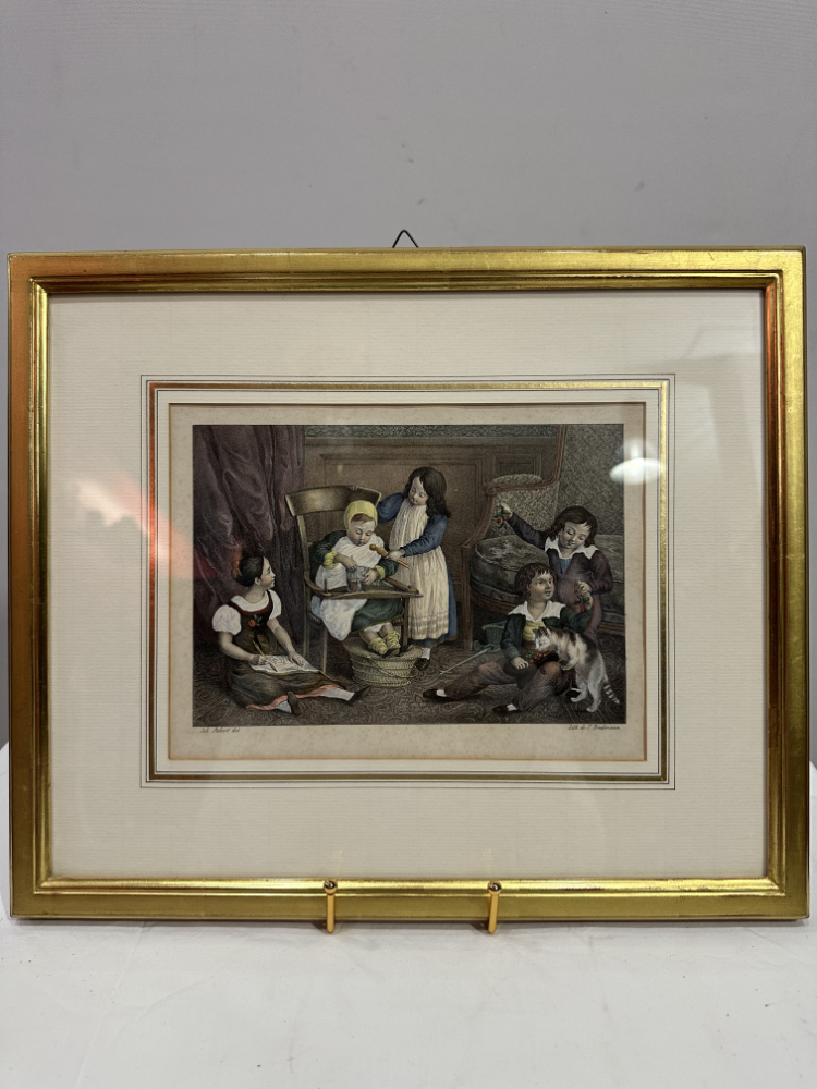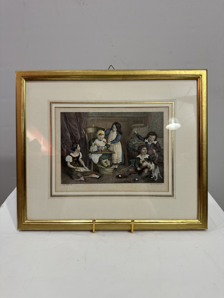 Das Blatt zeigt eine häusliche Szene mit spielenden Kindern, liebevoll koloriert und mit feinen Details ausgearbeitet – ein typisches Motiv der Biedermeierzeit. Die ruhige, harmonische Komposition und der ausgezeichnete Erhaltungszustand machen diese Lithografie zu einem eindrucksvollen Beispiel der frühen Farblithografie aus dem 19. Jahrhundert.