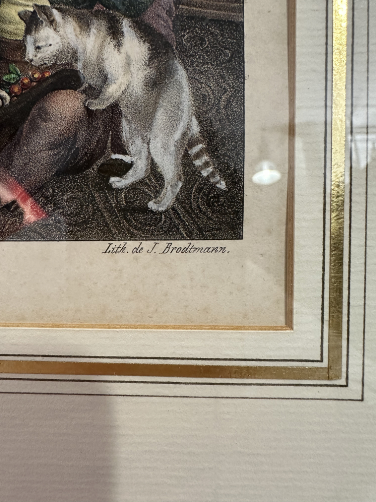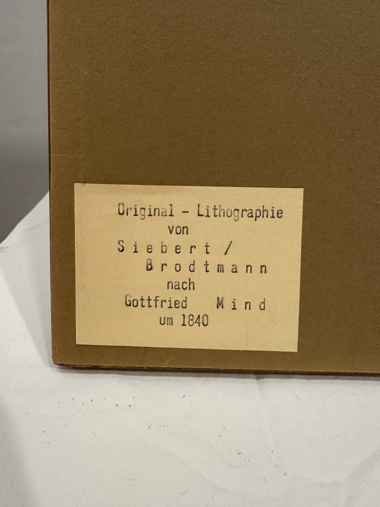 Diese kolorierte Original-Lithografie um 1840 stammt von den Künstlern Johann Siebert (del.) und Joseph Brodtmann (lith.) nach einer Vorlage von Gottfried Mind (1768–1814) – dem bekannten Schweizer Maler, der wegen seiner liebevollen Tier- und Kinderdarstellungen als „Katze-Mind“ in die Kunstgeschichte eingegangen ist.