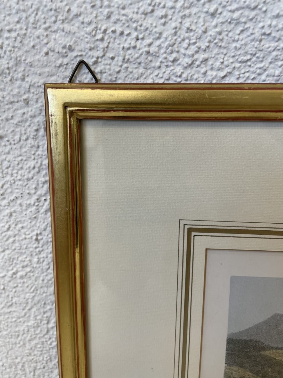 Die feine Linienarbeit der Lithografie zeigt viele Details der damaligen Stadt und Landschaft. Figuren, Gebäude und Berge sind sorgfältig ausgearbeitet und anschliessend von Hand koloriert. Der Druck ist in einem goldfarbenen Rahmen mit Passepartout gefasst und wirkt dadurch ruhig und elegant an der Wand.