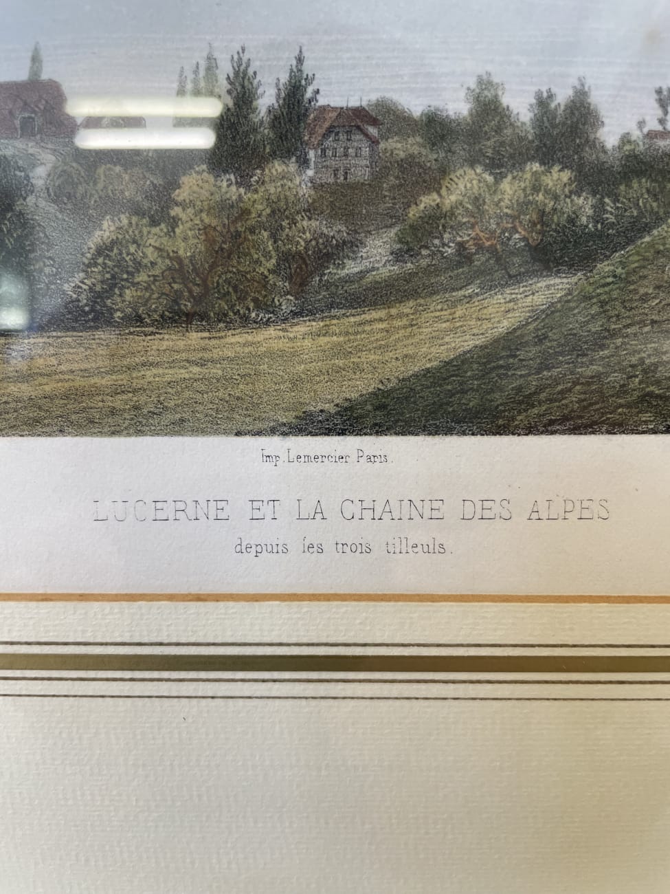 Feine historische Stadtansicht von Luzern mit Blick über den Vierwaldstaettersee und die Alpenkette. Die Darstellung zeigt Luzern aus erhöhter Perspektive mit See, Bergen und kleinen Alltagsszenen im Vordergrund. Gedruckt wurde das Blatt bei Lemercier in Paris, gestaltet und lithografiert von J. Jacottet, einem bekannten Landschaftszeichner des 19. Jahrhunderts. Die Beschriftung lautet „Lucerne et la chaine des Alpes depuis les trois tilleuls“. Solche Ansichten waren im 19. Jahrhundert sehr beliebt bei Reisenden der Schweiz und gelten heute als dekorative historische Stadtansichten.