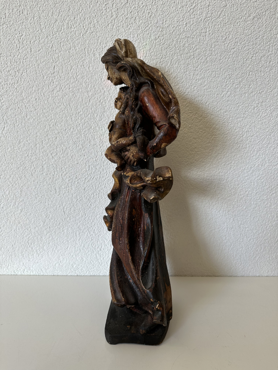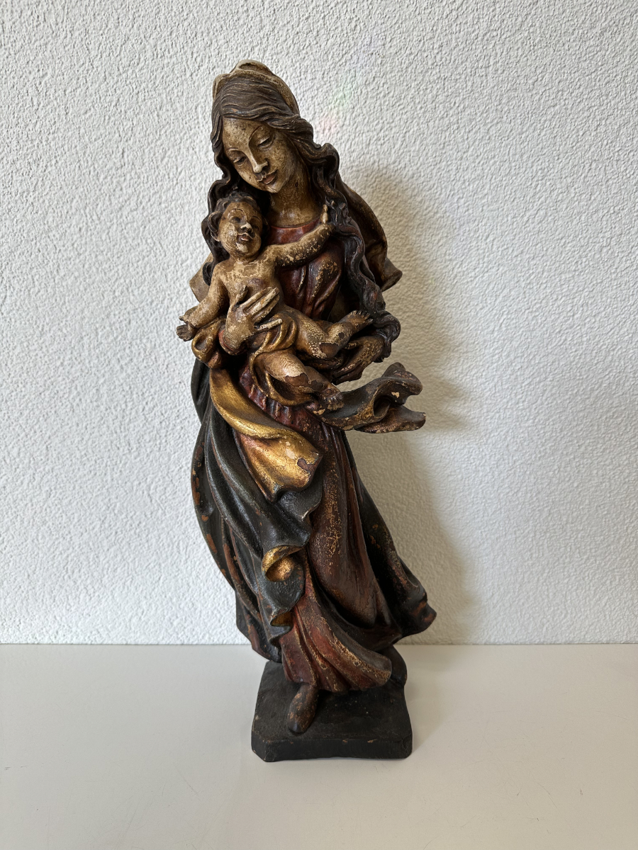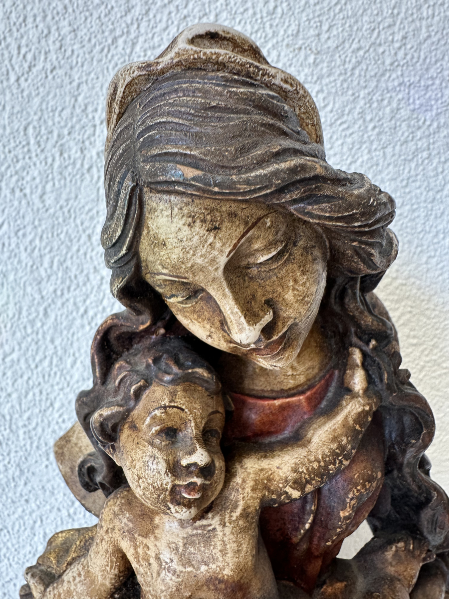 Fein geschnitztes Holz, ausdrucksstarke Gesichter und ein Gewand, das wirkt wie in Bewegung. Diese Madonna mit Kind ist eine klassische sakrale Figur, vermutlich aus dem 18. bis 19. Jahrhundert. Besonders schön sind die weich modellierten Haare, die sanfte Kopfhaltung und die lebendige Darstellung des Jesuskindes mit erhobenem Arm.