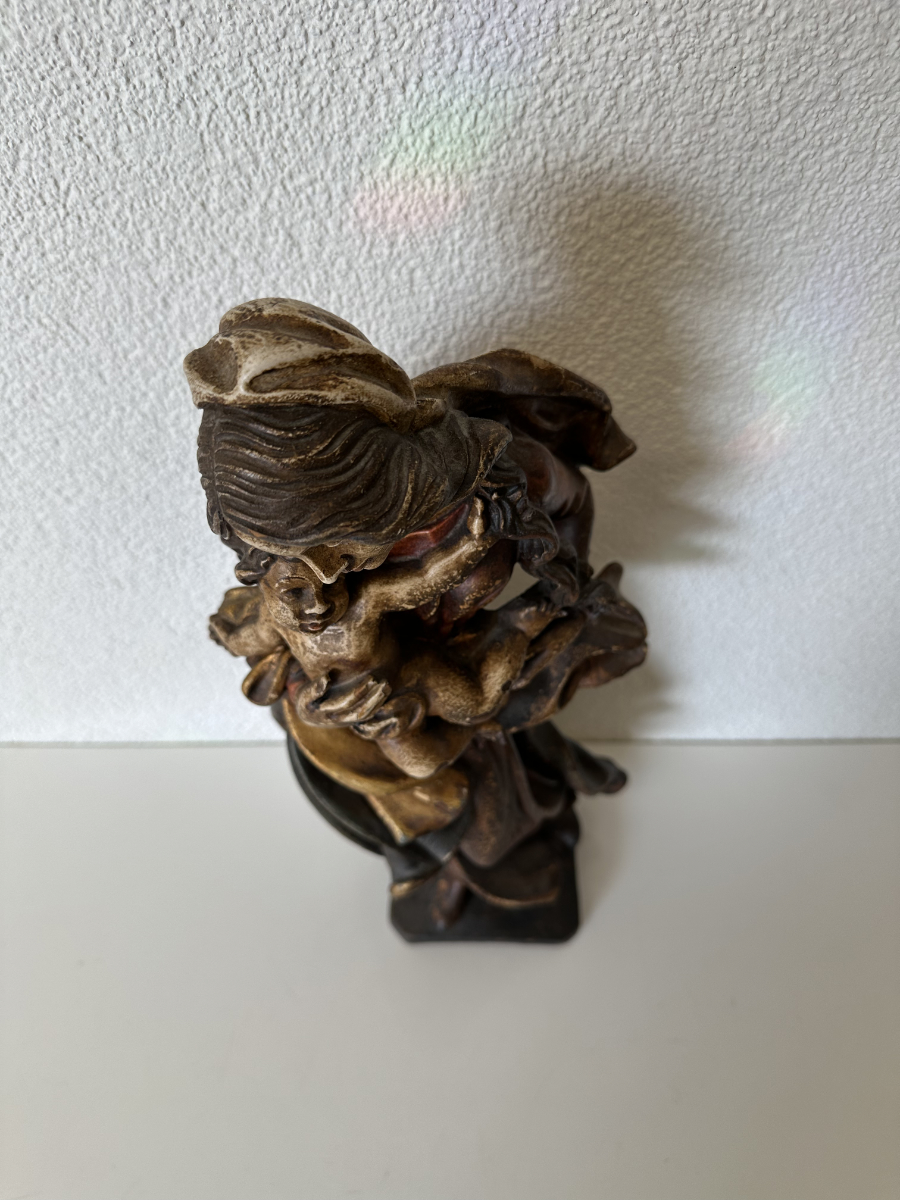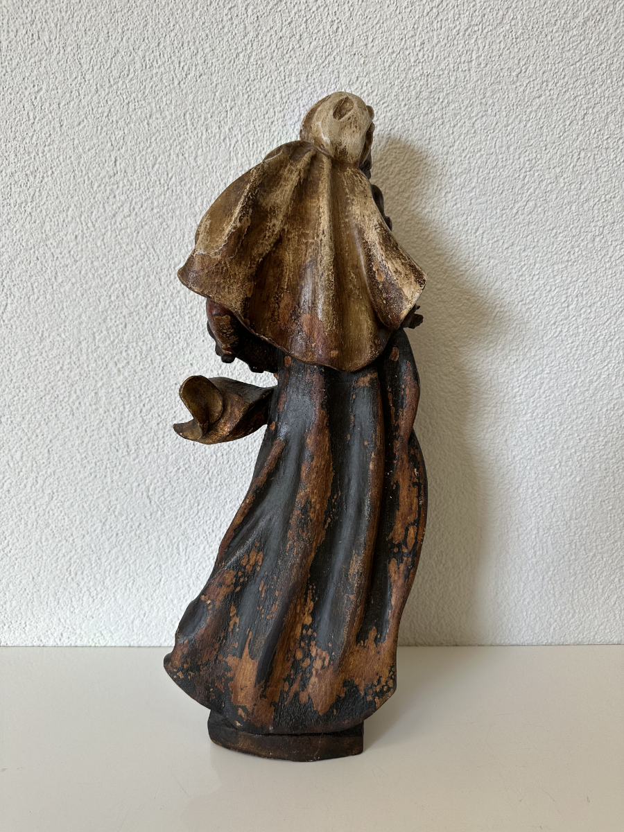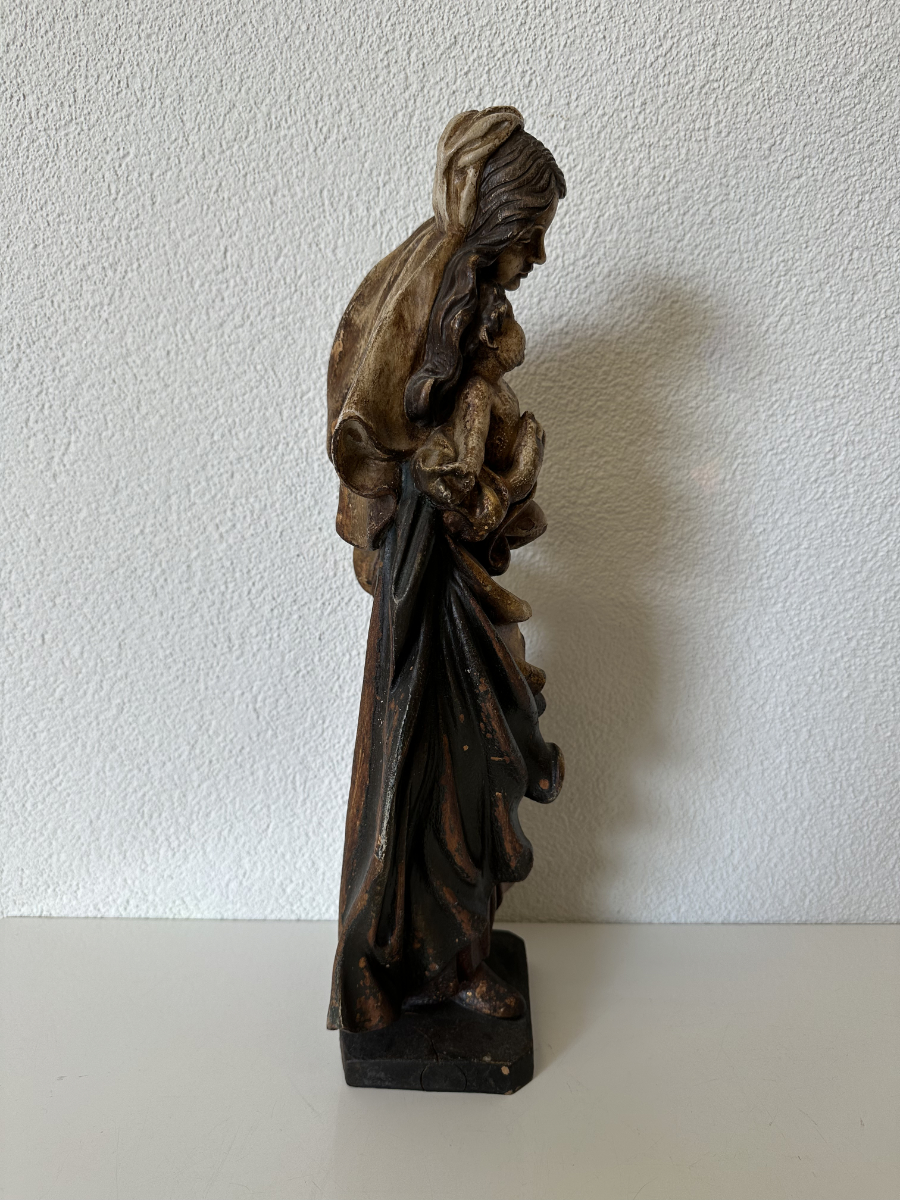 Fein geschnitztes Holz, ausdrucksstarke Gesichter und ein Gewand, das wirkt wie in Bewegung. Diese Madonna mit Kind ist eine klassische sakrale Figur, vermutlich aus dem 18. bis 19. Jahrhundert. Besonders schön sind die weich modellierten Haare, die sanfte Kopfhaltung und die lebendige Darstellung des Jesuskindes mit erhobenem Arm.