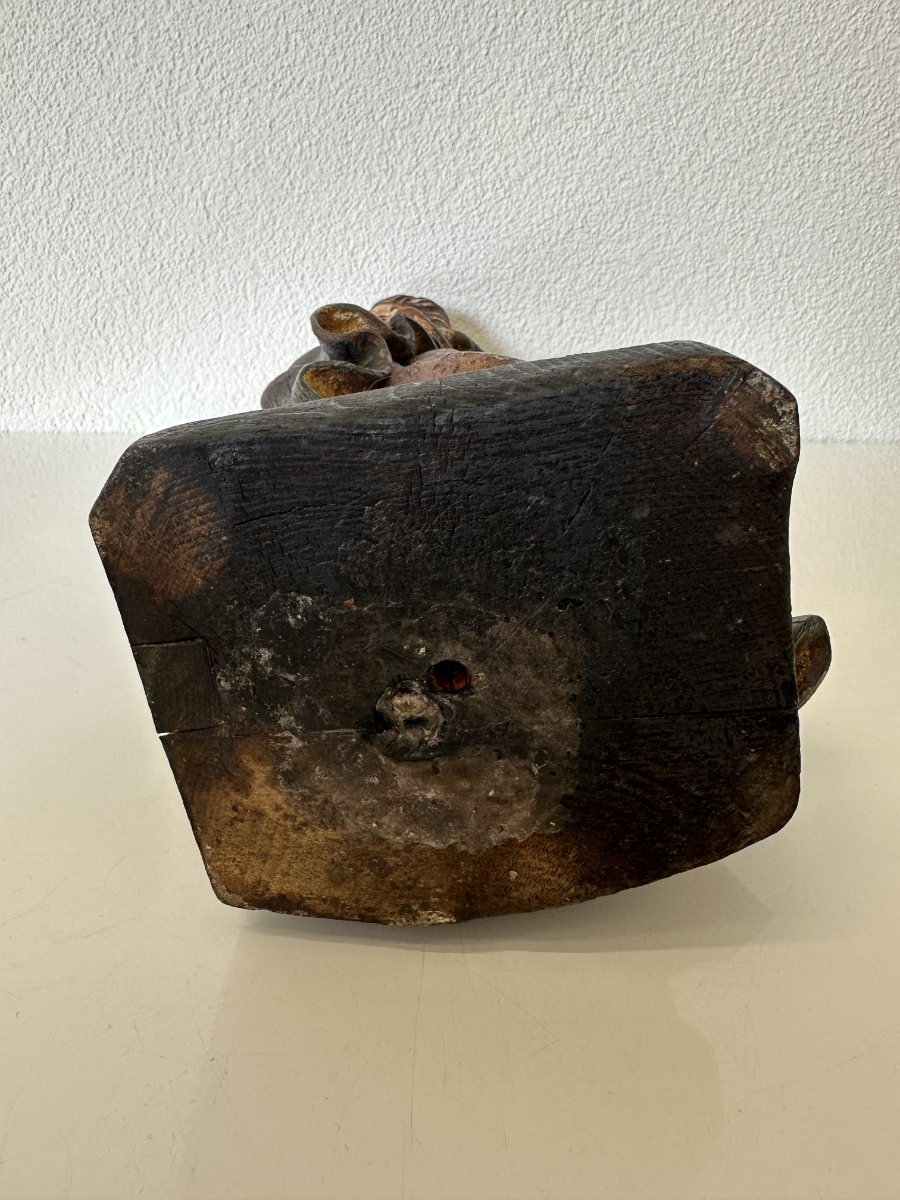 Die originale Farbfassung ist noch deutlich sichtbar: warme Goldtöne, Rotbraun und dunkle Blau-Schwarz-Nuancen im Mantel. Altersbedingte Abriebspuren und Patina gehören hier klar dazu und machen den Charakter der Figur aus. Auch der Sockel zeigt Spuren der Zeit und eine schöne dunkle Oberfläche.