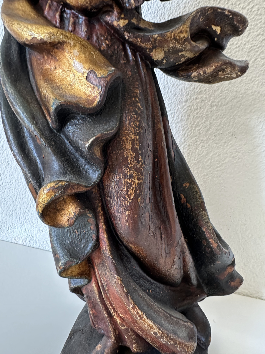Eine Figur, die nicht nur religiös wirkt, sondern auch als historisches Dekostück eine starke Präsenz im Raum hat.