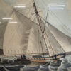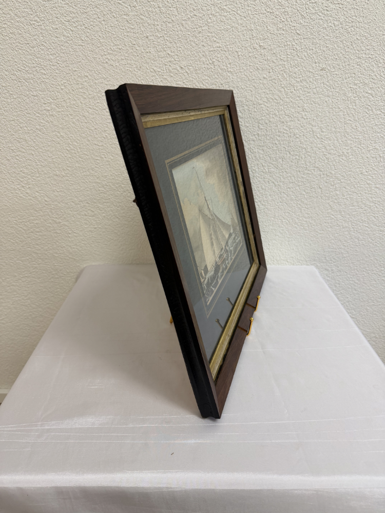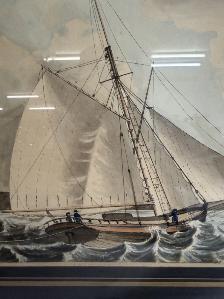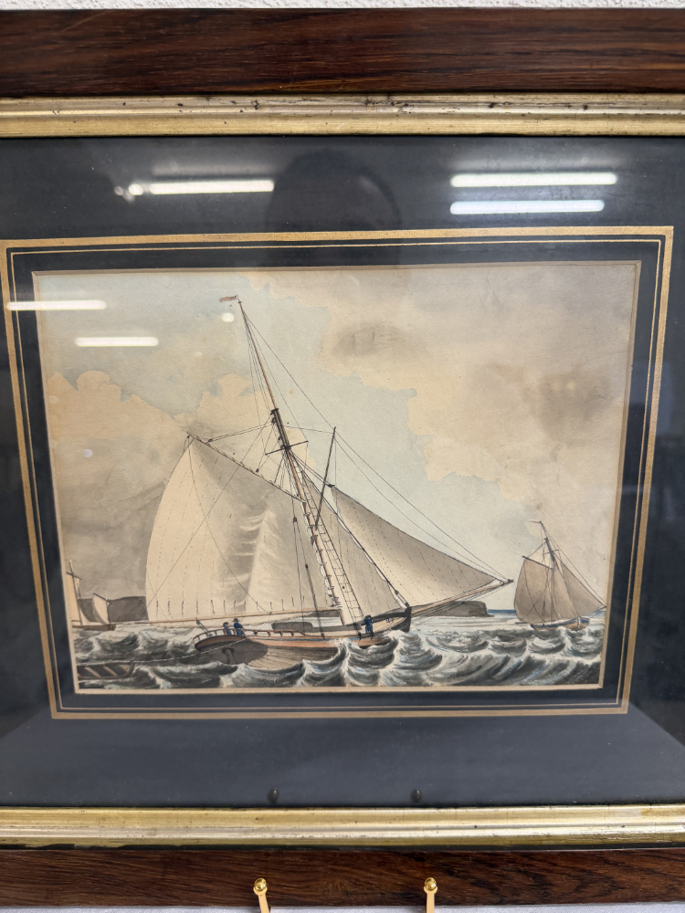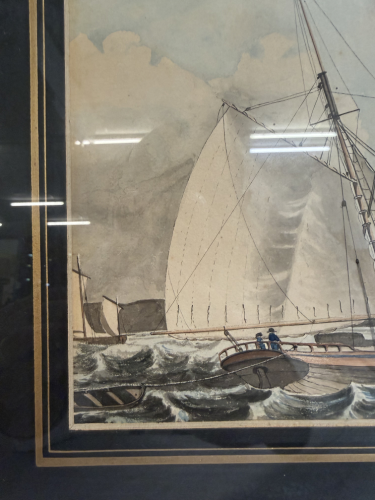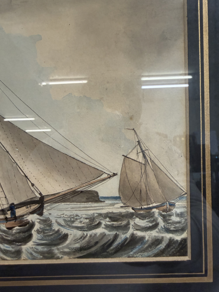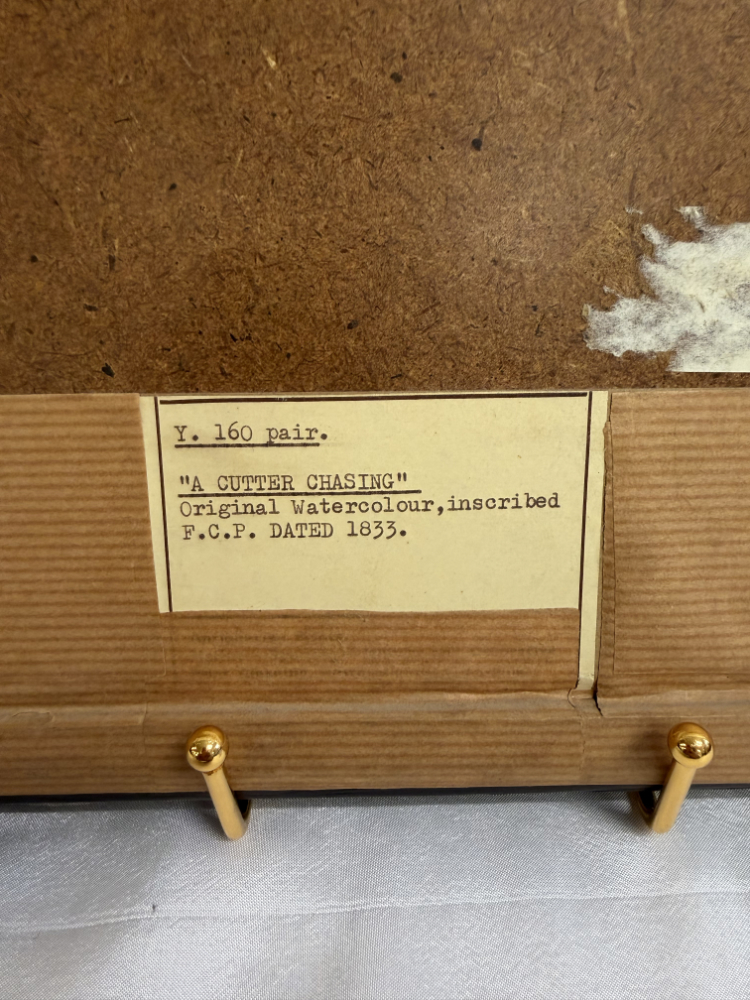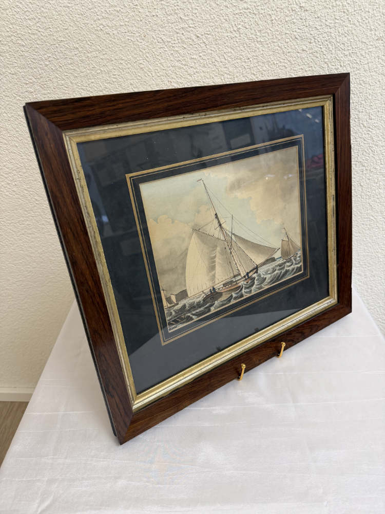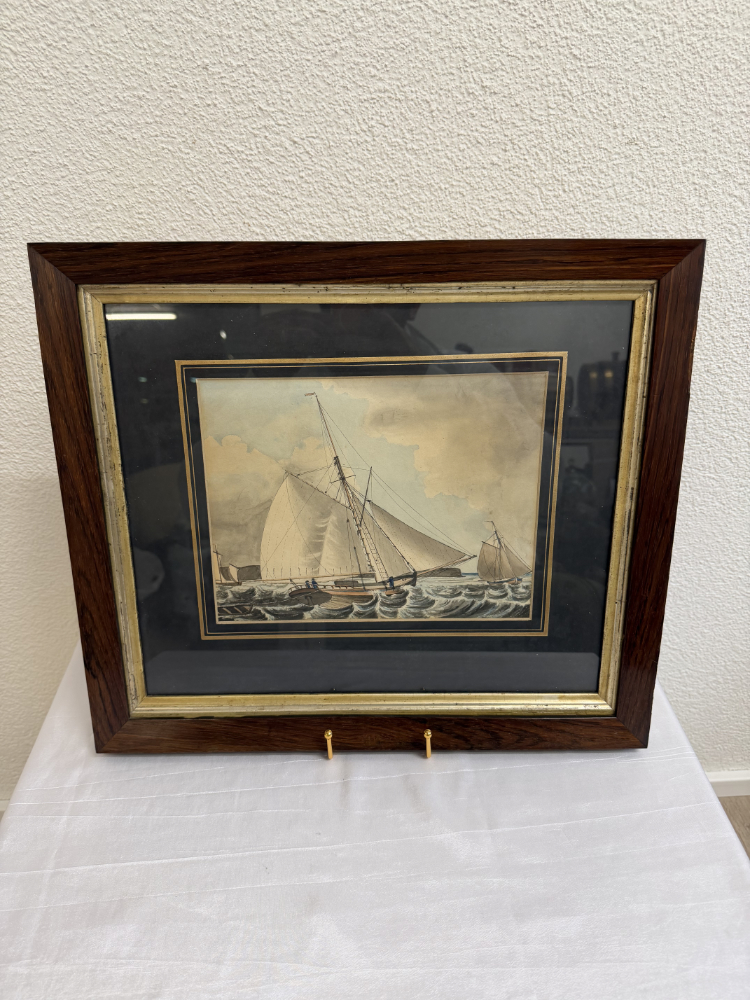 Segel im Wind, bewegte See und präzise Linienführung prägen diese fein ausgearbeitete maritime Darstellung aus dem Jahr 1833. Das Motiv zeigt einen schnellen Cutter in Verfolgungsszene auf offener See, ergänzt durch weitere Segelschiffe im Hintergrund. Die Darstellung verbindet zeichnerische Genauigkeit mit sanfter Farbigkeit und vermittelt eindrücklich die Dynamik der damaligen Seefahrt. Auf der Rückseite ist das Werk eindeutig bezeichnet als „Original Watercolour, inscribed, F.C.P. dated 1833“, was auf eine originale, zeitgenössische Aquarellarbeit hinweist. Gerahmt ist das Bild in einem dunklen Holzrahmen mit goldfarbener Innenleiste und breitem, dunklem Passepartout, das die Wirkung des Motivs zusätzlich verstärkt.