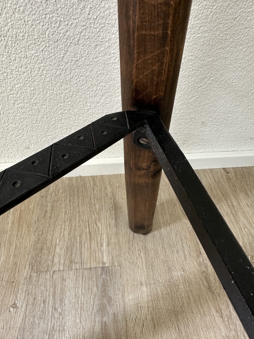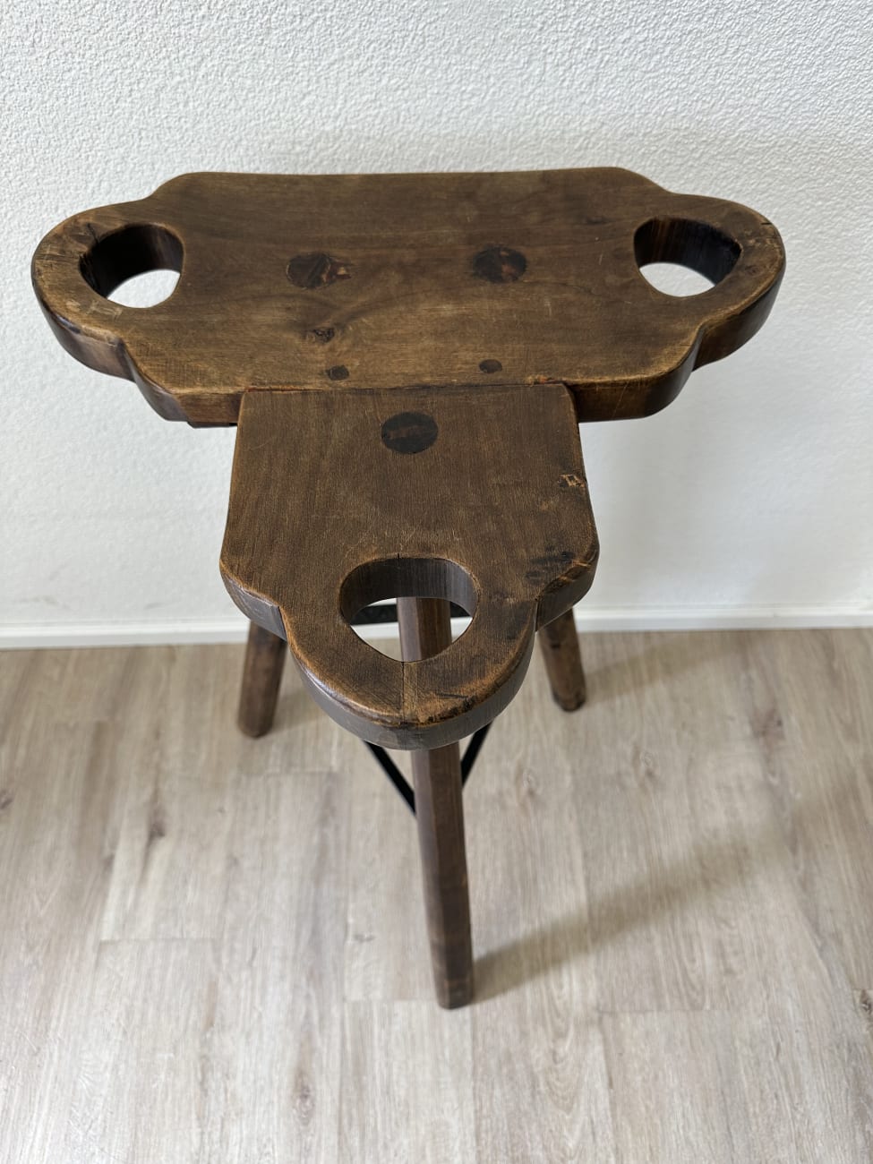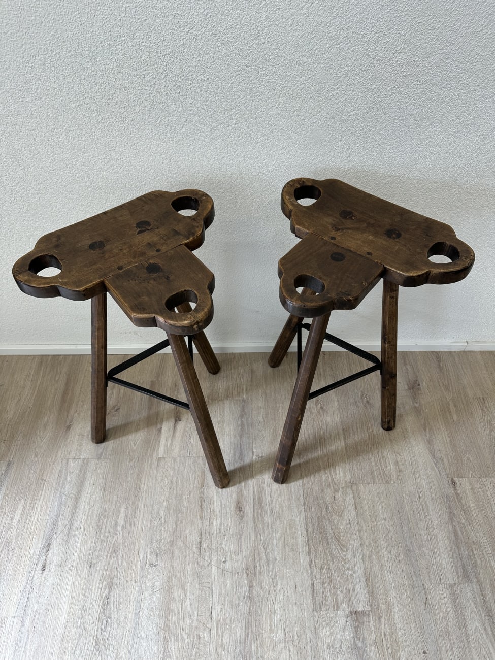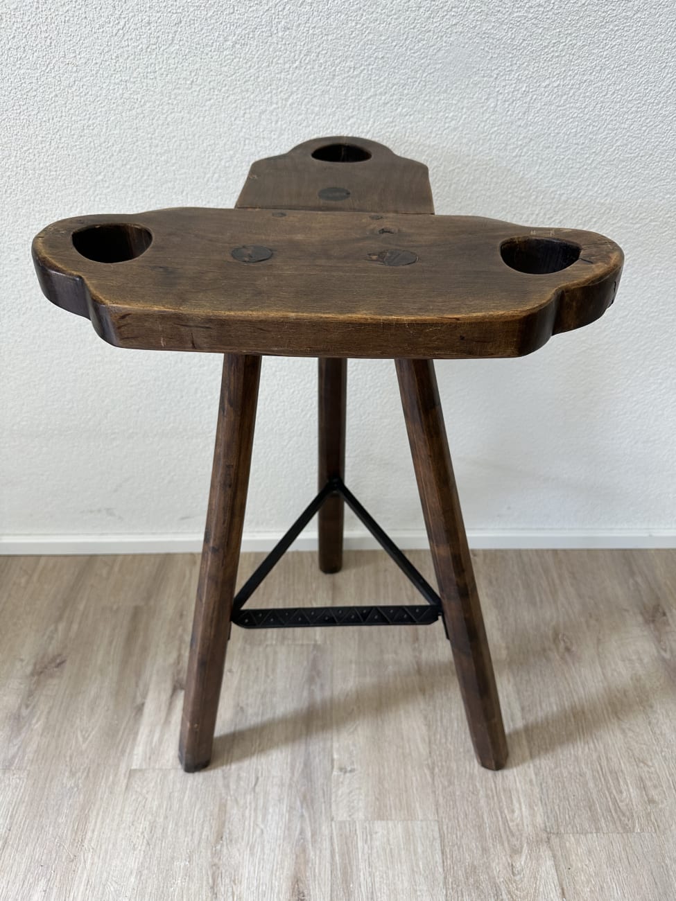 Innen bietet die Bar praktische Ablageflächen und mehrere kleine Fächer. Gläser, Flaschen oder Zubehör lassen sich gut verstauen. Die beiden passenden Hocker bestehen ebenfalls aus massivem Holz, mit stabiler Dreibein-Konstruktion und Metallverstrebung für sicheren Stand.