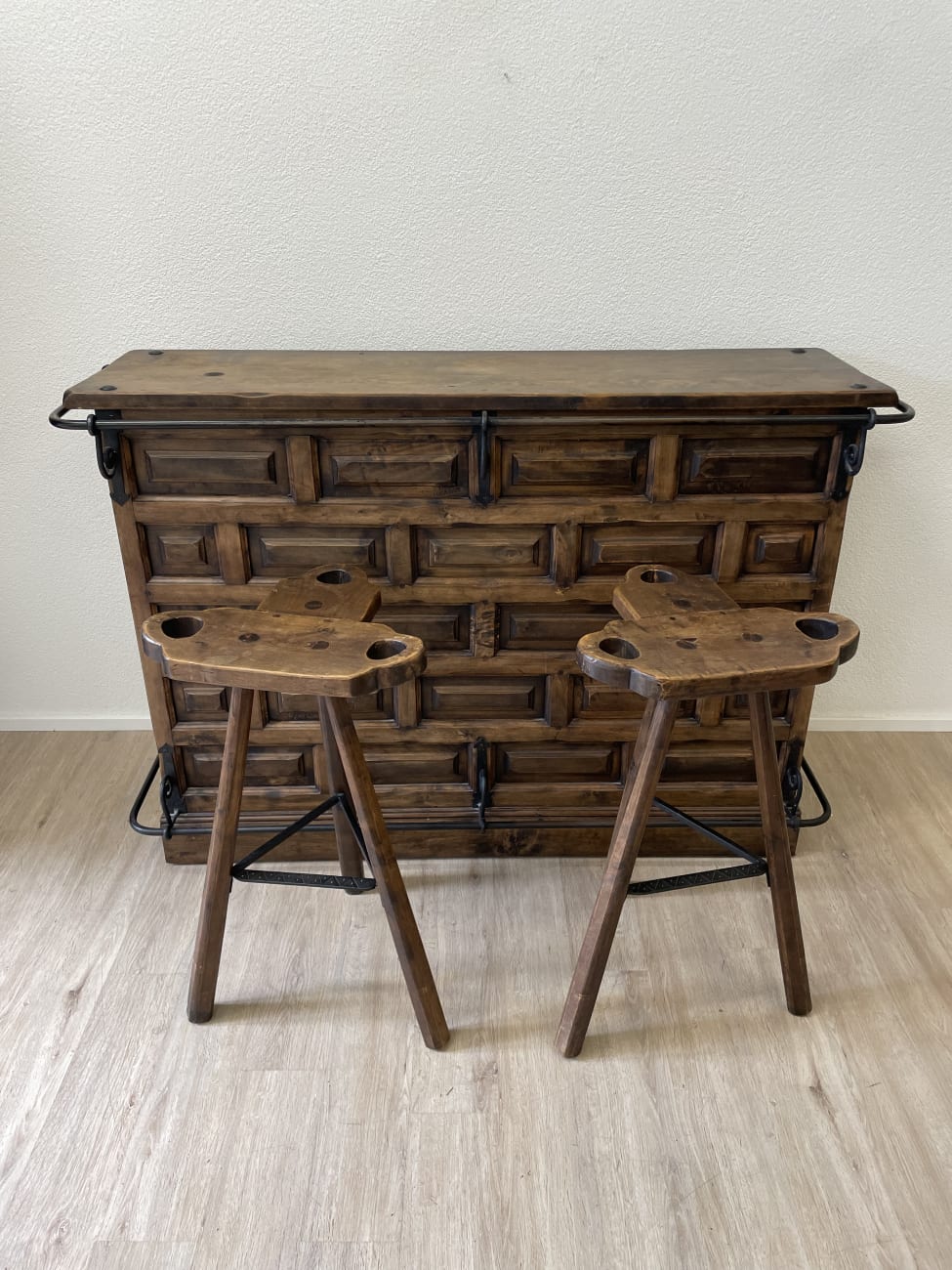 Antike spanische Bar-Set mit 2 Barhockern aus Massivholz