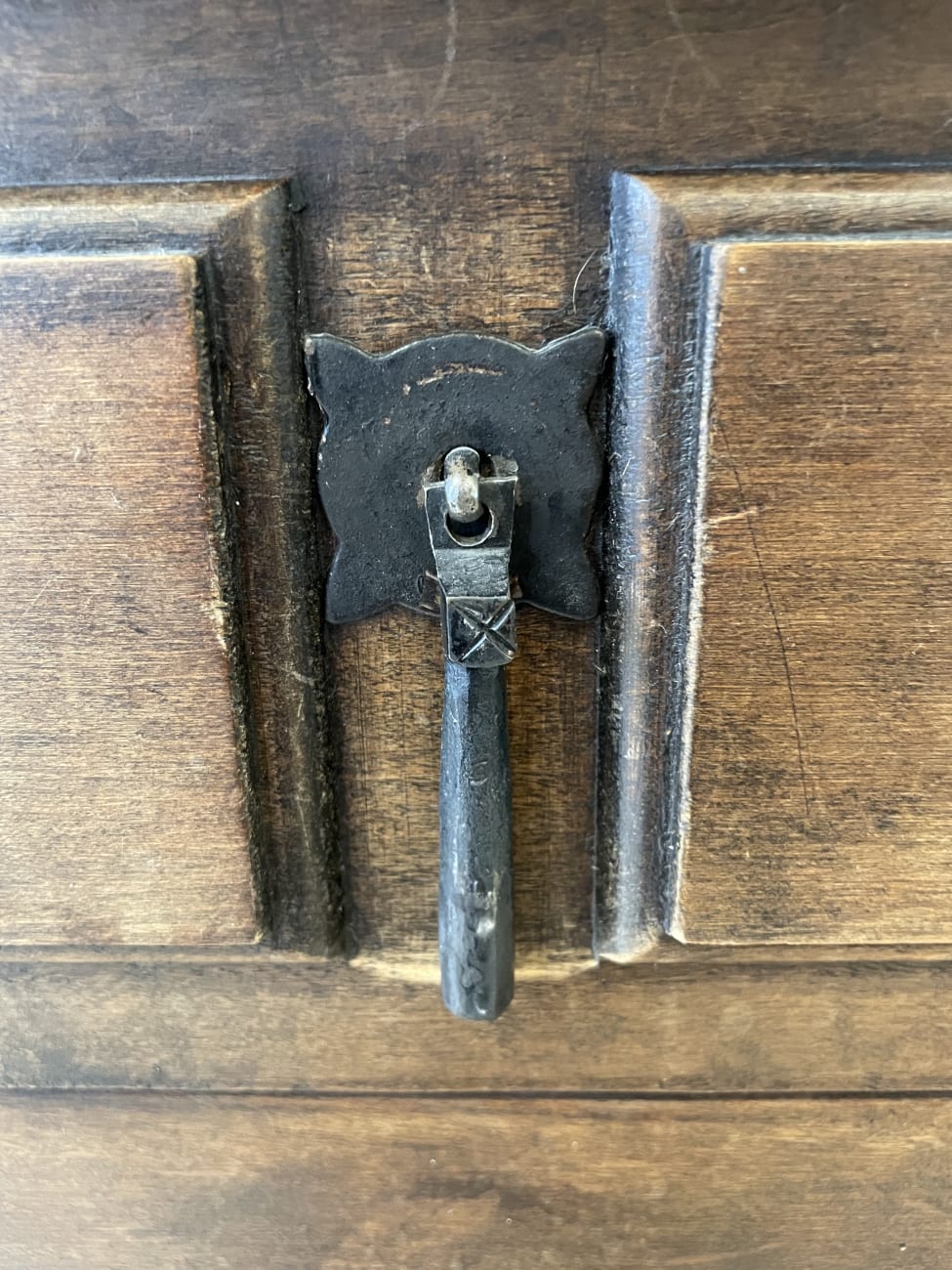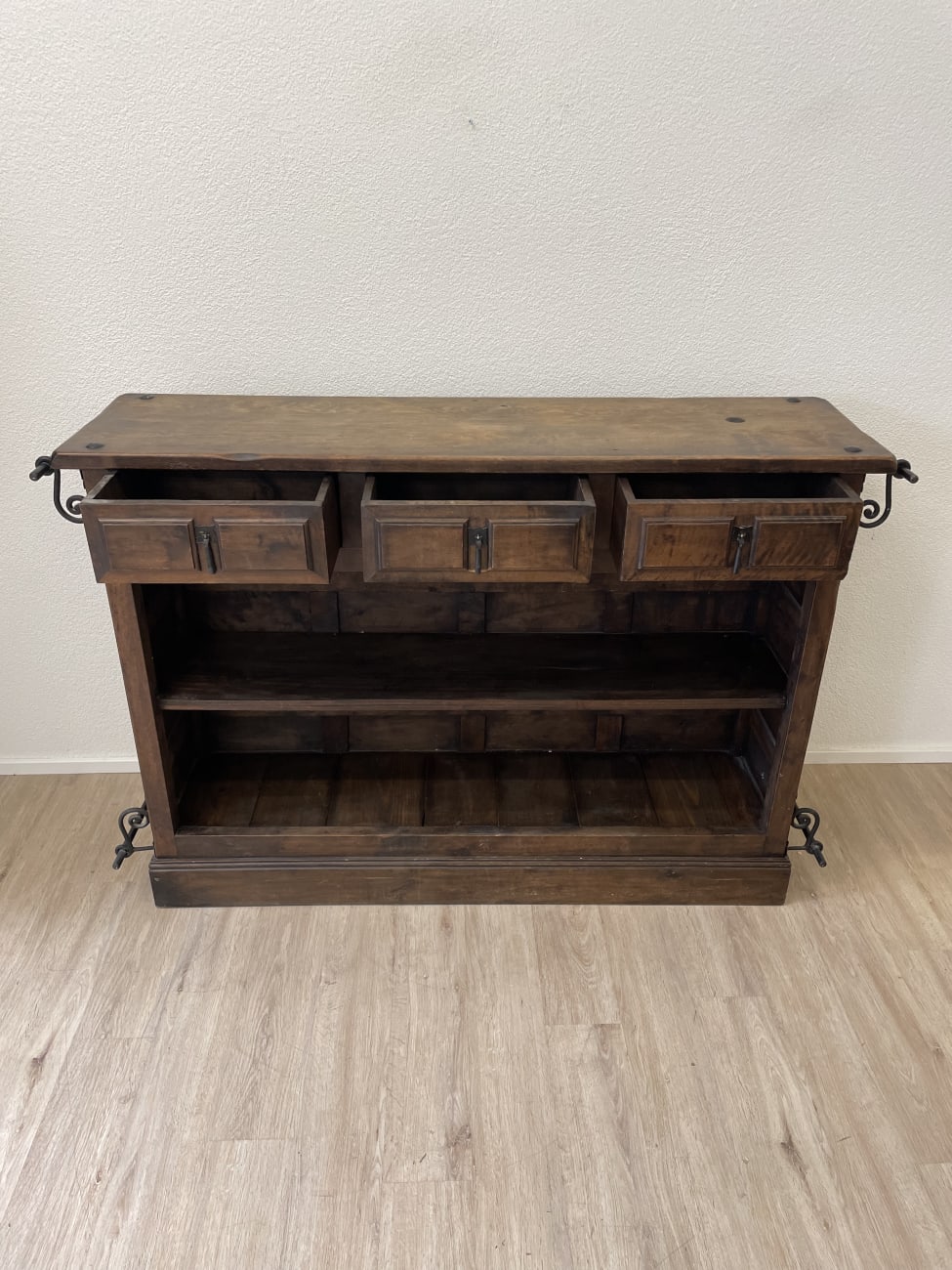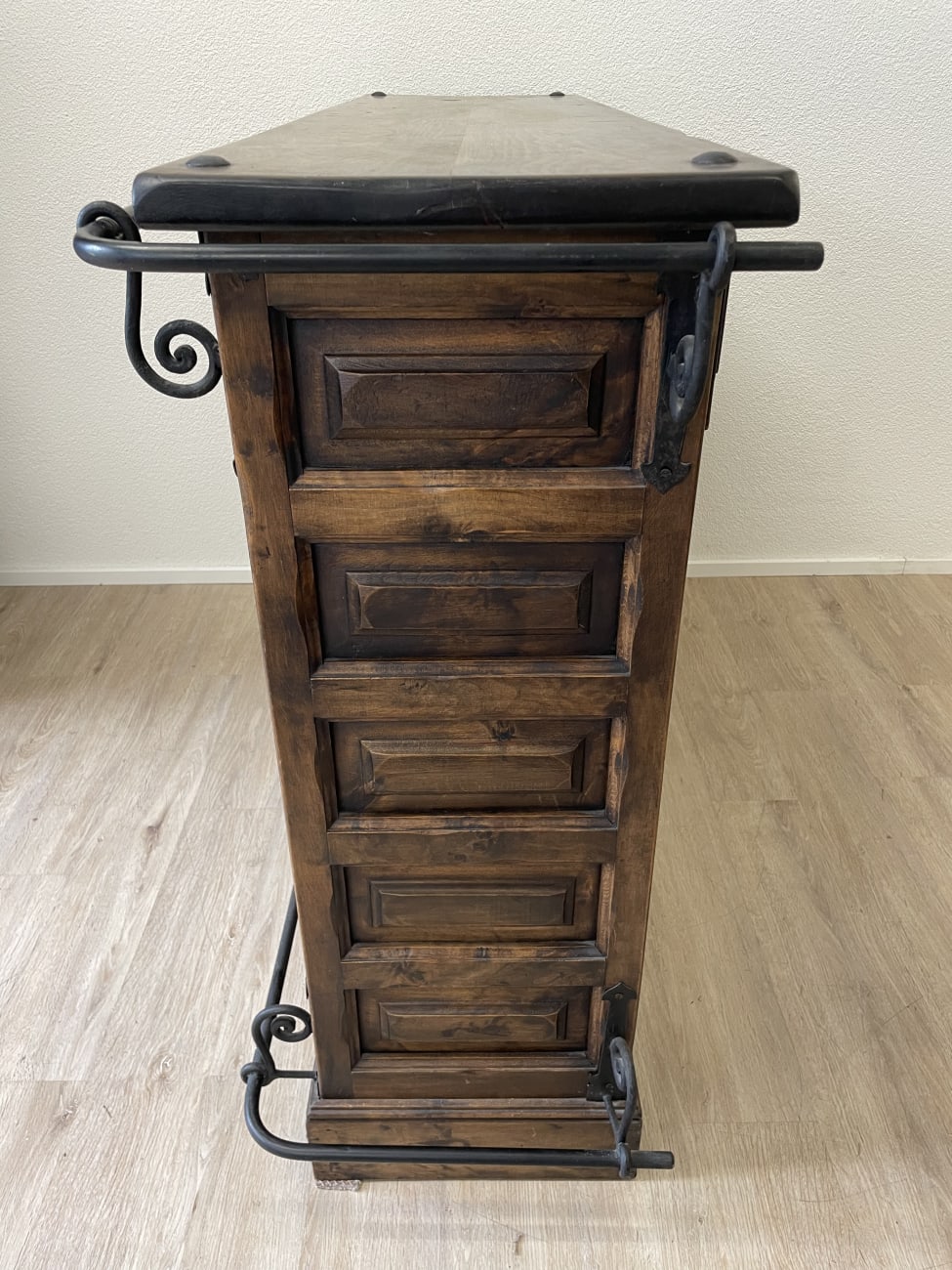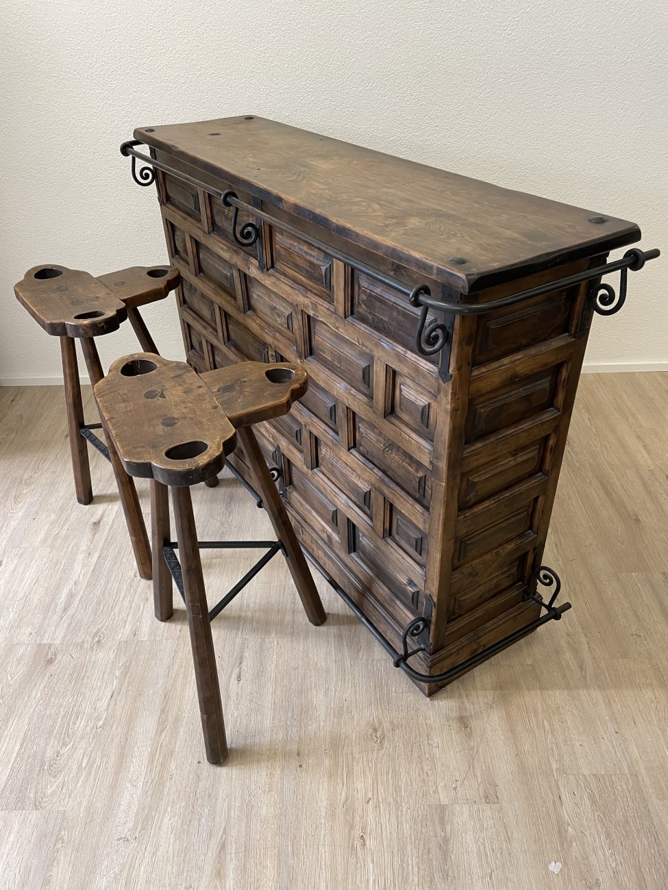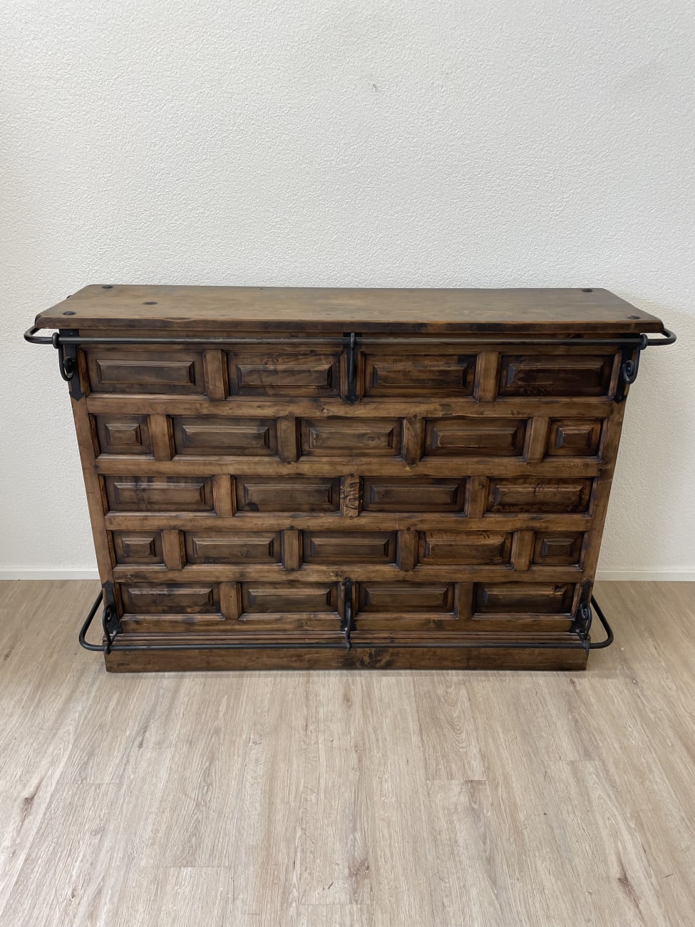 Kräftiges Massivholz, dunkle Beize und typische Schmiedeeisen-Elemente zeigen klar den spanischen Stil dieser Bar. Die Front ist mit vielen kleinen Kassetten gearbeitet und wirkt handwerklich und massiv. Eisenbügel und Beschläge geben dem Möbel zusätzlich Stabilität und einen rustikalen Charakter.