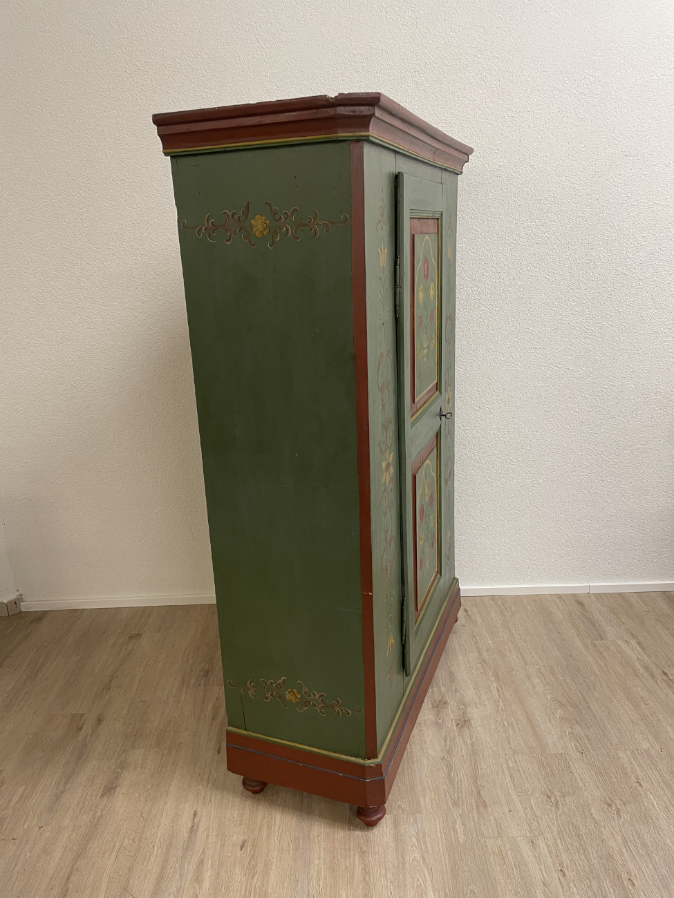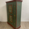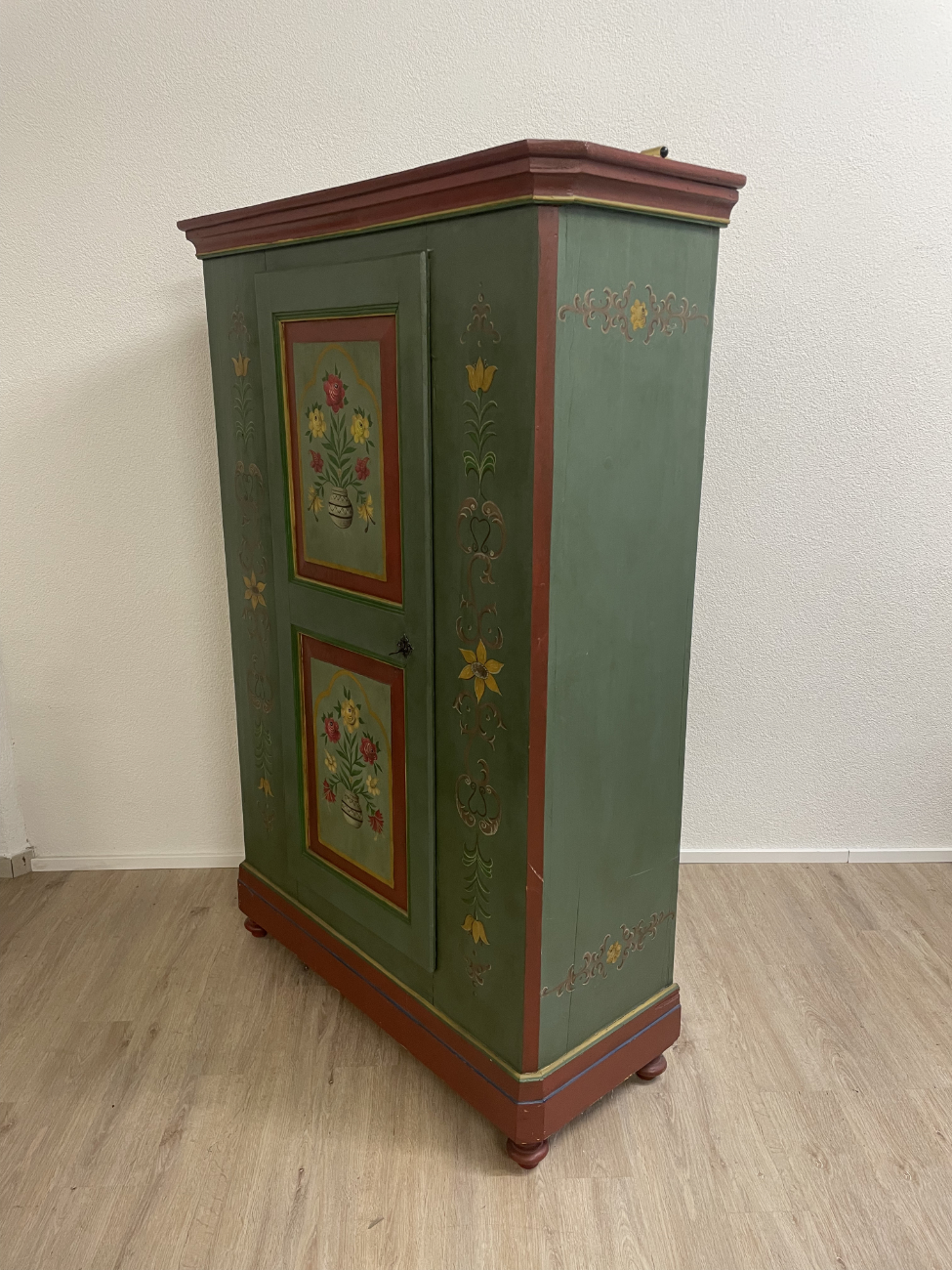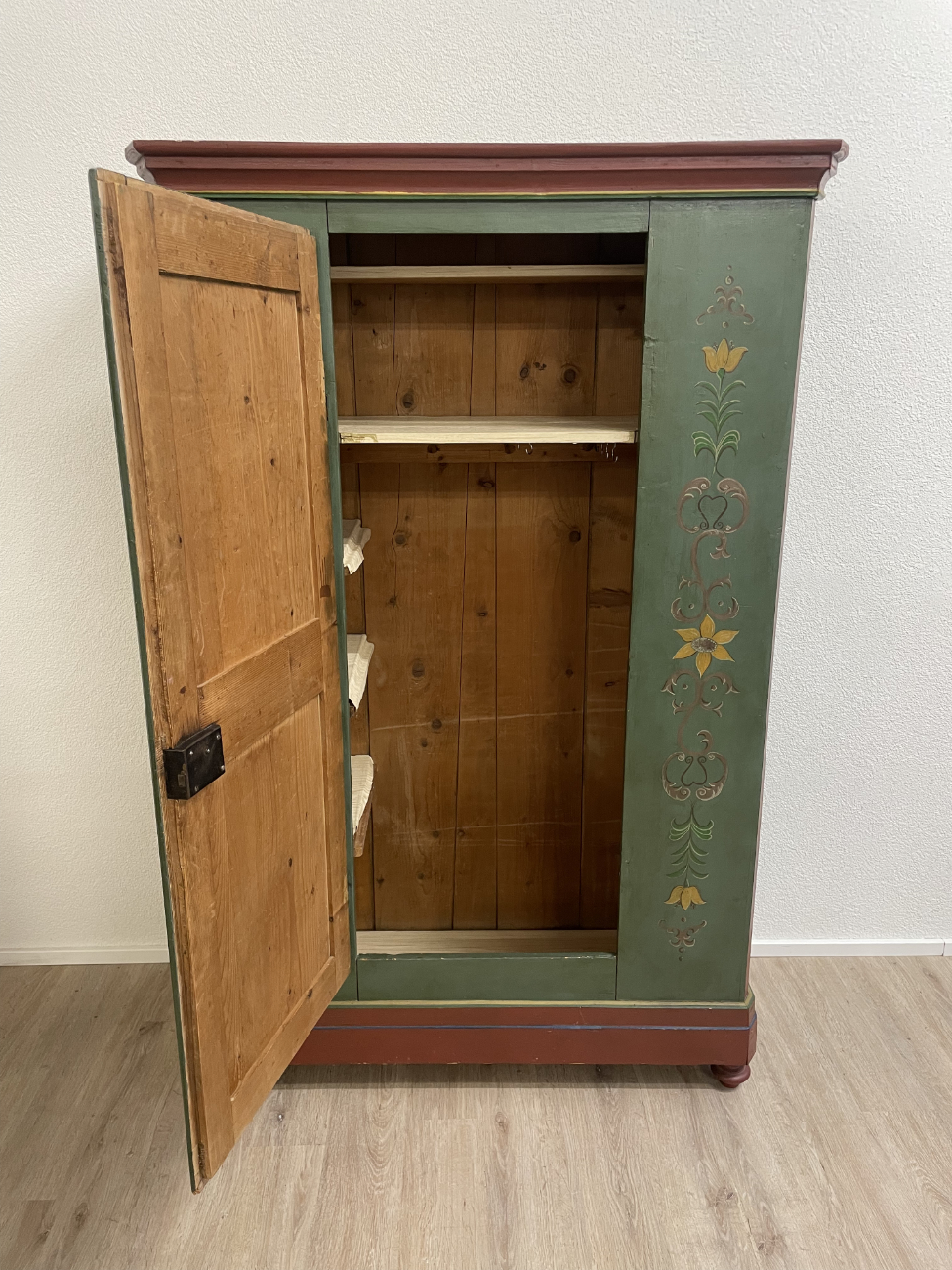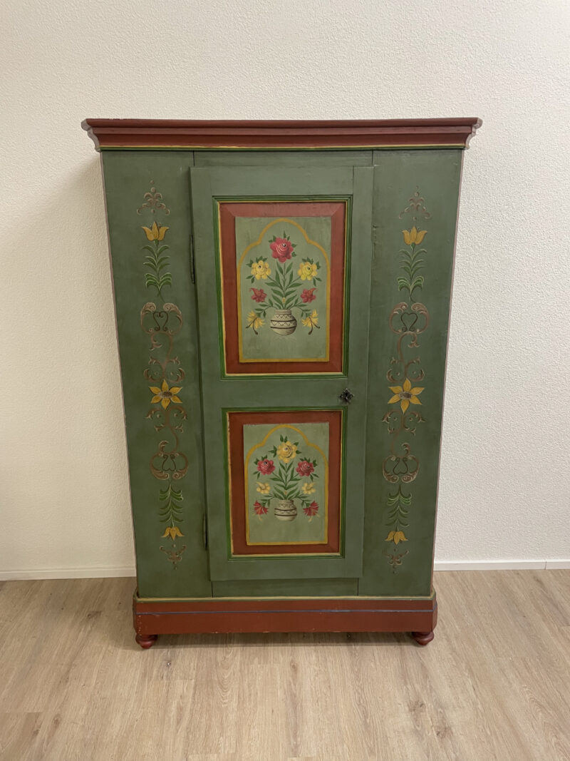 Grün, rot und goldfarben abgesetzt, dazu liebevoll gemalte Blumenvasen und Ornamente: Dieser antike Bauernschrank ist ein echter Blickfang im Landhausstil. Die Front ist reich verziert und wirkt durch die warme Farbgebung sehr wohnlich. Innen zeigt sich naturbelassenes Holz mit mehreren Ablageflächen, ideal für Wäsche, Geschirr oder Vorräte. Die gedrechselten Füsse und die klassische Kranzleiste unterstreichen den traditionellen Charakter.