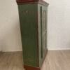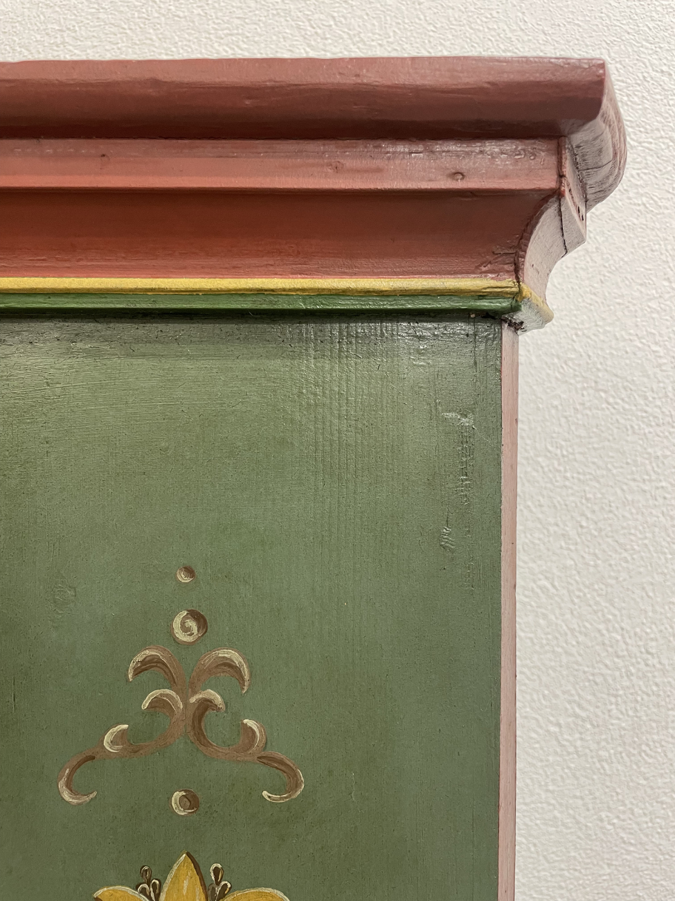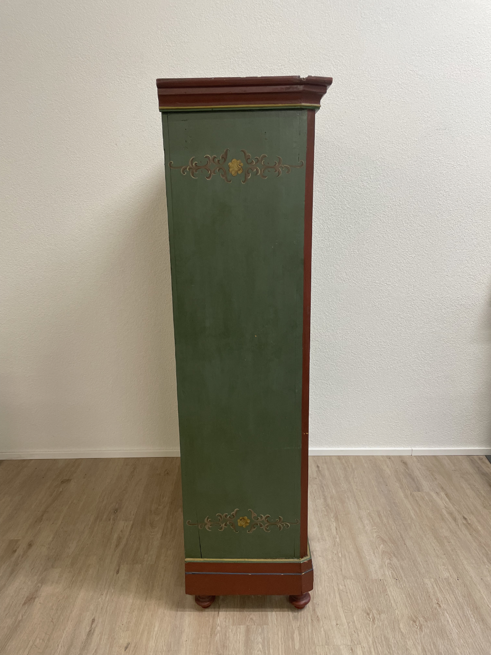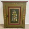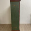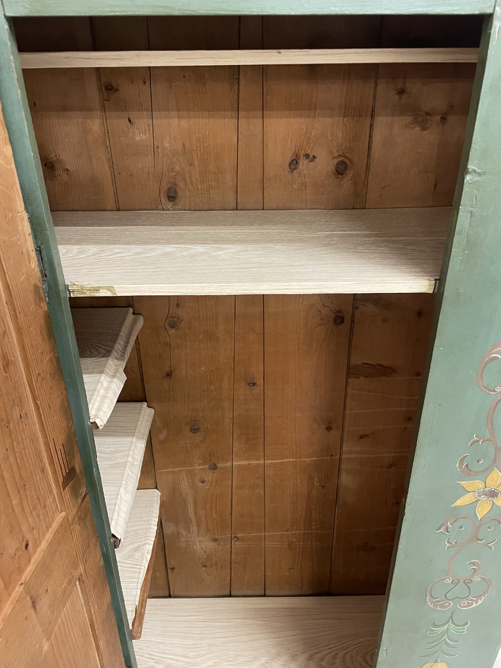 Grün, rot und goldfarben abgesetzt, dazu liebevoll gemalte Blumenvasen und Ornamente: Dieser antike Bauernschrank ist ein echter Blickfang im Landhausstil. Die Front ist reich verziert und wirkt durch die warme Farbgebung sehr wohnlich. Innen zeigt sich naturbelassenes Holz mit mehreren Ablageflächen, ideal für Wäsche, Geschirr oder Vorräte. Die gedrechselten Füsse und die klassische Kranzleiste unterstreichen den traditionellen Charakter.