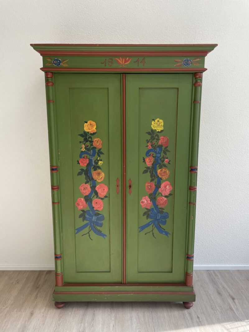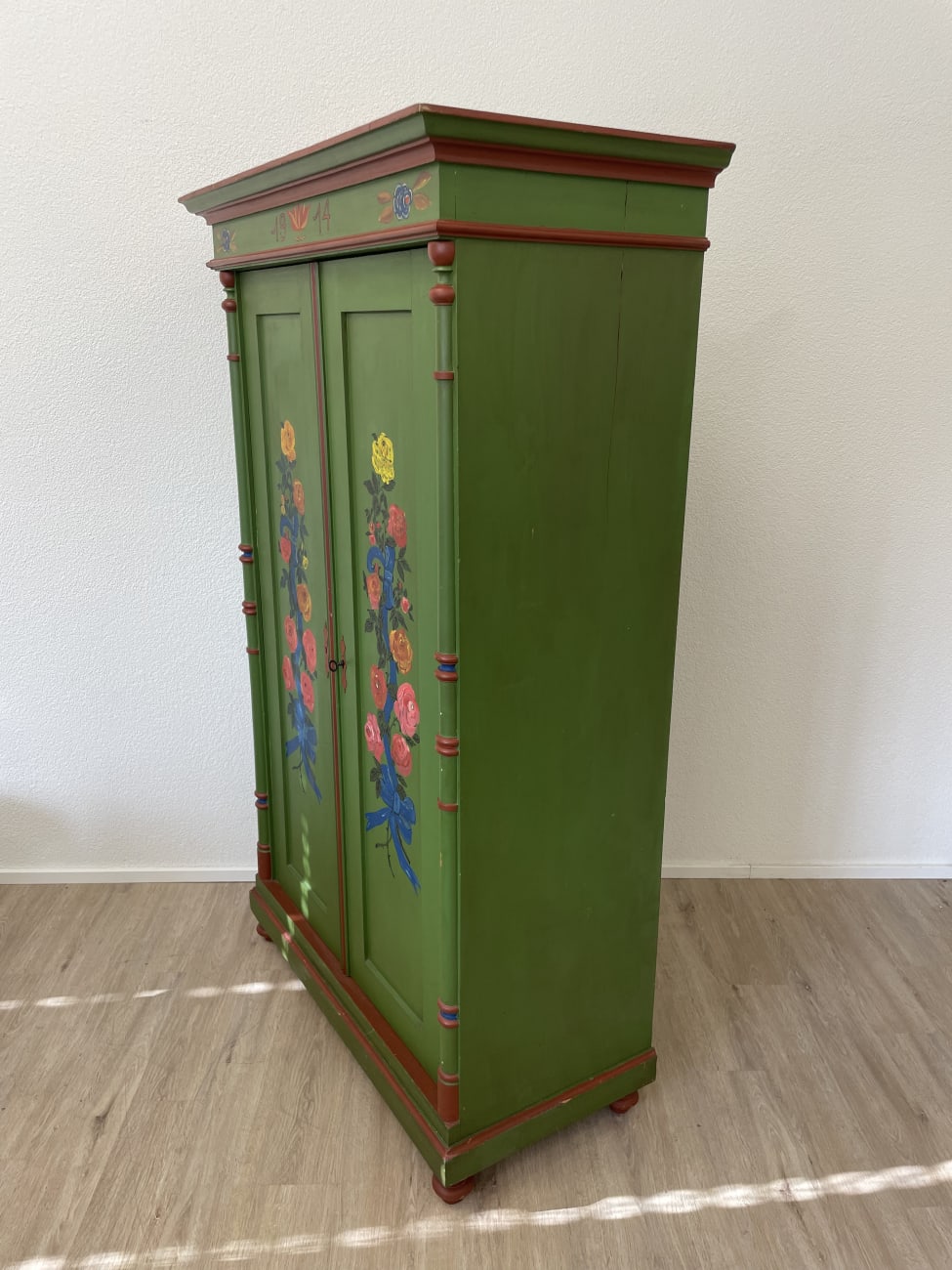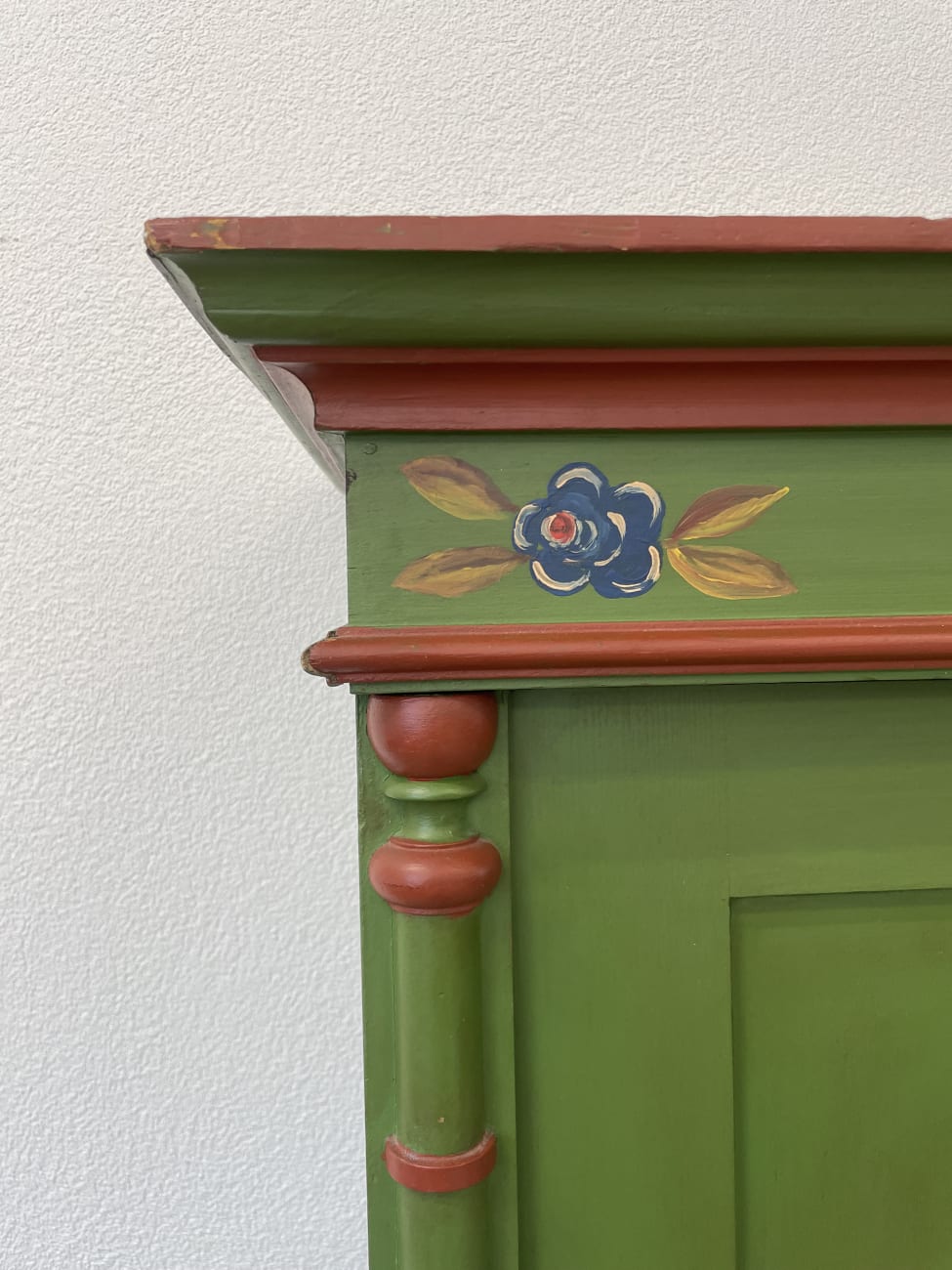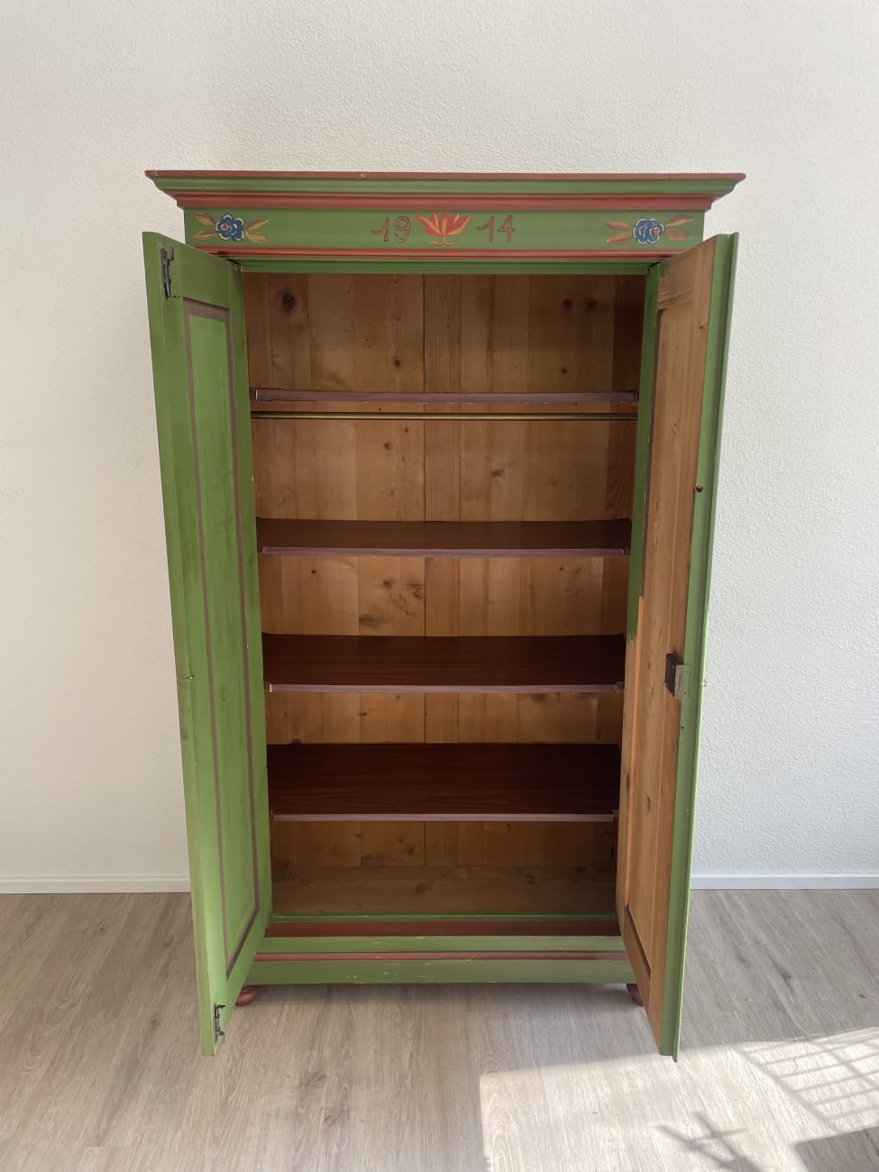 Grün gefasstes Massivholz, handgemalte Blumen und die Jahreszahl 1914 auf der Kranzleiste geben diesem Schrank seinen unverwechselbaren Charakter. Der Schrank stammt aus der Zeit um 1914 und zeigt typische Elemente des traditionellen Alpenstils. Warme Farbtöne, florale Malerei und gedrechselte Eckpfosten verleihen ihm eine sehr lebendige Ausstrahlung. Innen zeigt sich naturbelassenes Holz mit mehreren Einlegeböden sowie einer Kleiderstange.