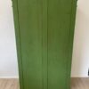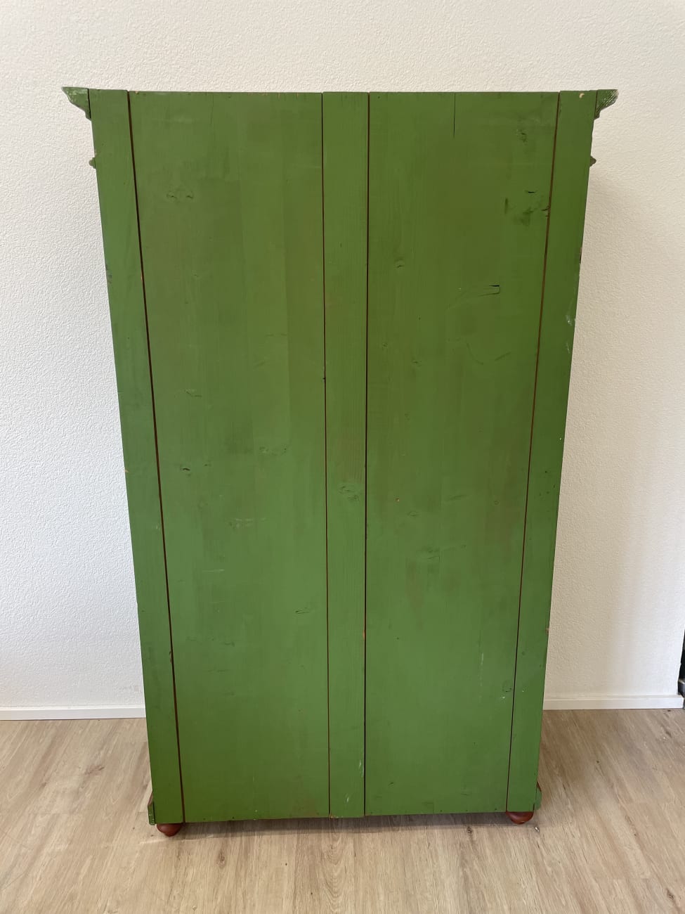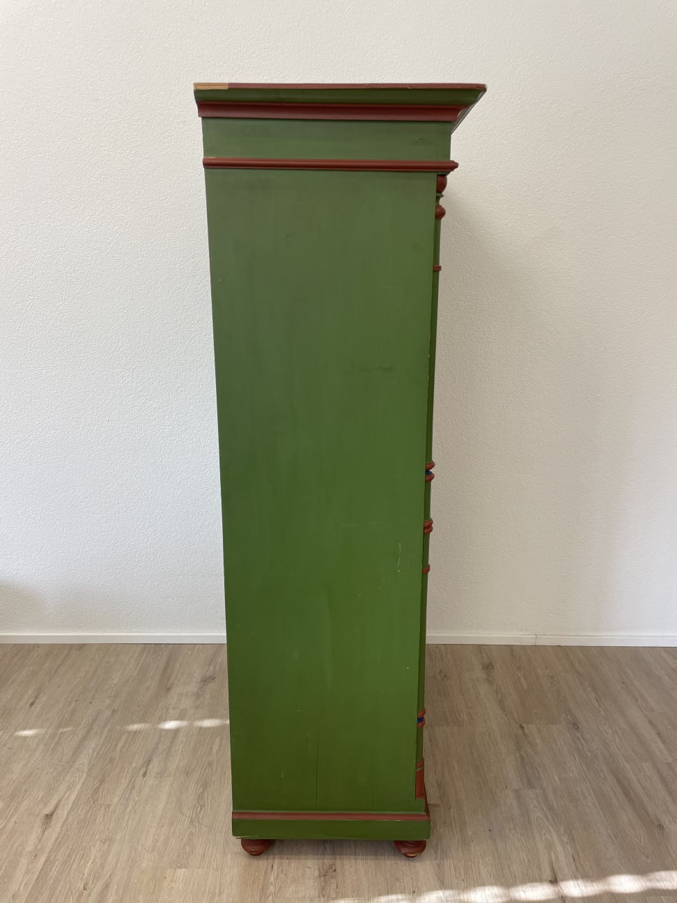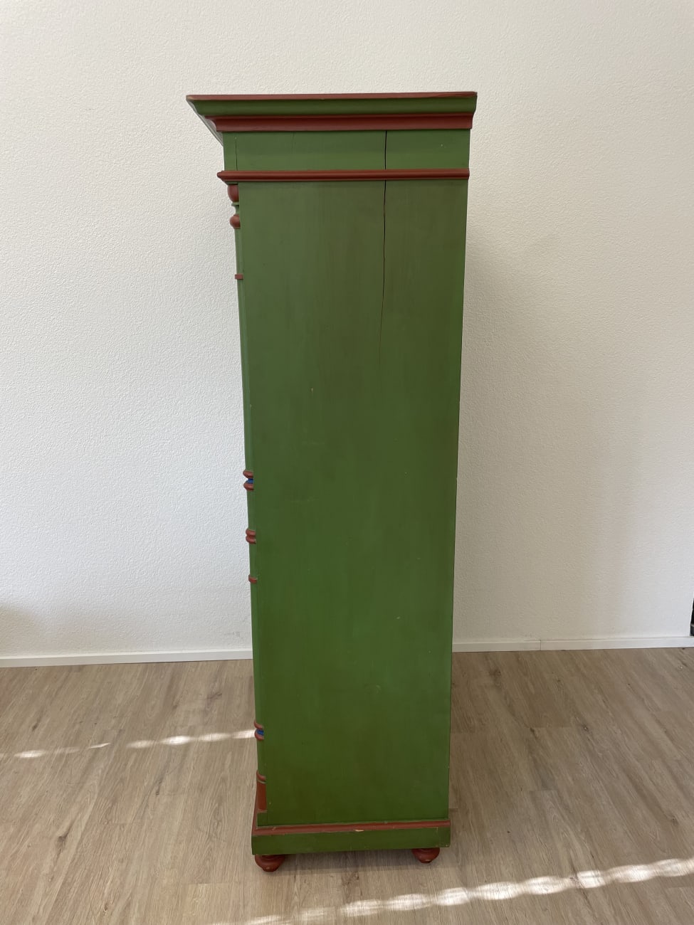 Grün gefasstes Massivholz, handgemalte Blumen und die Jahreszahl 1914 auf der Kranzleiste geben diesem Schrank seinen unverwechselbaren Charakter. Der Schrank stammt aus der Zeit um 1914 und zeigt typische Elemente des traditionellen Alpenstils. Warme Farbtöne, florale Malerei und gedrechselte Eckpfosten verleihen ihm eine sehr lebendige Ausstrahlung. Innen zeigt sich naturbelassenes Holz mit mehreren Einlegeböden sowie einer Kleiderstange.