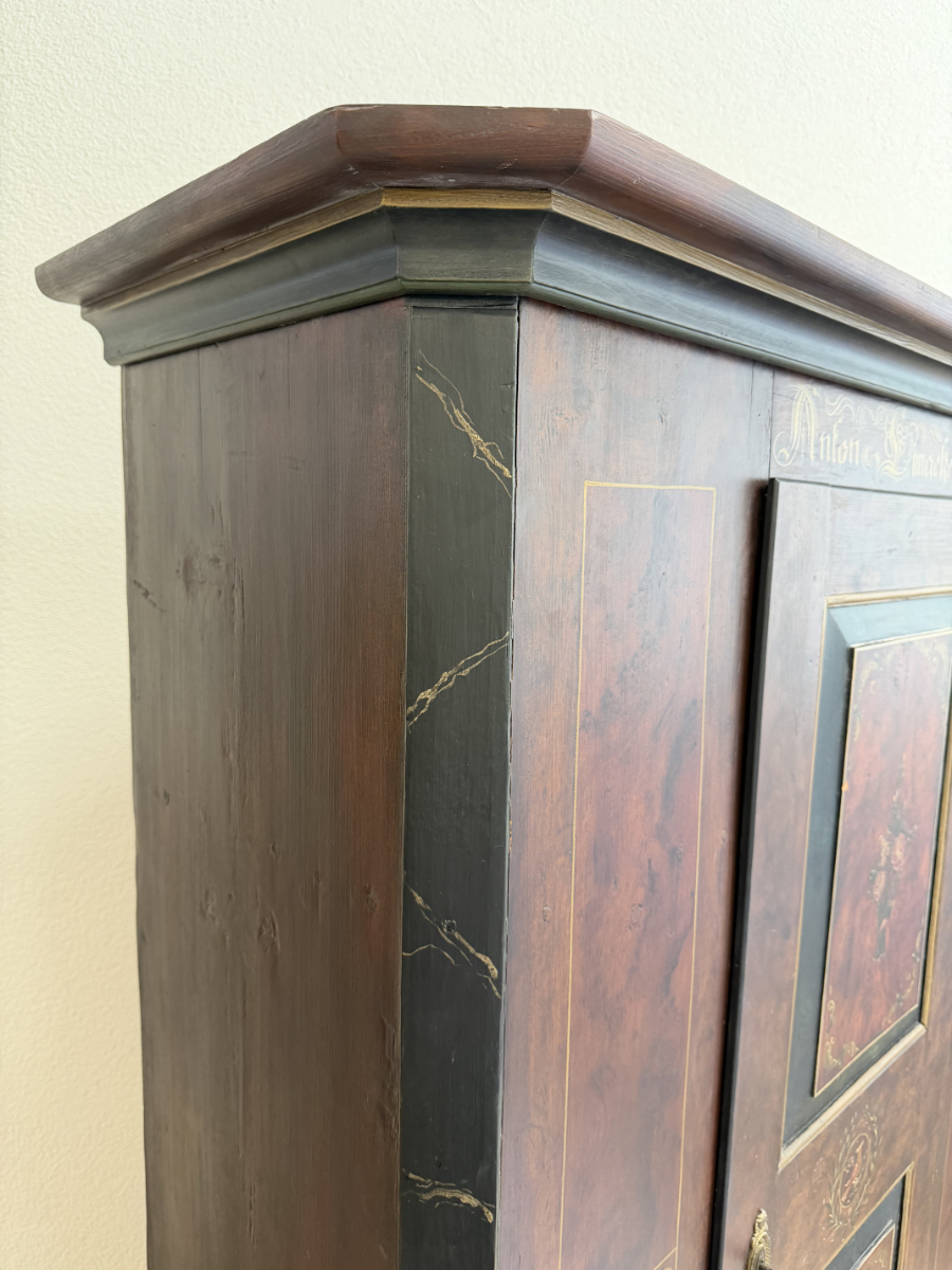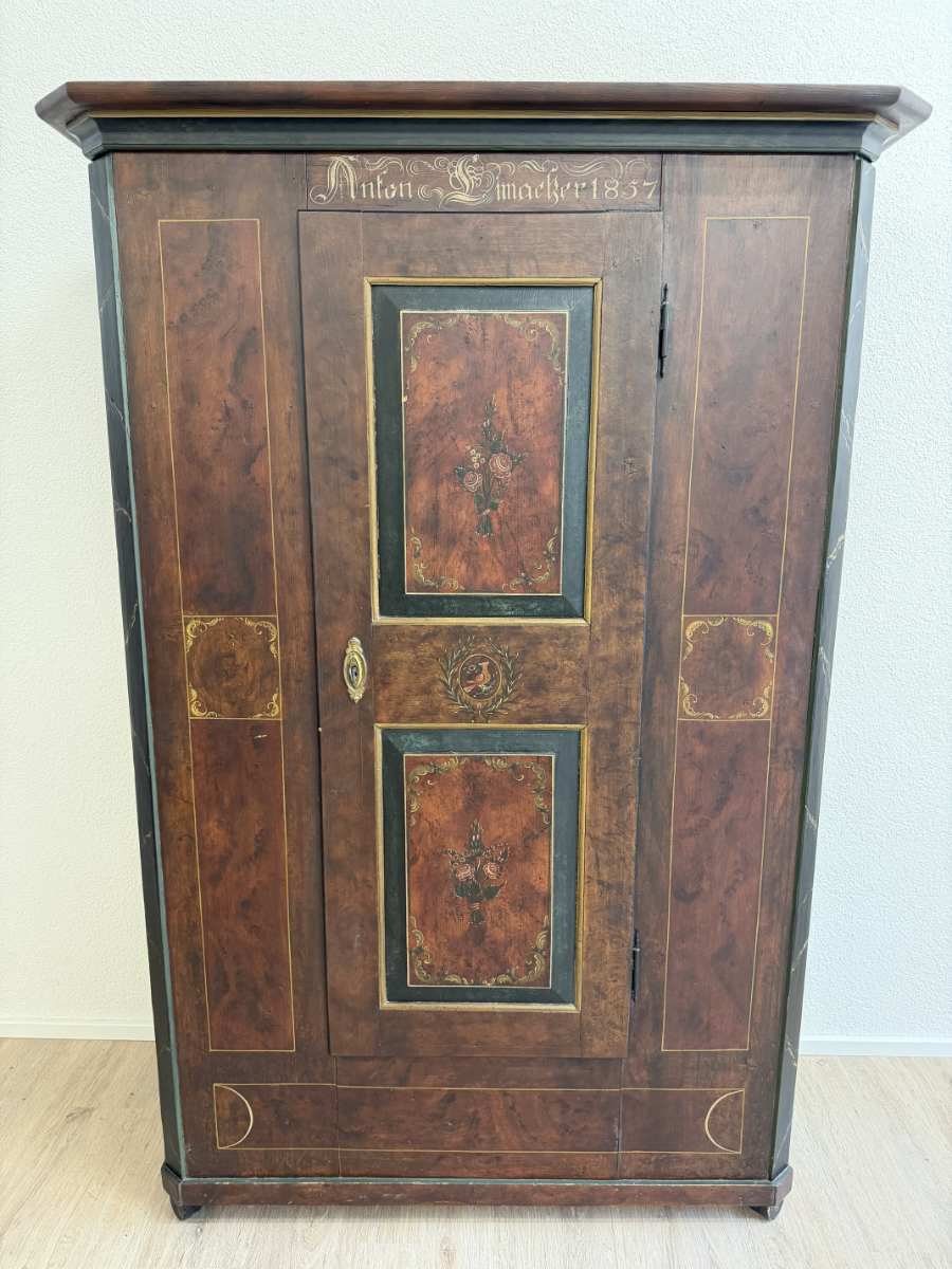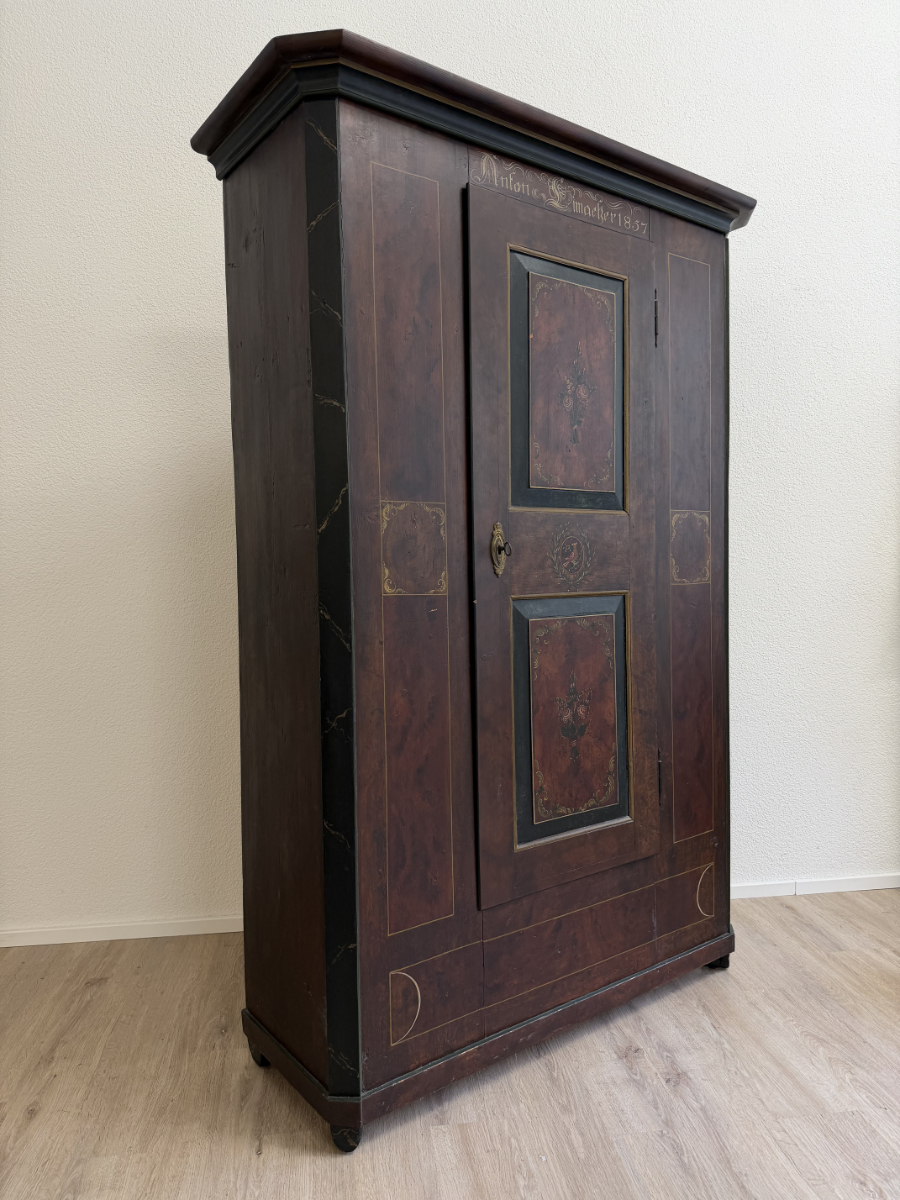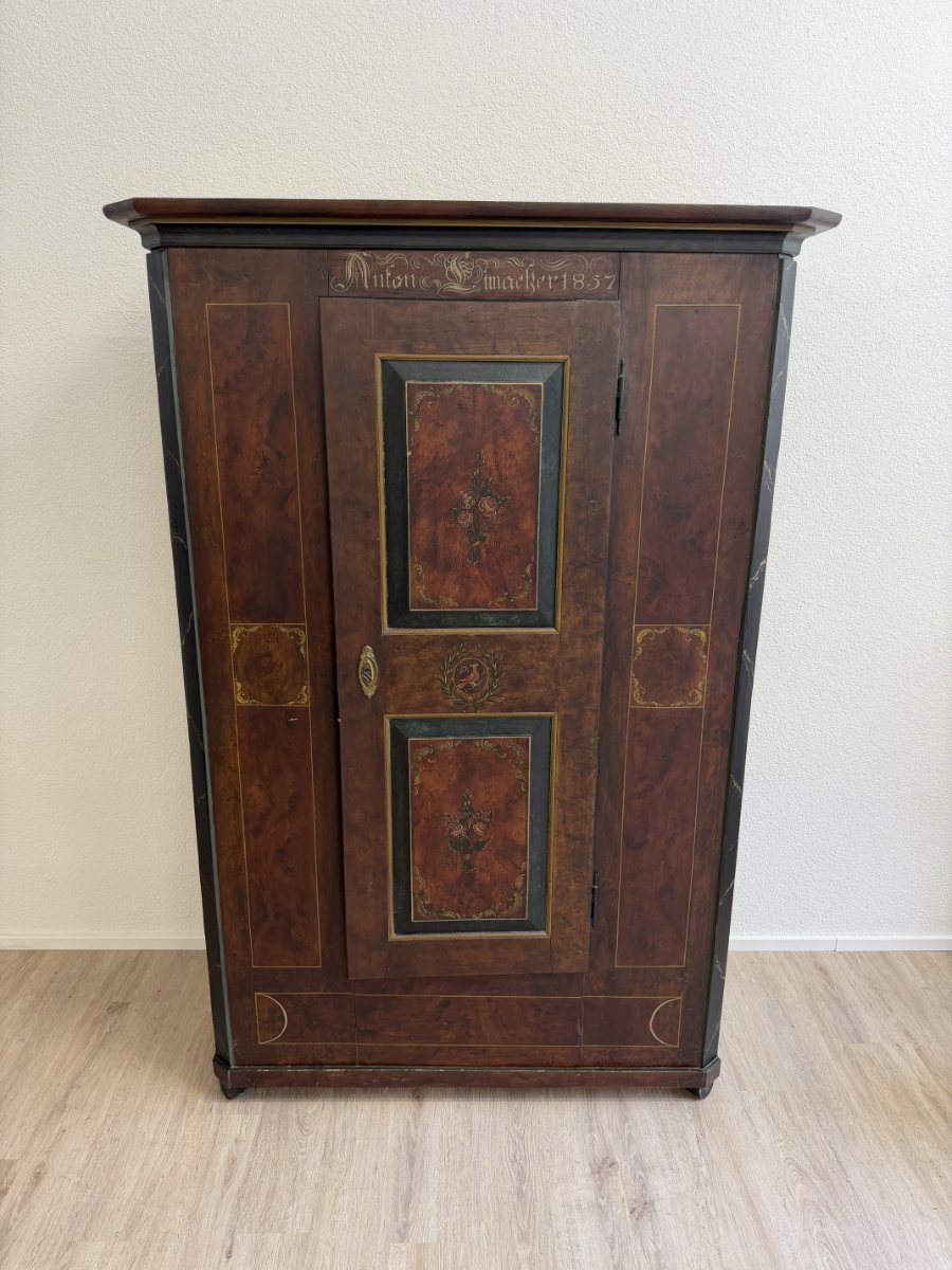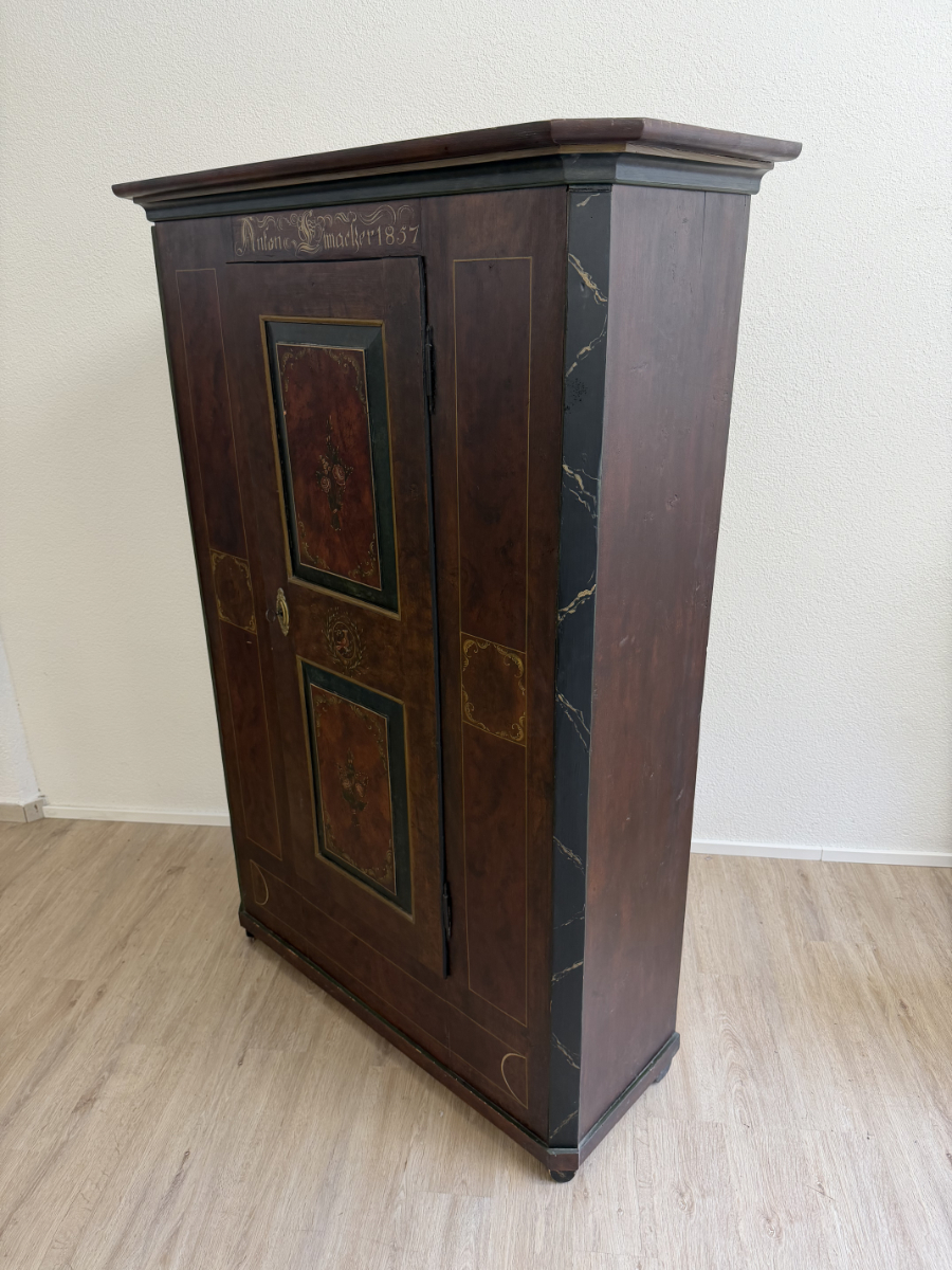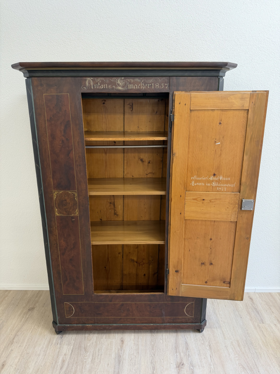 Dunkelbrauner Grundton, darüber eine rötlich marmorierte Bemalung mit feinen Goldlinien und handgemalten Blumenfeldern in der Tür, ergänzt durch ein kleines Vogelmotiv. Dieser antike Bauernschrank wirkt wie ein Stück Schweizer Wohngeschichte. Oben sind die Jahreszahl 1857 und der Name Anton Limacher kunstvoll aufgemalt. Innen überzeugt er mit praktischem Stauraum, mehreren Tablaren und einer Kleiderstange. Auf der Innenseite der Tür findet sich zudem ein Hinweis zur Restaurierung in Luzern (1977).