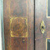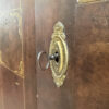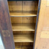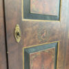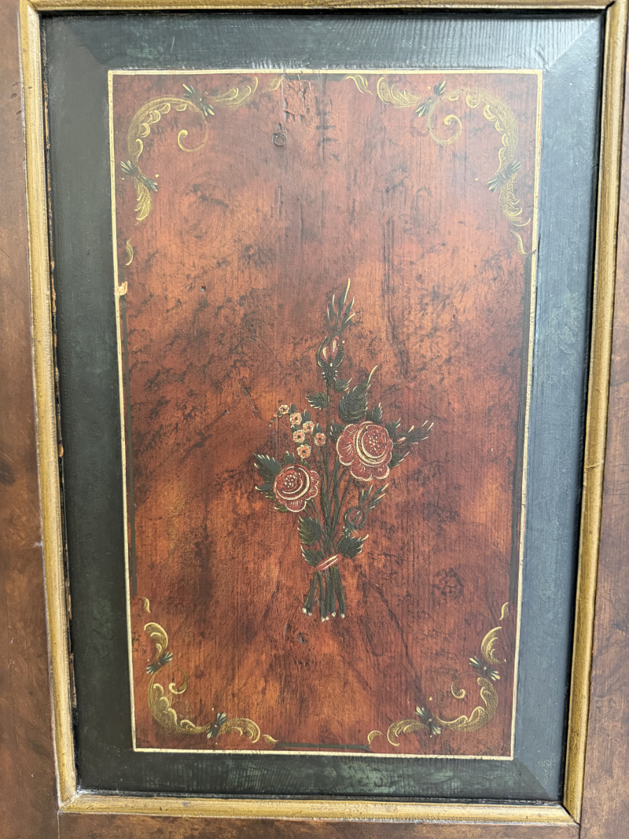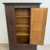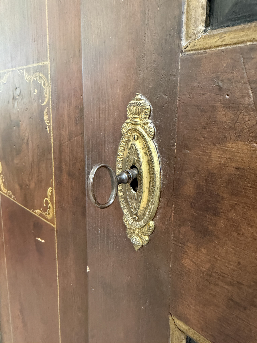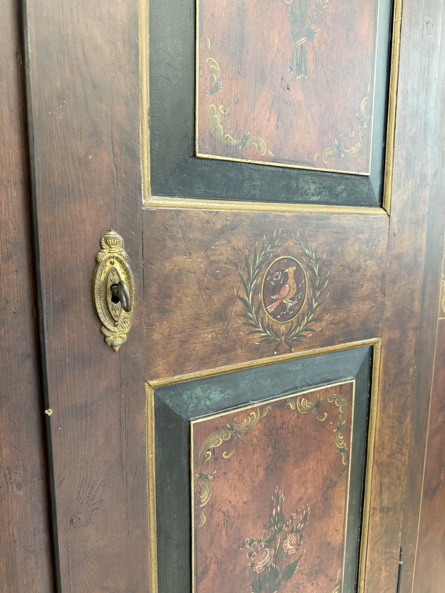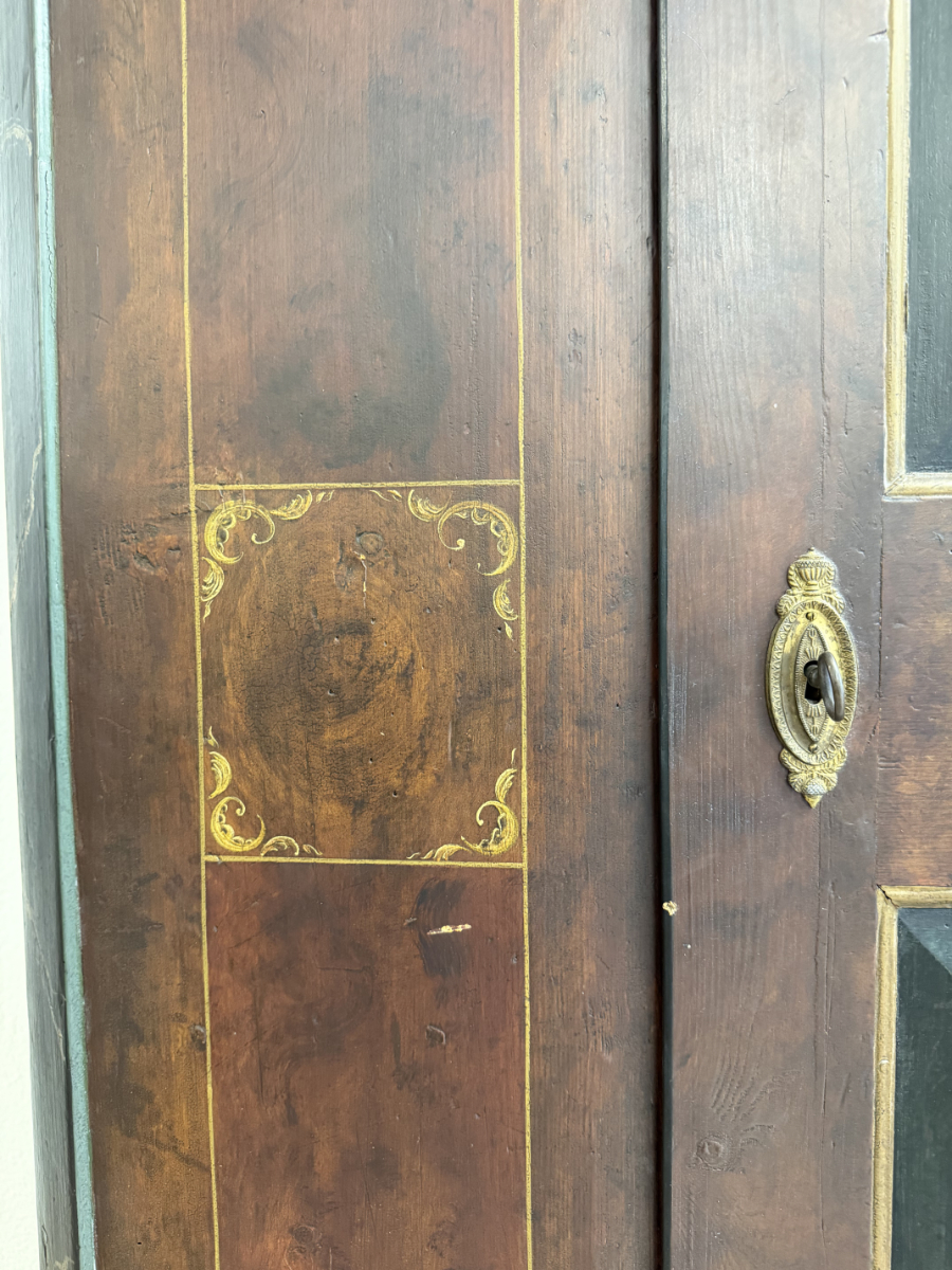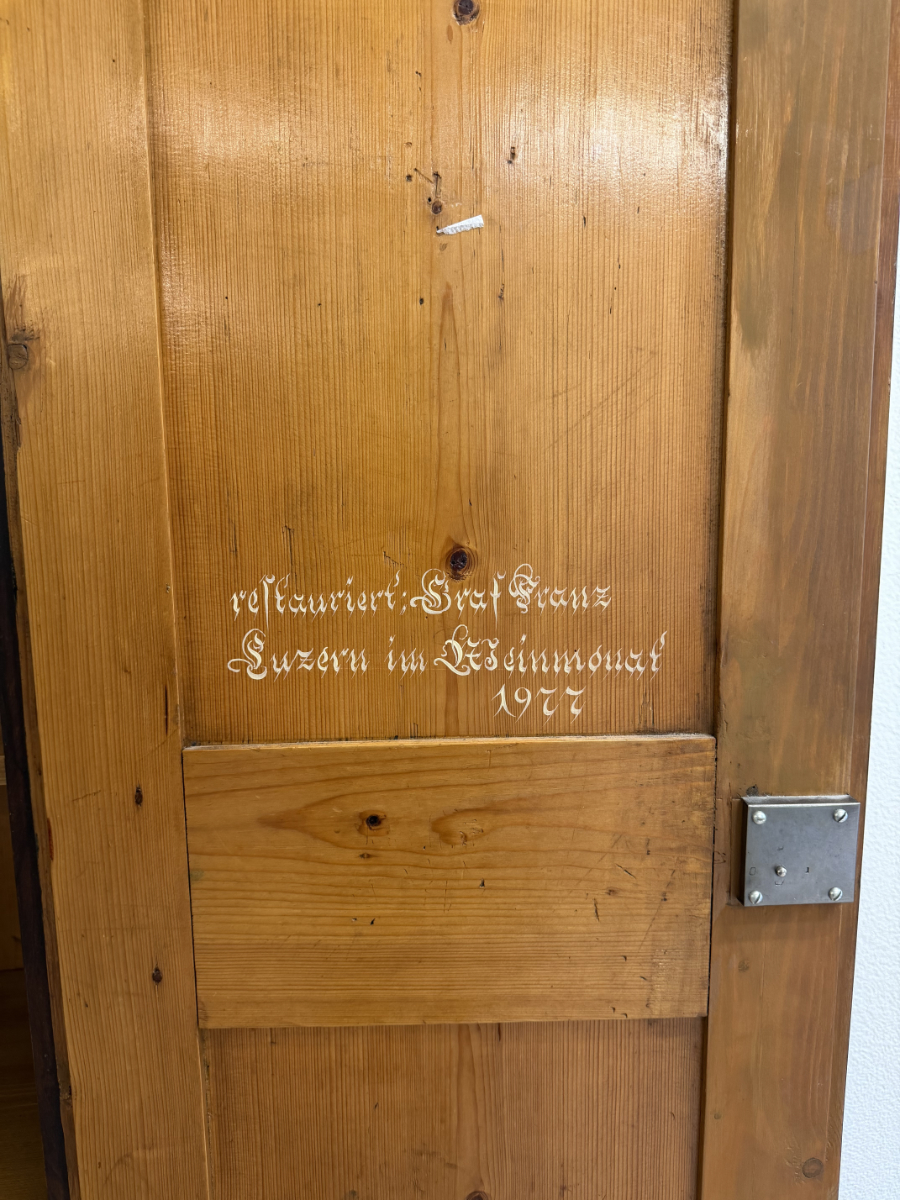 Dunkelbrauner Grundton, darüber eine rötlich marmorierte Bemalung mit feinen Goldlinien und handgemalten Blumenfeldern in der Tür, ergänzt durch ein kleines Vogelmotiv. Dieser antike Bauernschrank wirkt wie ein Stück Schweizer Wohngeschichte. Oben sind die Jahreszahl 1857 und der Name Anton Limacher kunstvoll aufgemalt. Innen überzeugt er mit praktischem Stauraum, mehreren Tablaren und einer Kleiderstange. Auf der Innenseite der Tür findet sich zudem ein Hinweis zur Restaurierung in Luzern (1977).