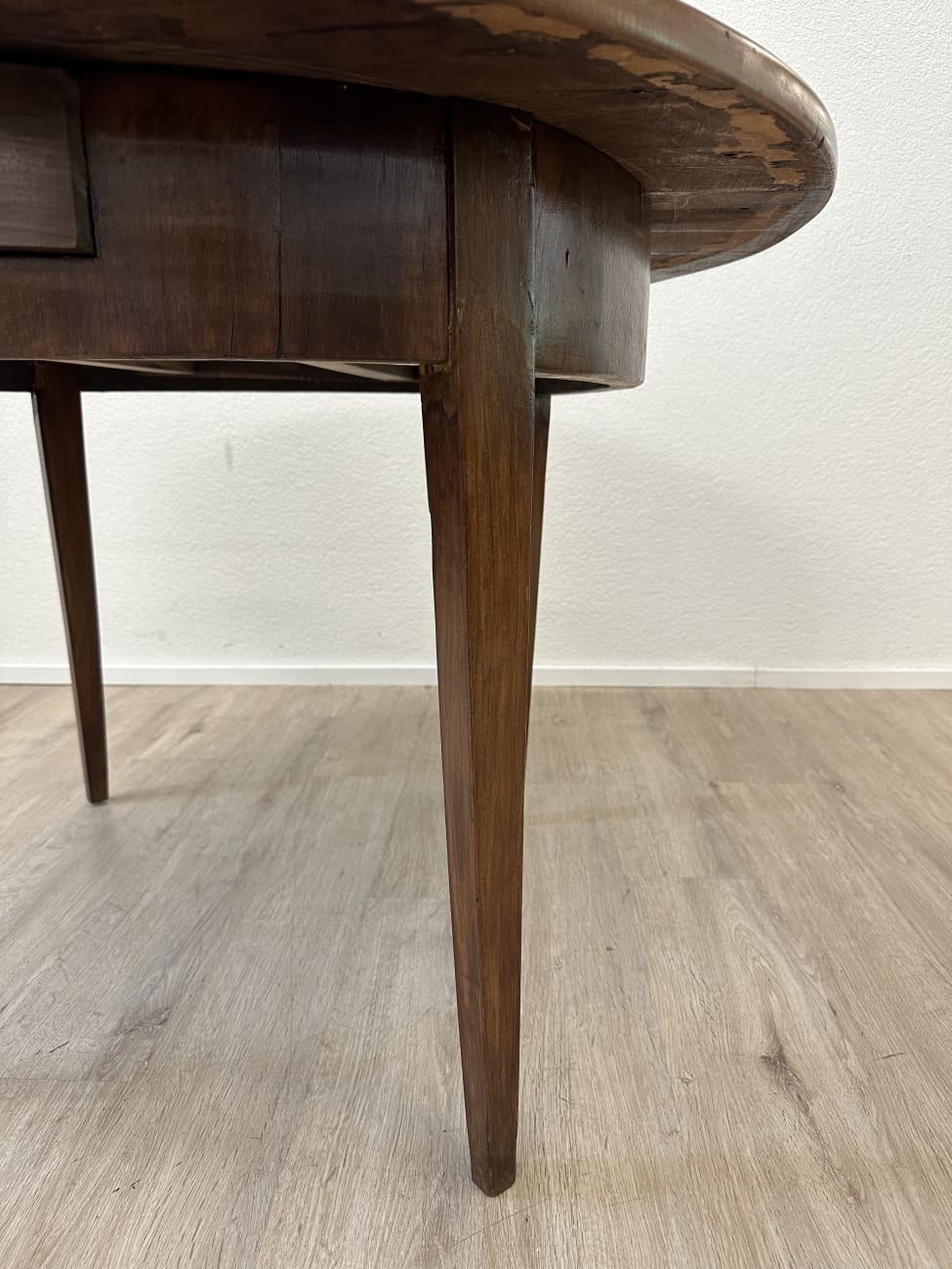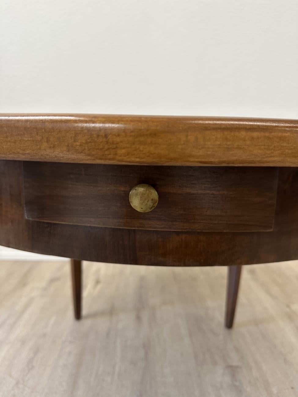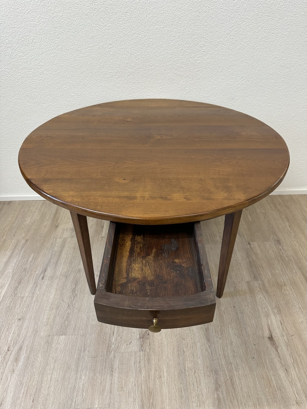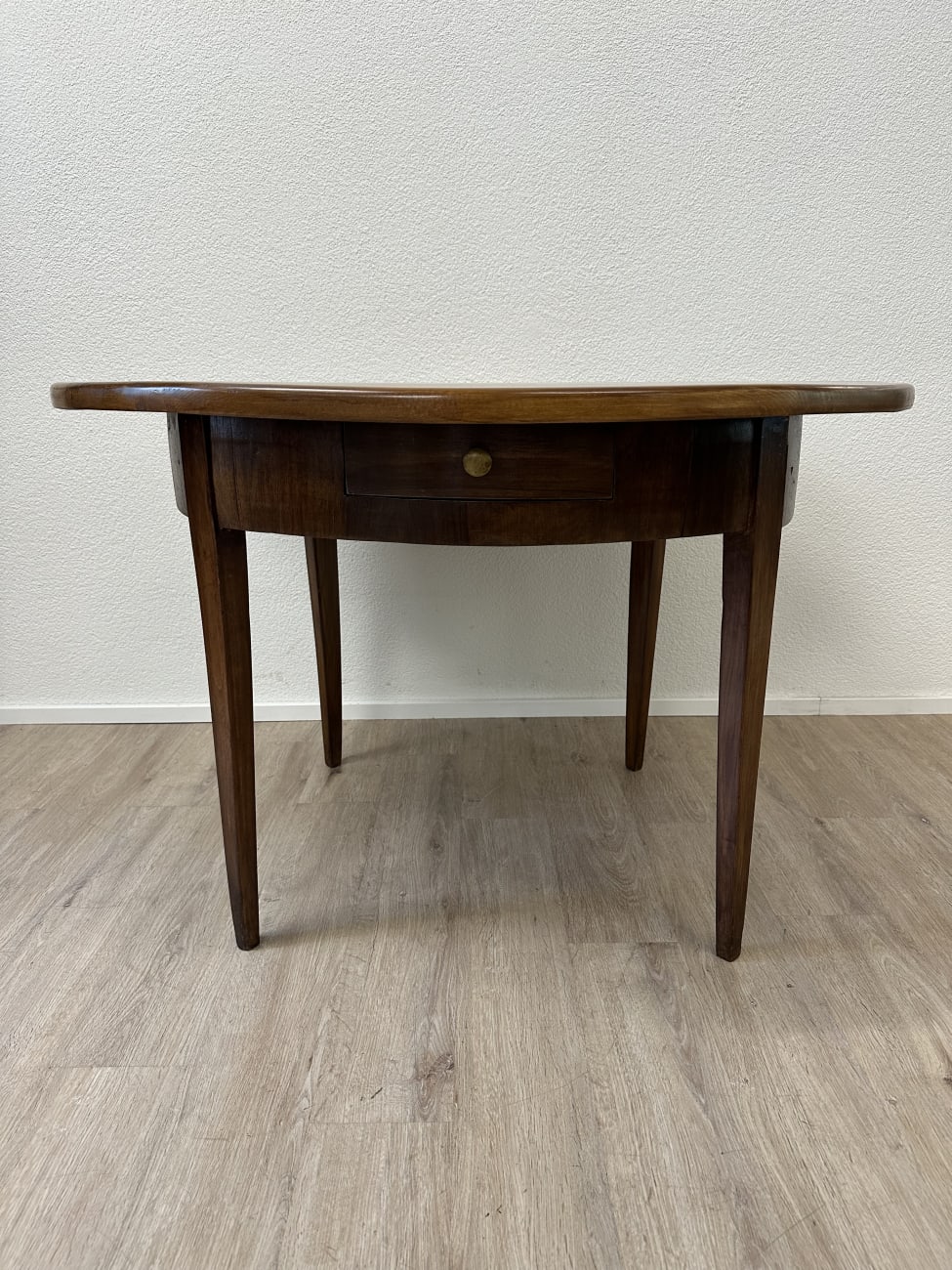 Runde Form, warme Nussbaumfarbe und eine ruhige, gleichmässige Maserung geben diesem Tisch eine sehr stimmige Ausstrahlung. Typisch Biedermeier zeigt er sich schlicht und klar gebaut, ohne überflüssige Details. Die leicht konischen Beine sorgen für eine elegante Linie und stabilen Stand. Unter der Platte sitzt eine integrierte Schublade mit Holzknauf, praktisch für alles, was schnell griffbereit sein soll.