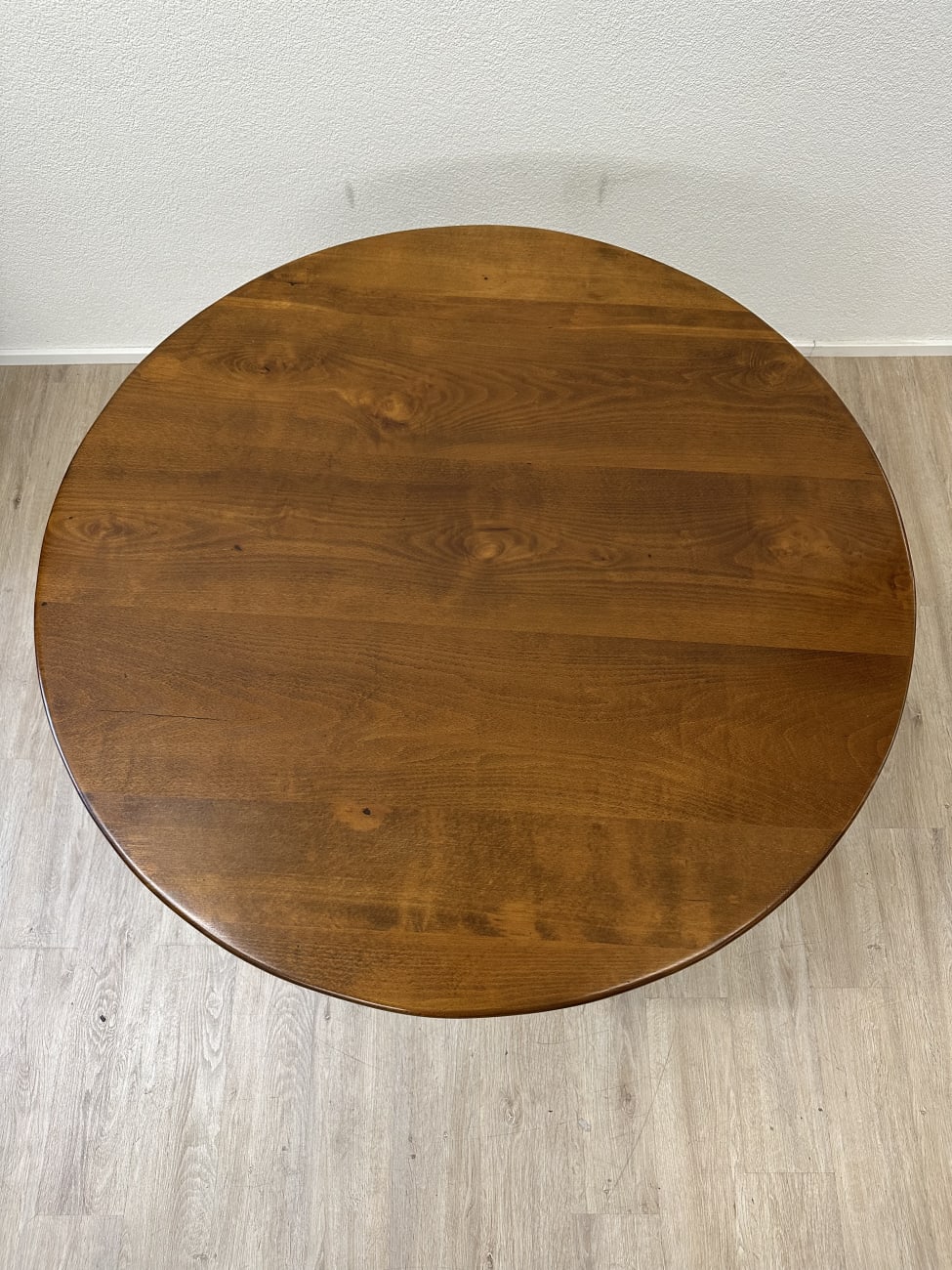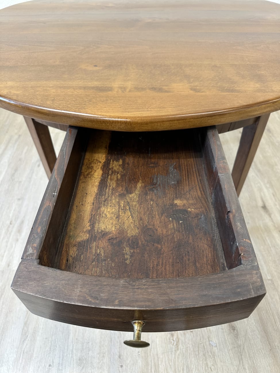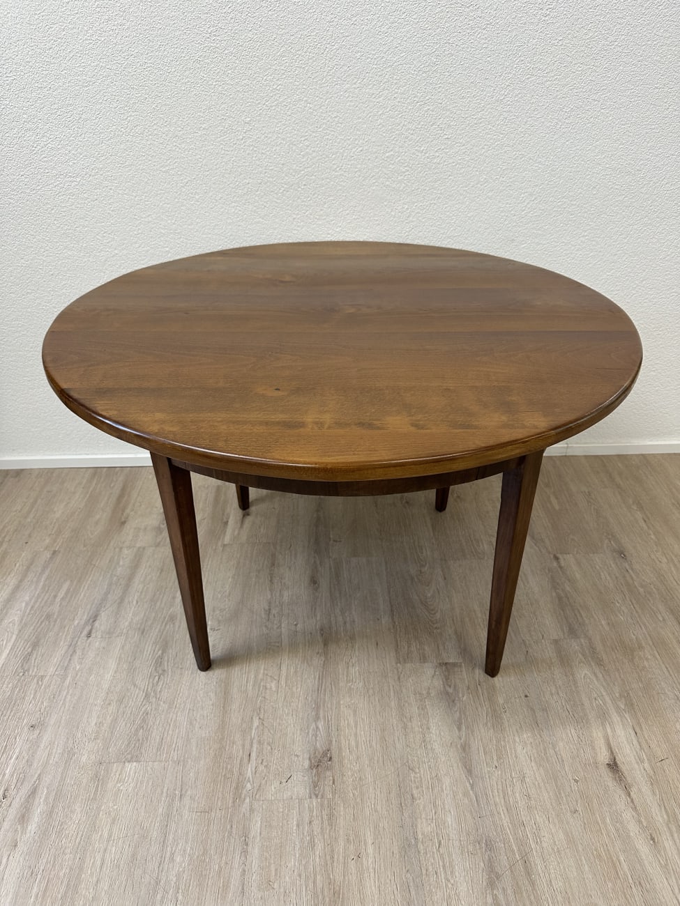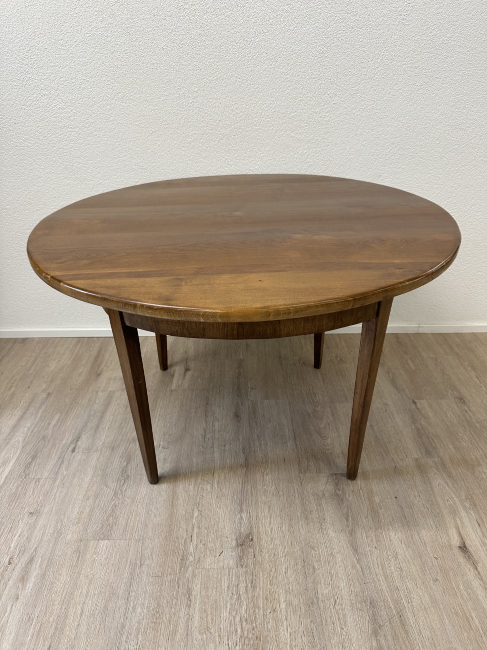 Runde Form, warme Nussbaumfarbe und eine ruhige, gleichmässige Maserung geben diesem Tisch eine sehr stimmige Ausstrahlung. Typisch Biedermeier zeigt er sich schlicht und klar gebaut, ohne überflüssige Details. Die leicht konischen Beine sorgen für eine elegante Linie und stabilen Stand. Unter der Platte sitzt eine integrierte Schublade mit Holzknauf, praktisch für alles, was schnell griffbereit sein soll.