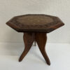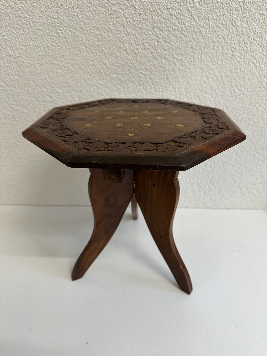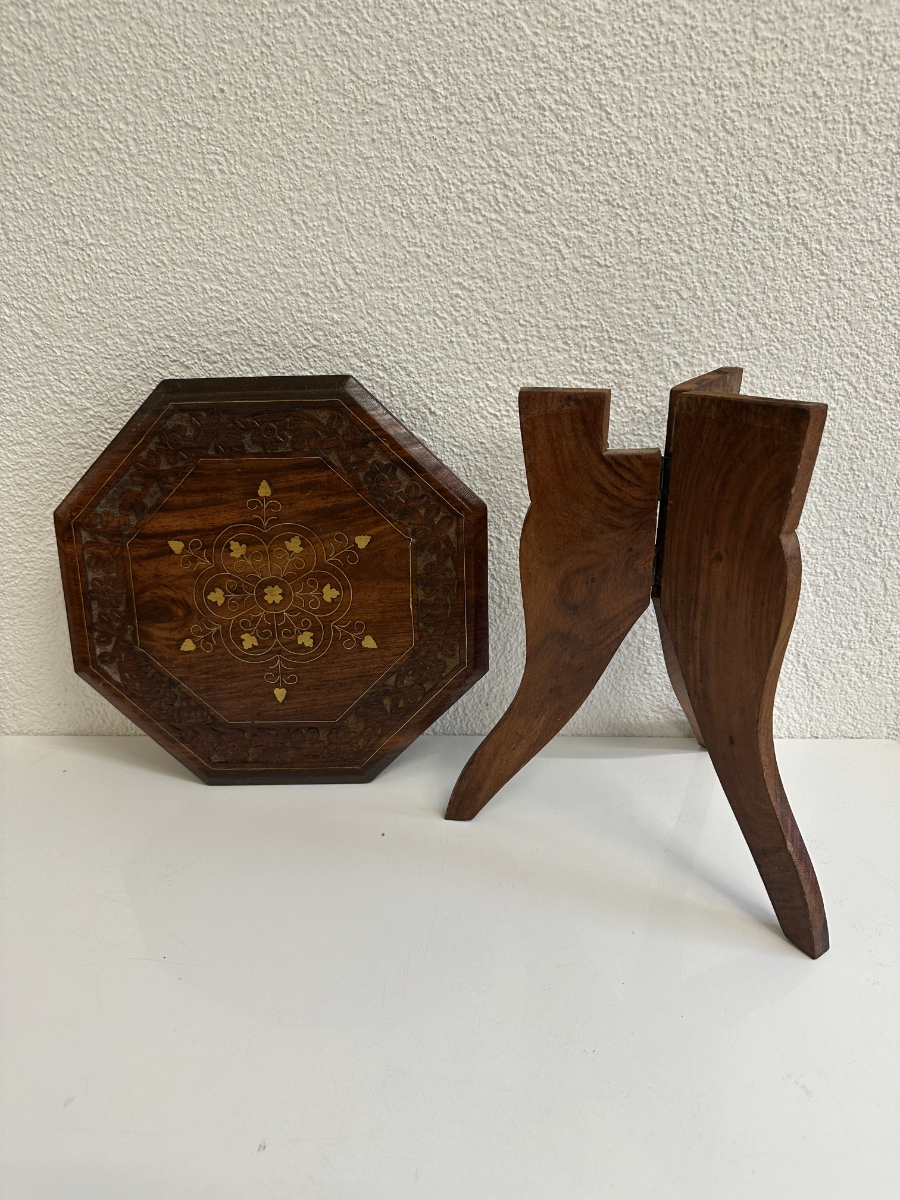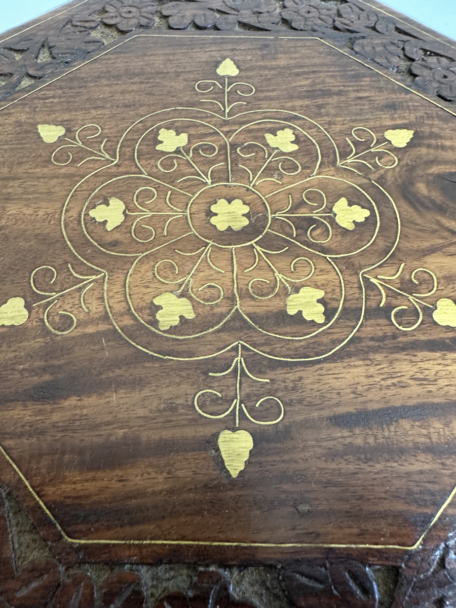Achteckige Tischplatte mit eingearbeitetem floralem Ziermuster in warmem Goldton und einem verzierten Rand mit Schnitzarbeit. Das klappbare Gestell macht den Tisch praktisch im Alltag und leicht verstaubar. Die dunkle Holzfarbe mit feiner Maserung wirkt ruhig und hochwertig und passt gut zu Boho- oder orientalisch inspirierten Wohnbereichen.