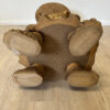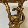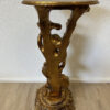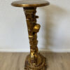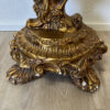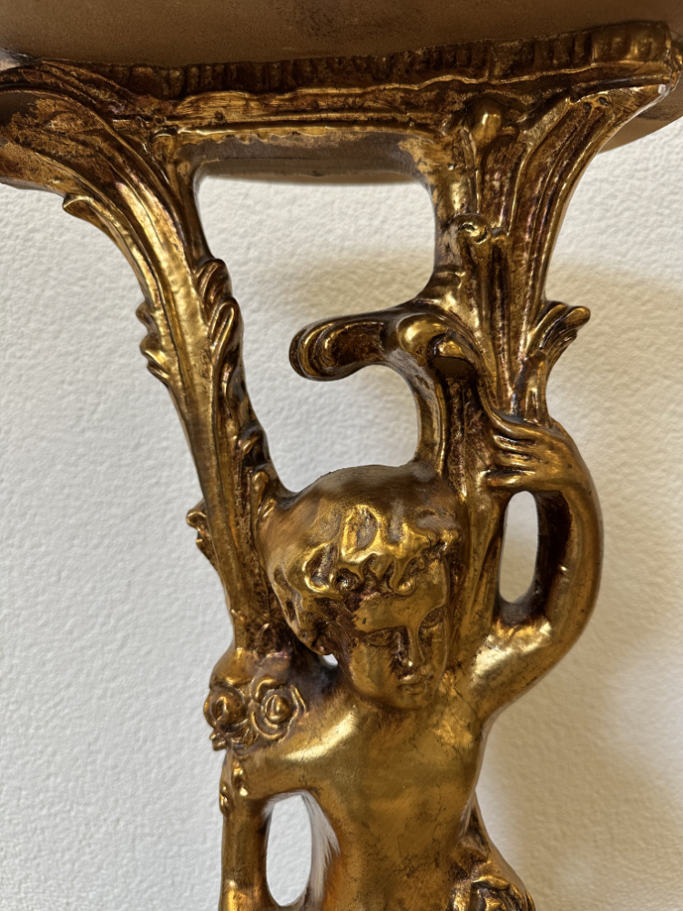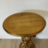 Reich gearbeiteter Beistelltisch in skulpturaler Ausführung mit zentraler Putto-Figur, die die runde Tischplatte trägt. Die Darstellung zeigt einen kindlichen Putto in dynamischer Haltung, umgeben von rocaillenartigen Schwüngen, floralen Details und ornamentaler Basis. Vollständig aus Holz gearbeitet, mit goldfarbener Fassung, die die plastische Tiefe und die handwerkliche Ausarbeitung betont. Sockel mit vier ausgeformten Standfüssen und umlaufender Profilierung. Die Tischplatte ist rund, leicht überstehend und ebenfalls gefasst. Ein dekoratives Objekt aus der Zeit des Historismus, gedacht als Akzentmöbel für repräsentative Räume.