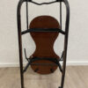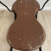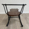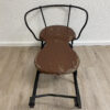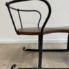 Massives Holz in warmem Braun bildet die charakteristische, leicht taillierte Sitzfläche. Die Oberfläche zeigt authentische Gebrauchsspuren, kleine Abplatzungen und Patina, die das Alter unterstreichen und dem Stück seine ehrliche Ausstrahlung verleihen. Das schwarz lackierte Metallgestell ist stabil gearbeitet und mit dekorativen Endungen versehen.