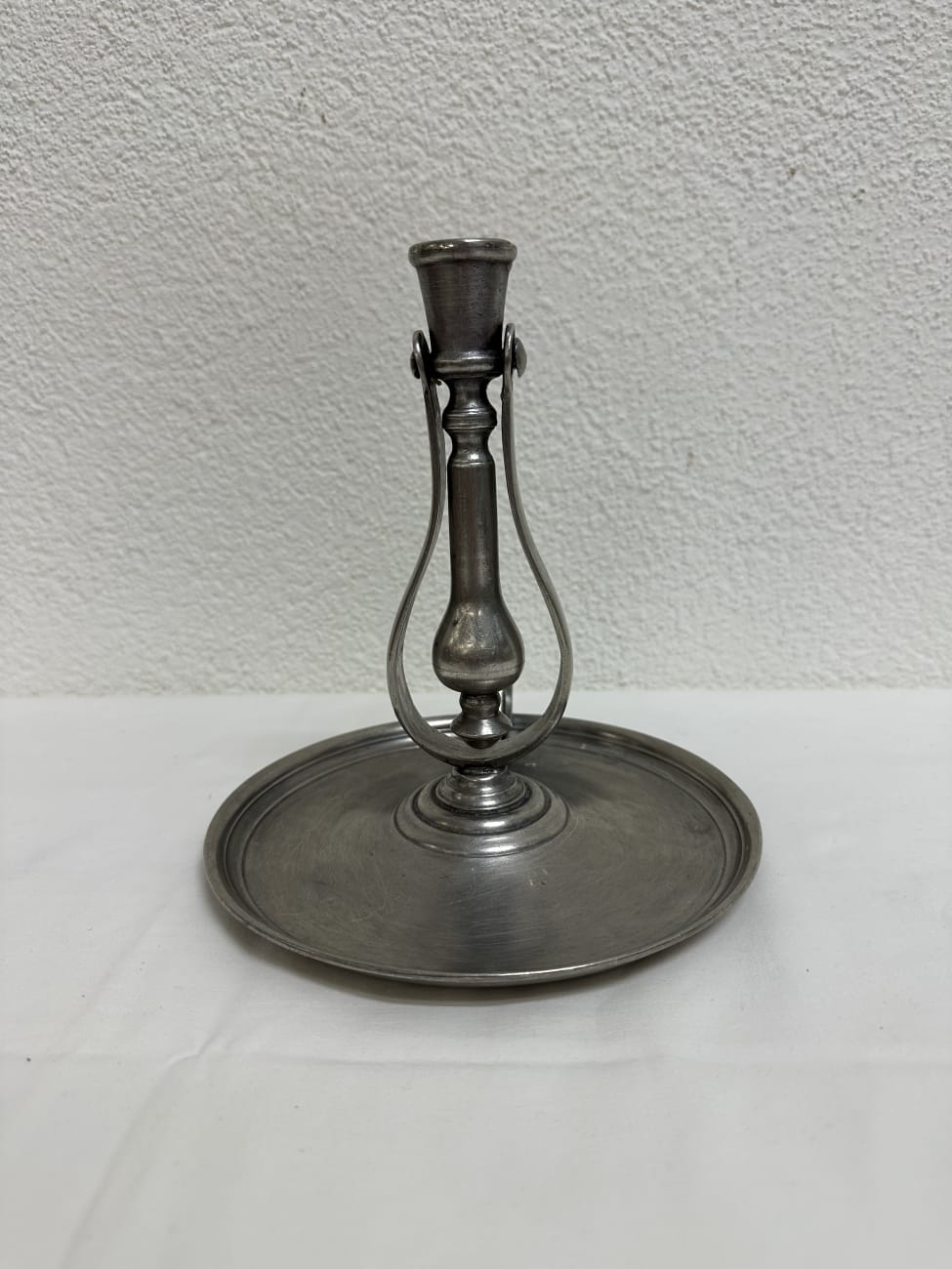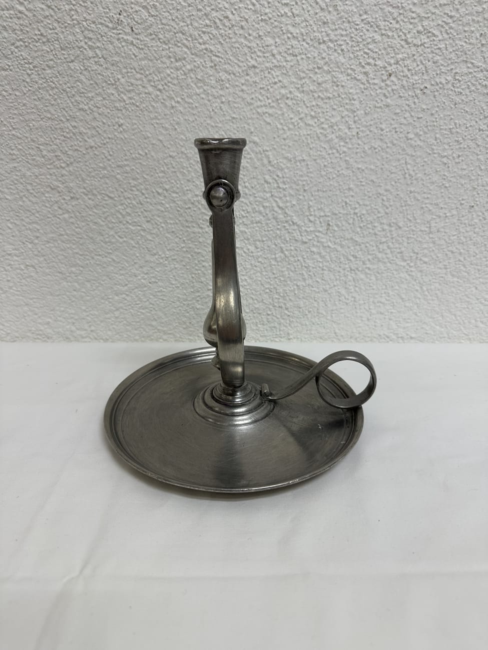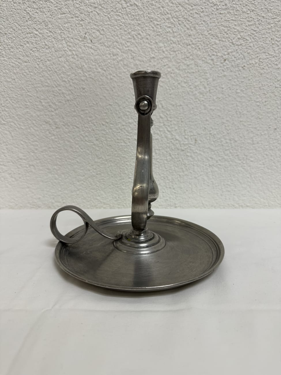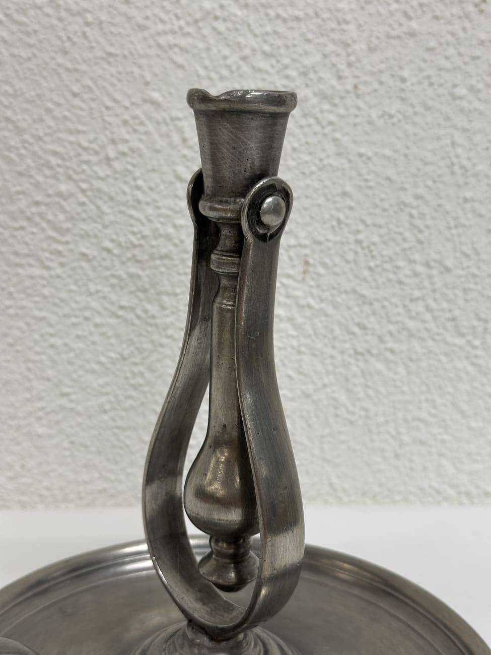 Massiver Kerzenhalter aus Zinn mit breitem Tropfteller und charakteristischer Fingerschlaufe zum Tragen. Solche Handkerzenhalter wurden früher als mobile Lichtquelle genutzt, etwa in Bauernhäusern oder Werkstätten. Der gedrehte Schaft und die bewegliche Halterung zeigen eine typische handwerkliche Form aus dem späten 19. Jahrhundert. Der lange Mittelteil im Halter ist beweglich und kann leicht nach links oder rechts geneigt werden, damit das geschmolzene Kerzenwachs gezielt auf den breiten Tropfteller ablaufen kann. Die matte Zinnoberfläche mit feiner Patina unterstreicht den historischen Charakter.