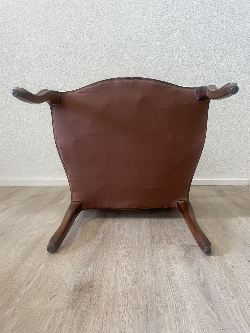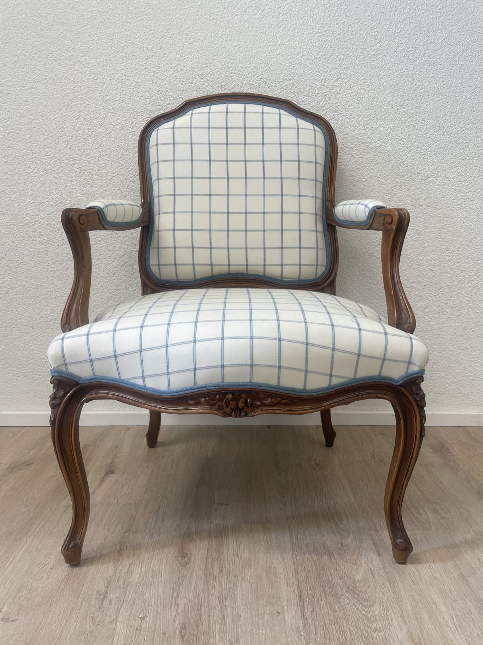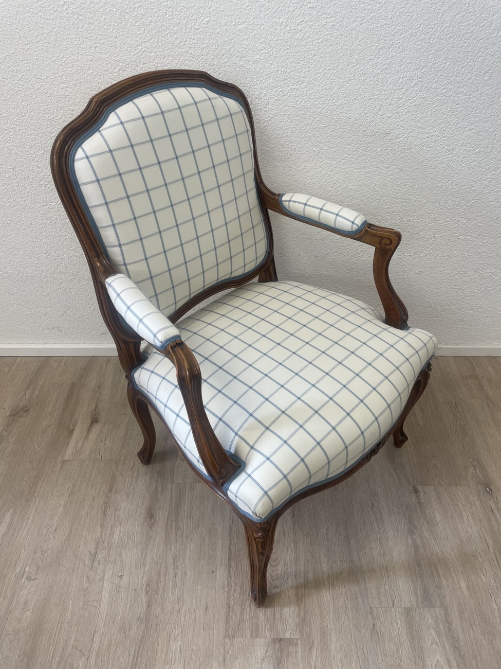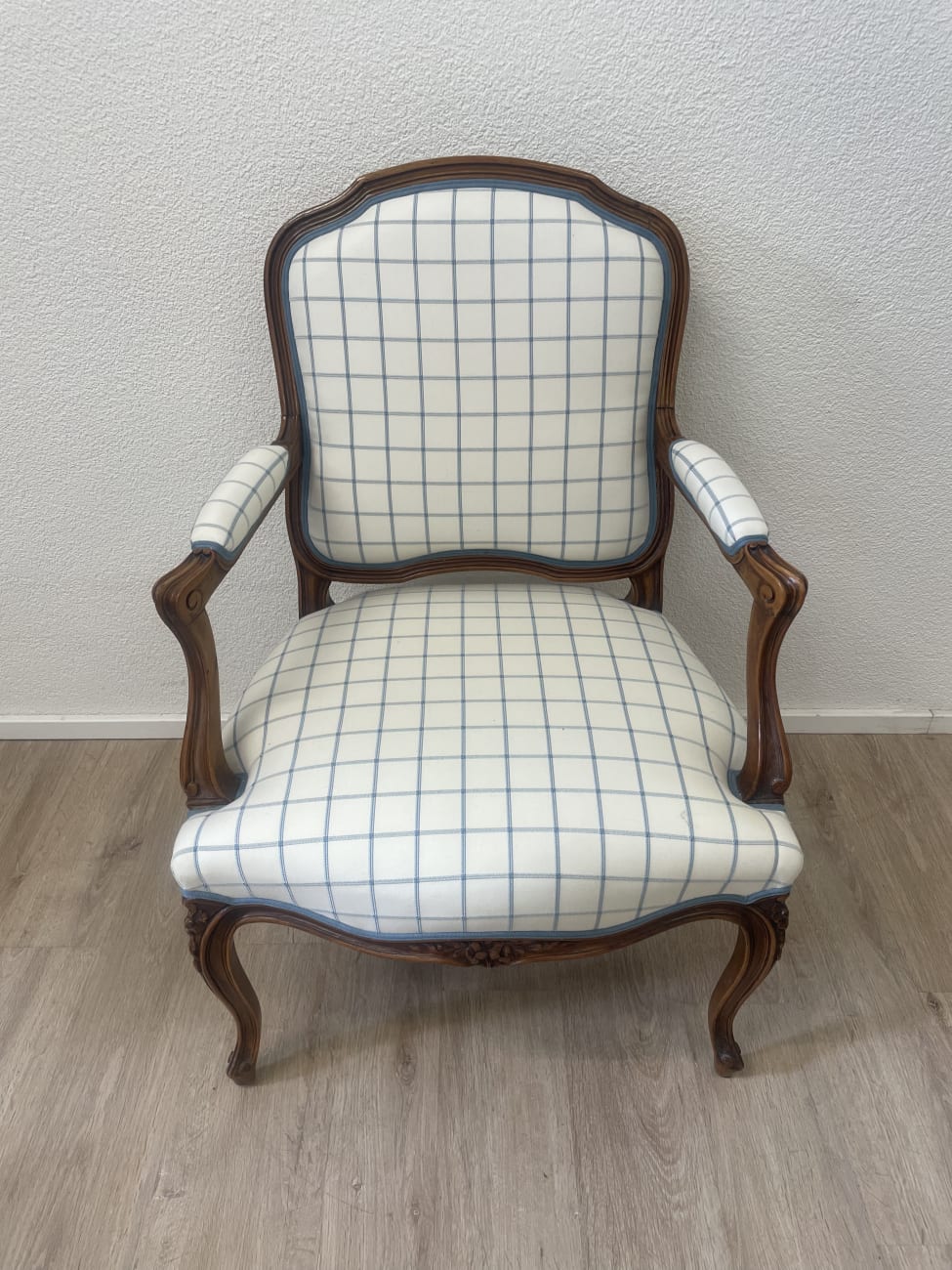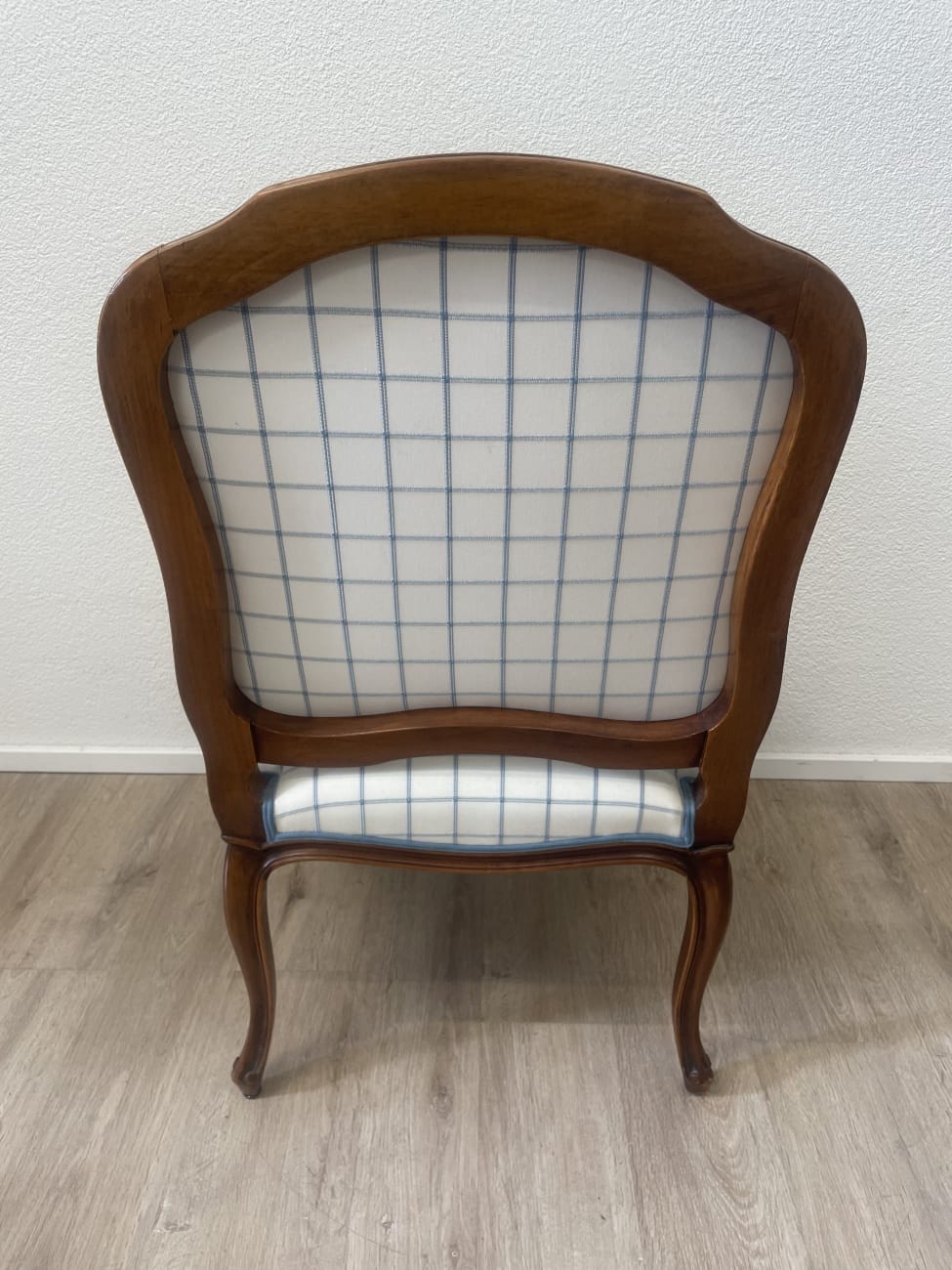 Antiker Louis XV Armlehnsessel aus Holz mit kariertem Stoffbezug