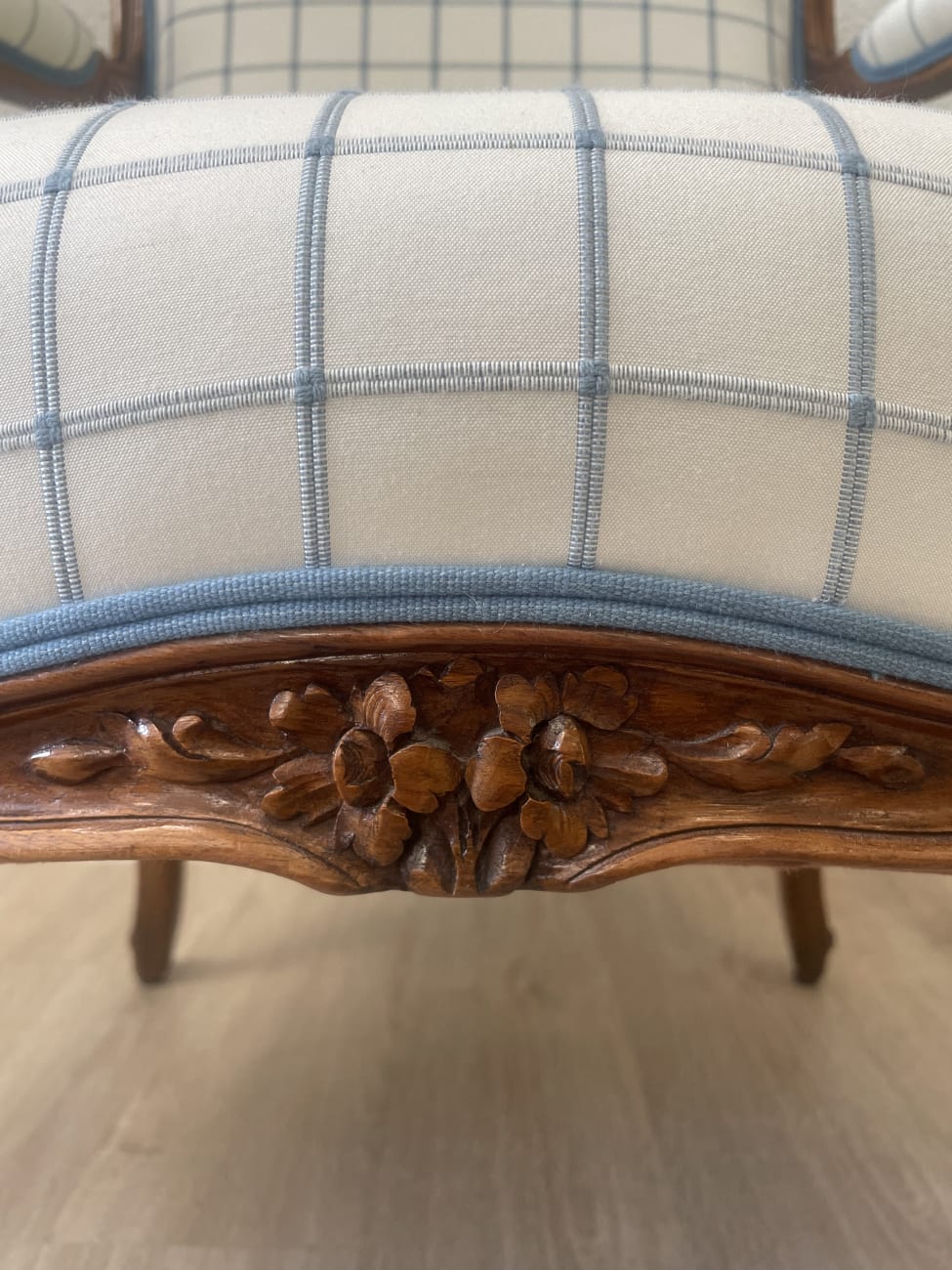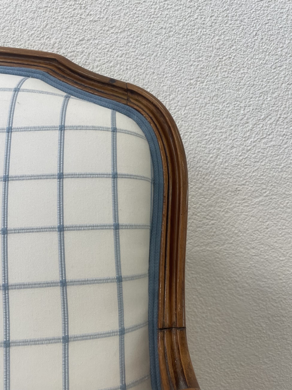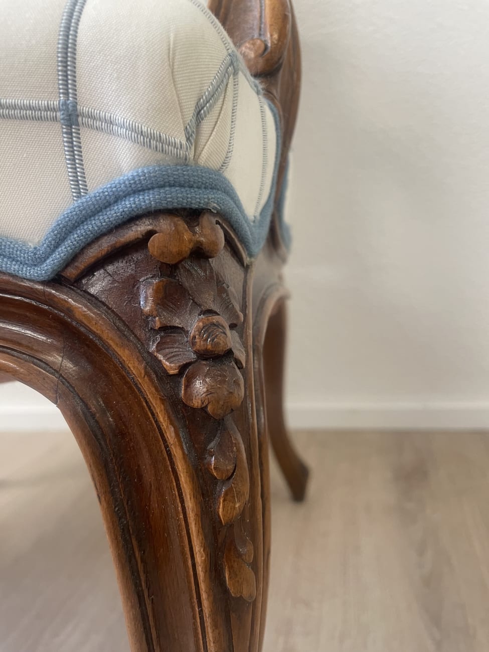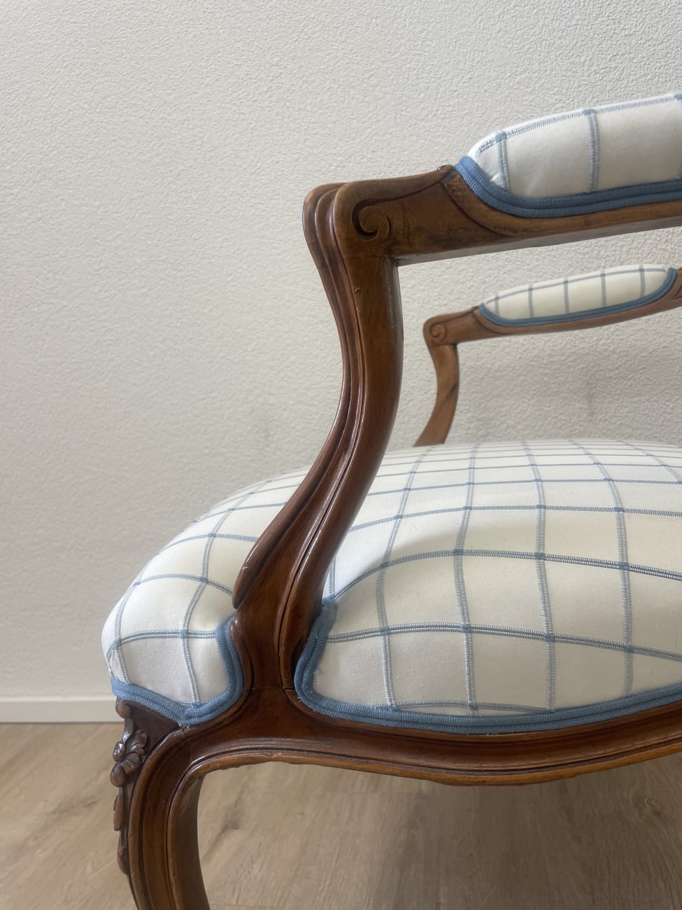 Weich geschwungene Formen, feine Schnitzereien und die typische Linienführung machen sofort klar, wo dieser Sessel einzuordnen ist. Antik im Louis XV Stil gefertigt, wahrscheinlich Anfang 20. Jahrhundert. Die elegante Silhouette zeigt sich in den gebogenen Beinen, den geschwungenen Armlehnen und den floralen Details im Holz. Der cremefarbene Stoff mit blauem Karomuster bringt einen ruhigeren, helleren Kontrast zum warmen Holzton. Stabil gebaut und angenehm gepolstert, passt er sowohl als Sitzmöbel wie auch als dekoratives Einzelstück.