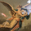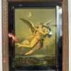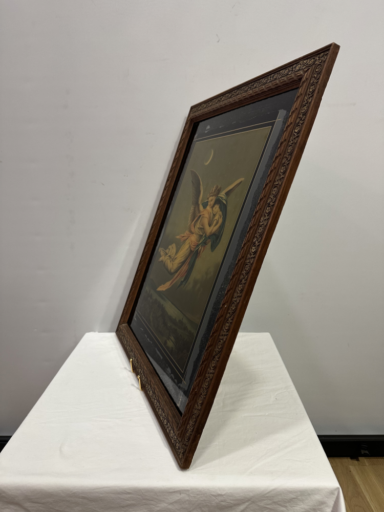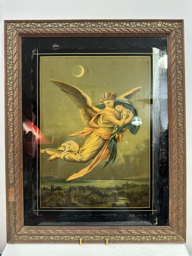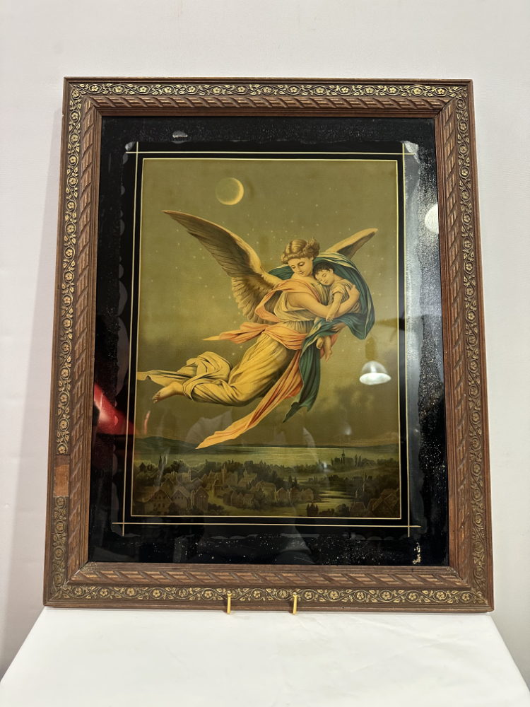 Ein klassisches Schutzengelmotiv aus der Zeit um 1900: Der Engel trägt ein schlafendes Kind durch den Nachthimmel, während unter ihnen eine friedliche Stadtlandschaft liegt. Im Hintergrund schwebt der Mond über sanft leuchtenden Wolken. Das Werk wurde als Öldruck gefertigt, ist eine aufwendige Drucktechnik, bei der ölhaltige Farben auf Papier aufgetragen wurden, um den Eindruck einer echten Ölgemäldeoberfläche zu erzeugen.