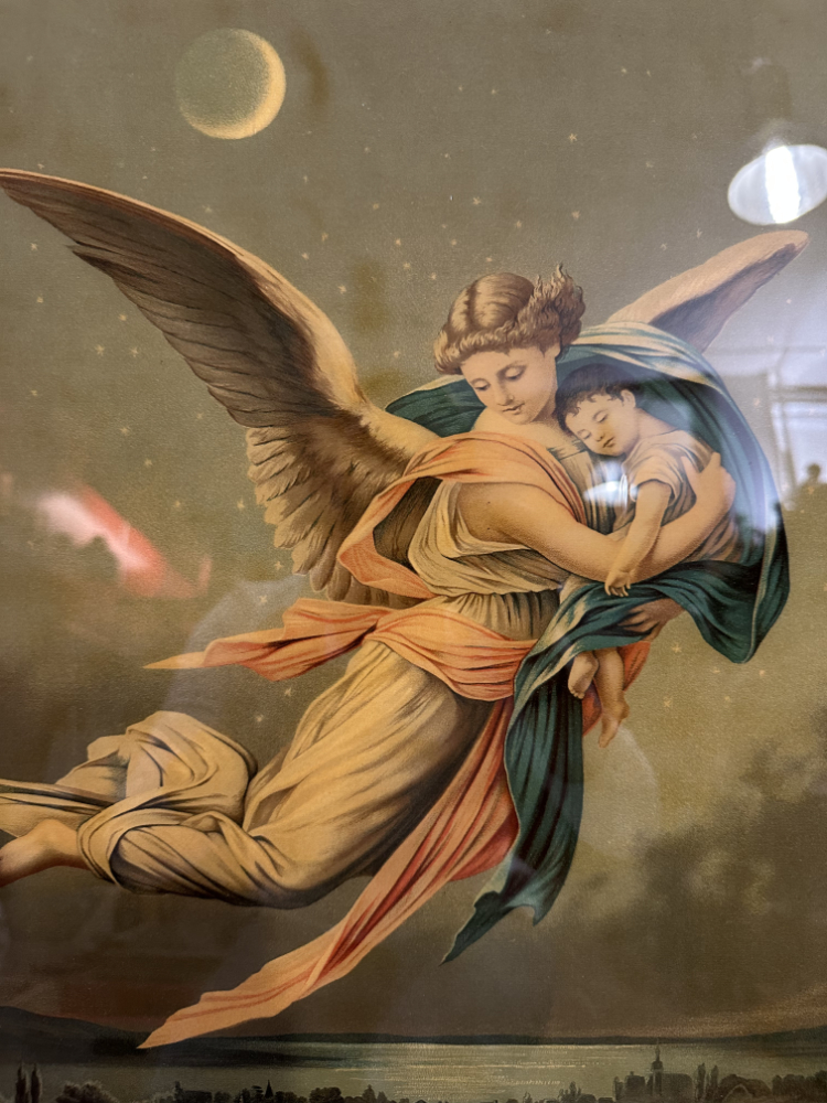 Antiker Öldruck «Engel mit Kind über Stadtlandschaft» um 1900