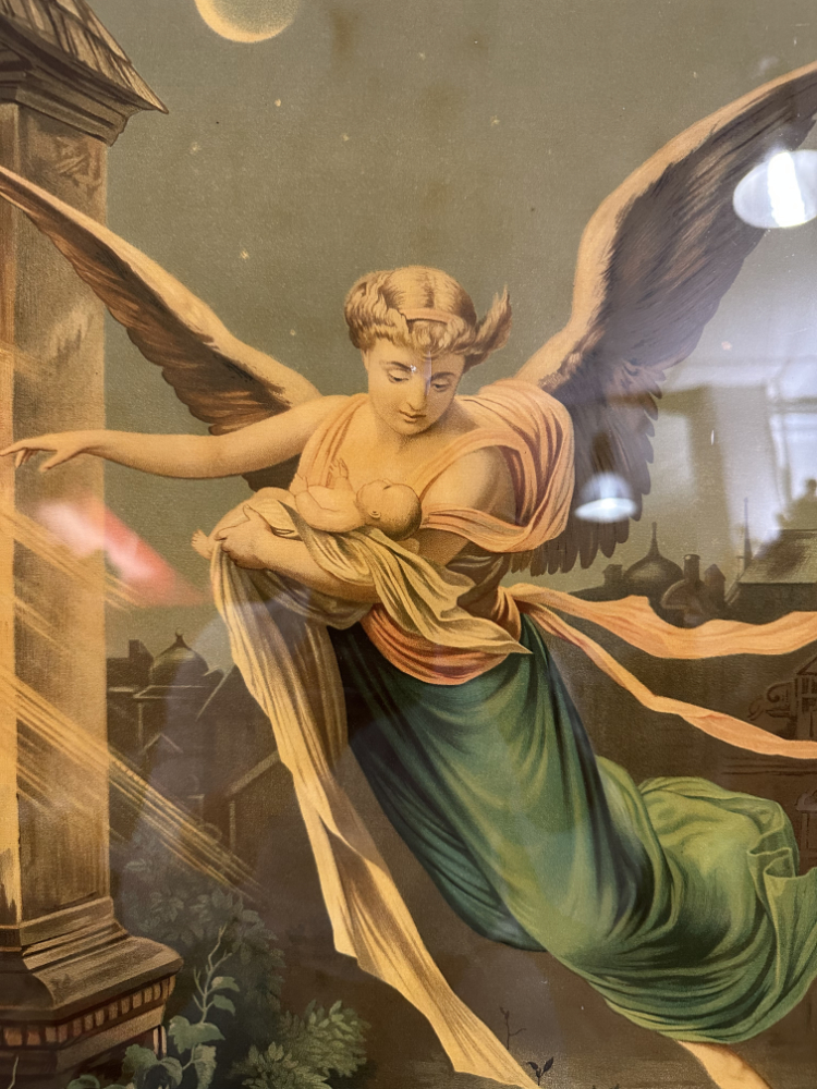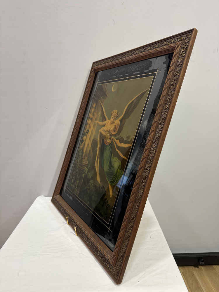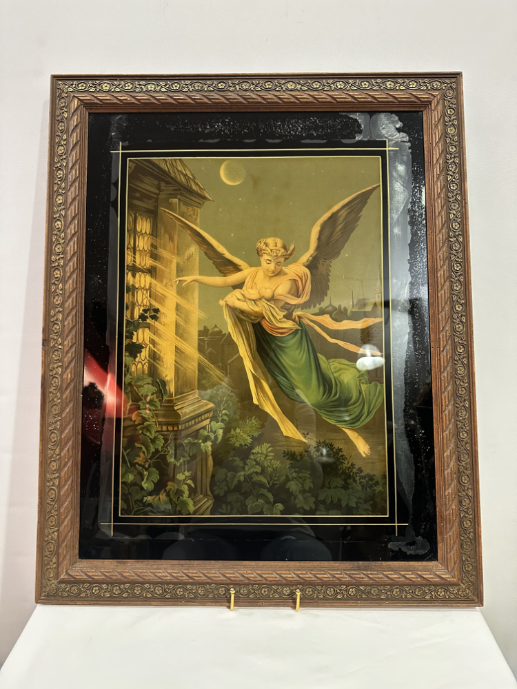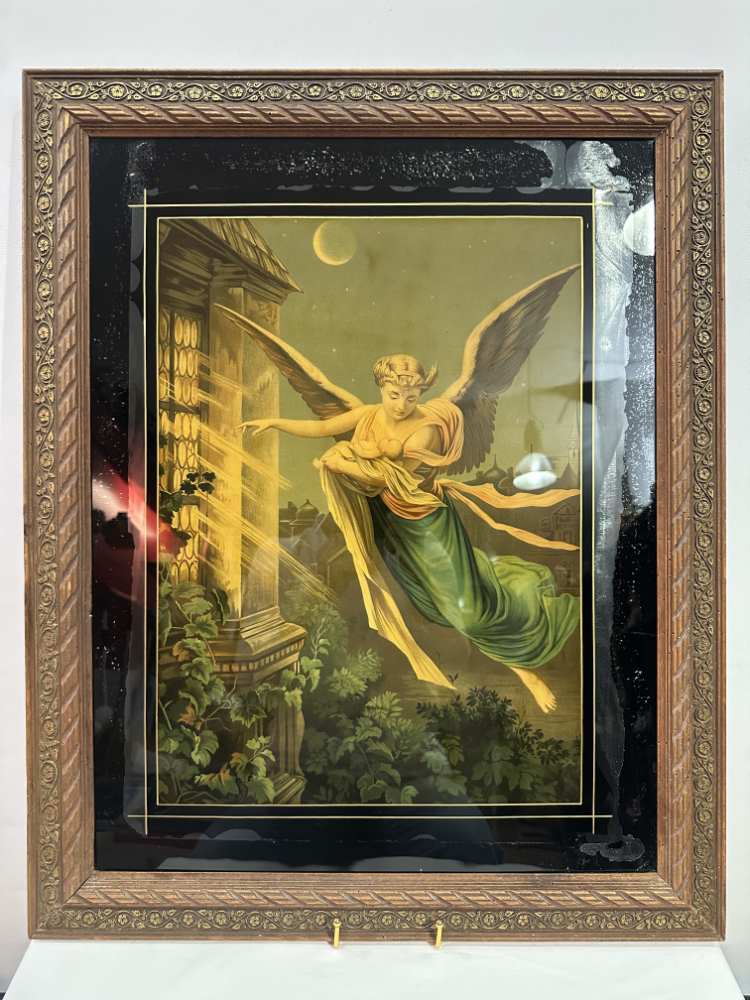 Ein ergreifendes Motiv aus der Zeit um 1900: Ein schützender Engel trägt ein Kind durch die Nacht, im Hintergrund leuchten Mond und architektonische Säulen im zarten Schein. Dieses Werk wurde als Öldruck ausgeführt, ist eine aufwendige Drucktechnik, bei der das Bild mithilfe ölhaltiger Farben auf Papier übertragen wurde, um die Tiefe und Struktur einer echten Malerei zu imitieren.