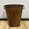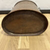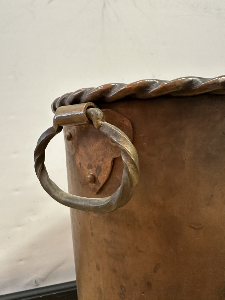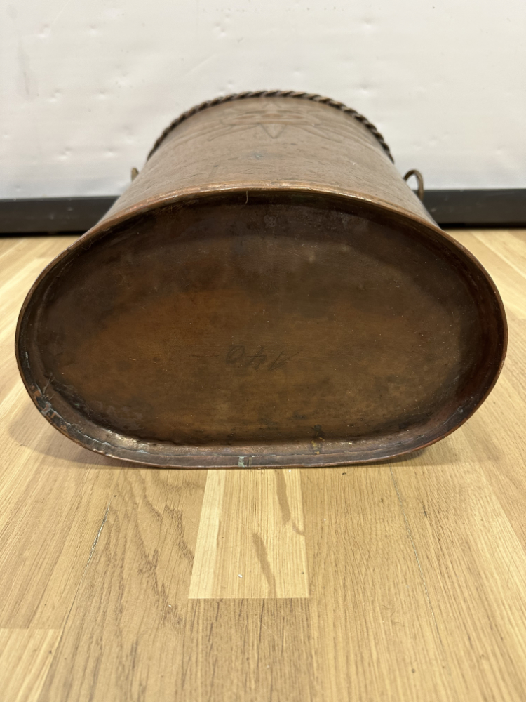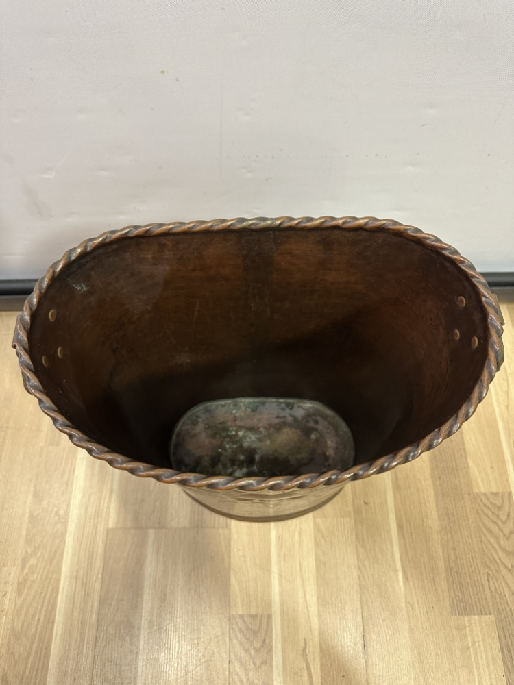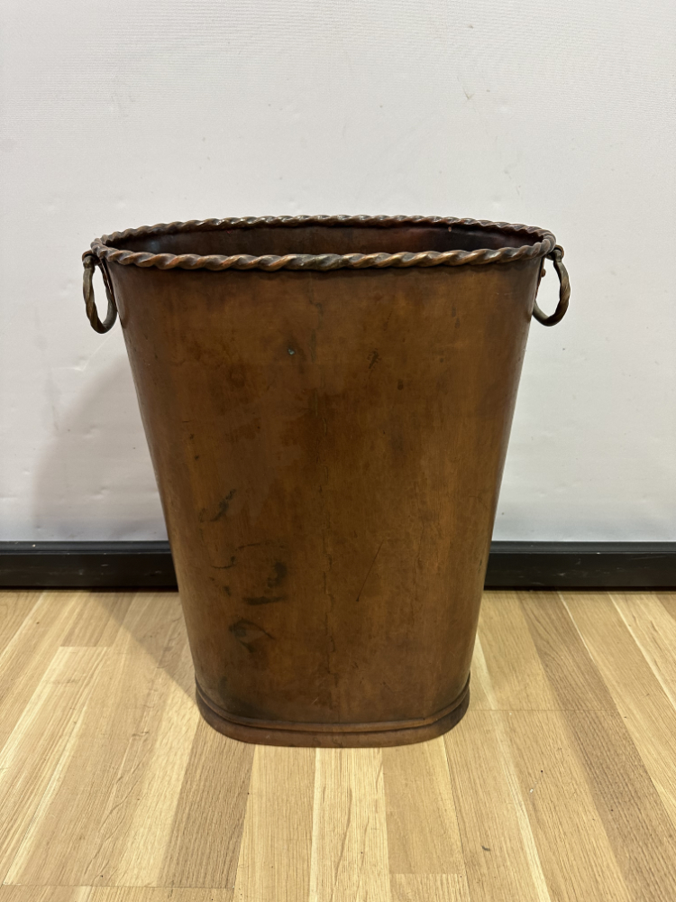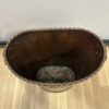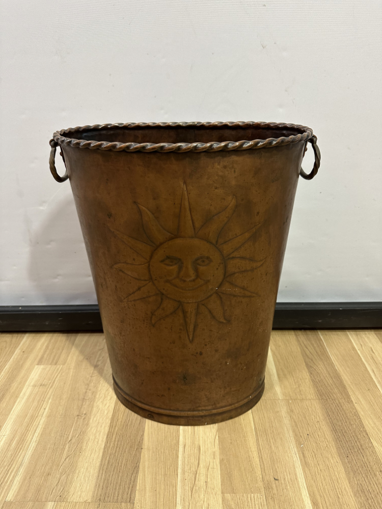 Dieser antike Schirmständer aus massivem Kupfer ist ein echtes handwerkliches Stück mit Charakter. Die ovale Form, der kunstvoll gedrehte Rand und die seitlichen Schmiederinge zeugen von traditioneller Metallarbeit. Auf der Vorderseite zeigt sich ein reliefartig geprägtes Sonnenmotiv mit freundlichem Gesicht, das dem Stück eine warme, dekorative Ausstrahlung verleiht.