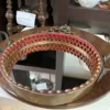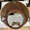 Antiker Wandspiegel an einer Eisenkette befindet sich in einem guten bis sehr guten Zustand. Dieser Spiegel ist besonders schön an einer Eisenkette befestigt. Zuoberst befinden sich ein schöner Eisenknopf der die Kette zusammenhält. An der Spiegel Innenseite schimmert noch ein roten Hintergrund hervor, darauf befinden sich lauter goldige Kreise. Er ist wunderschön und macht überall eine tolle Erscheinung.