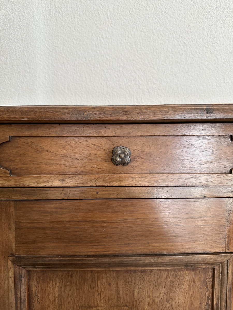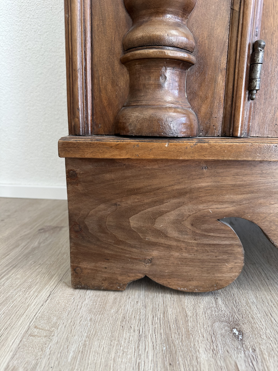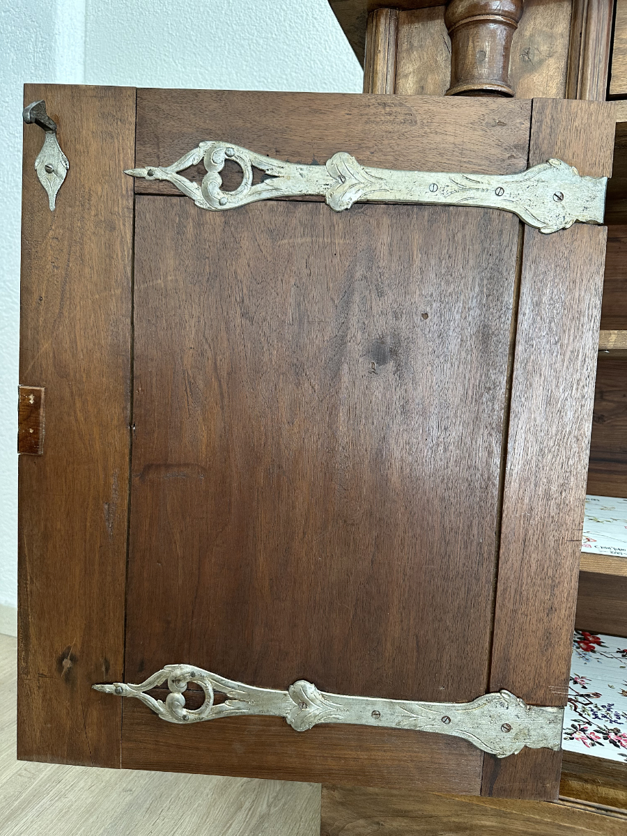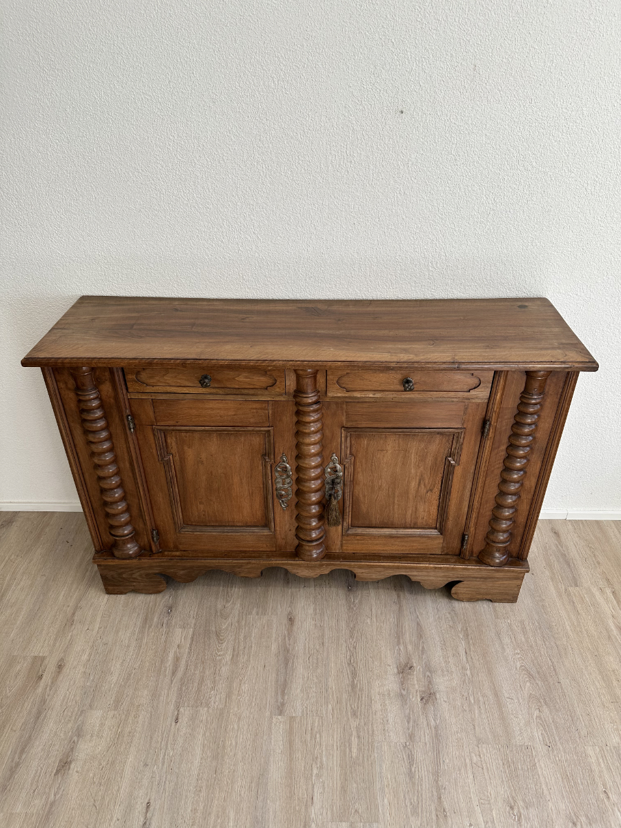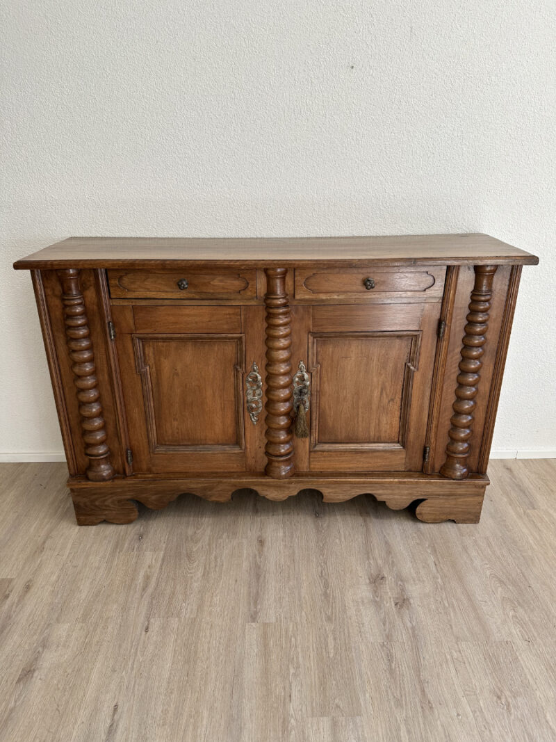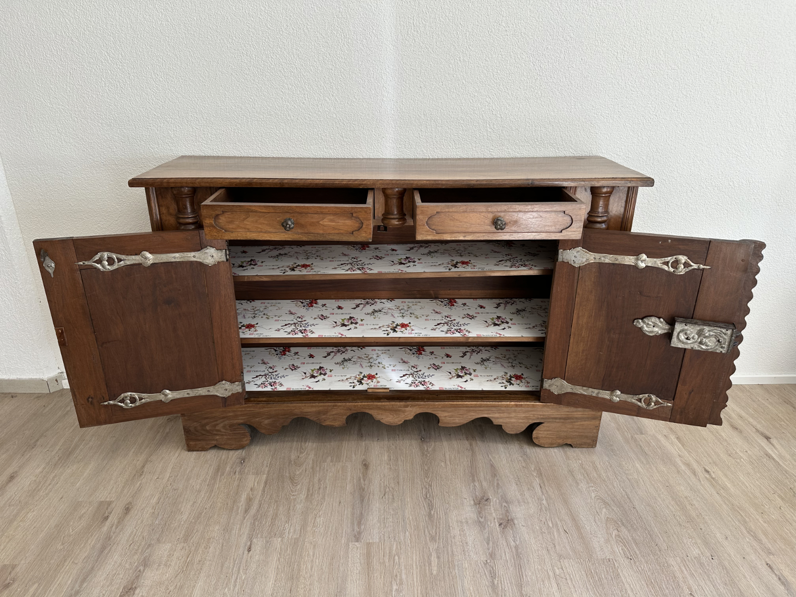 Massivholz, kräftige Proportionen und eine barock inspirierte Front machen dieses antike Sideboard zu einem echten Blickfang. Um 1880 gefertigt, zeigt es die typische handwerkliche Qualität dieser Zeit: gedrechselte Säulen, profilierte Türfüllungen, zwei Schubladen oben und ein grosszügiger Innenraum hinter den Türen. Die Metallbeschläge wirken original, das Schloss ist vorhanden und ein Schlüssel ist dabei. Innen bieten zwei Fachböden viel Platz, aktuell mit floralem Papier ausgelegt.