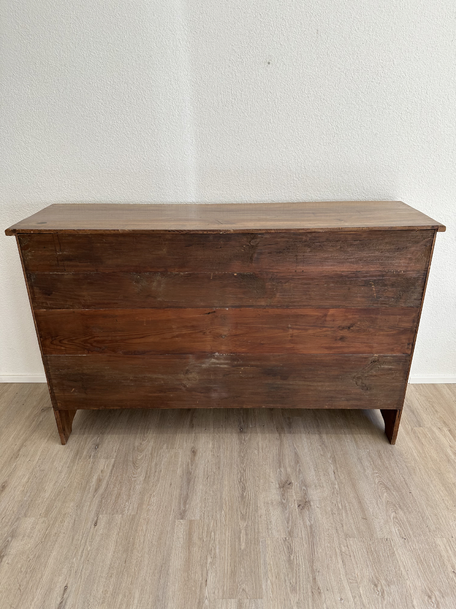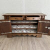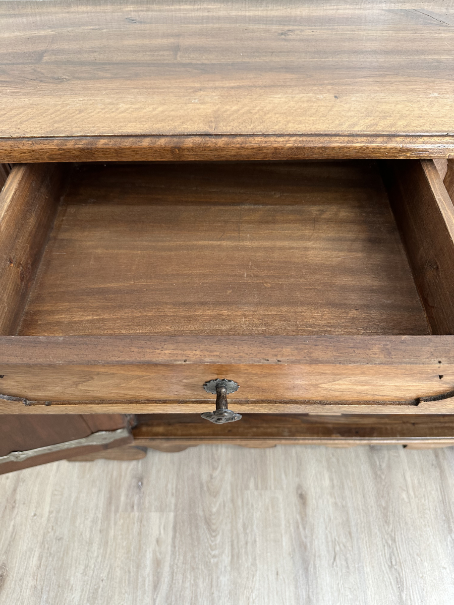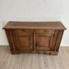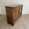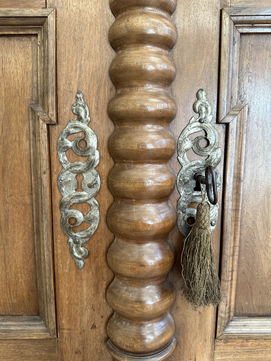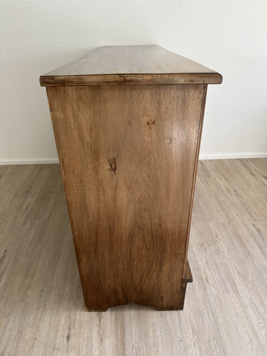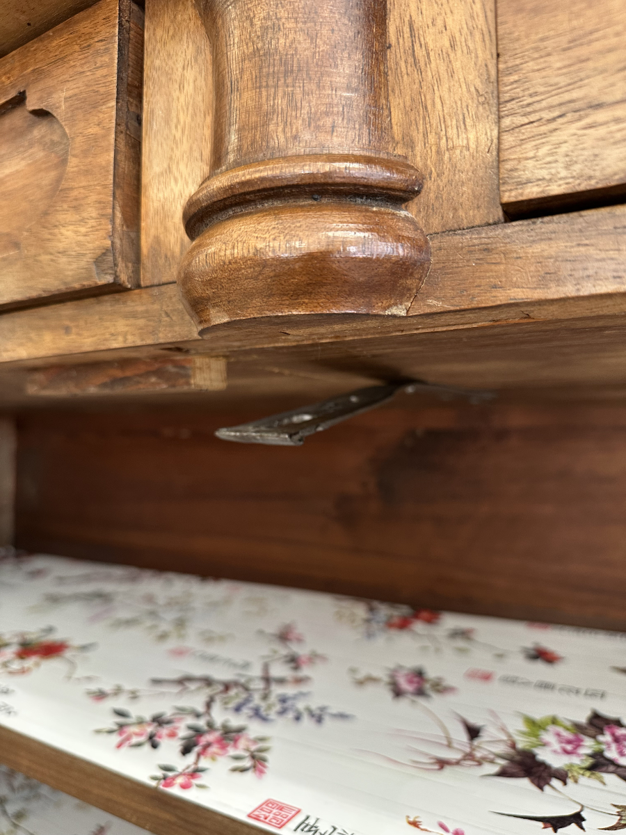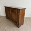 Massivholz, kräftige Proportionen und eine barock inspirierte Front machen dieses antike Sideboard zu einem echten Blickfang. Um 1880 gefertigt, zeigt es die typische handwerkliche Qualität dieser Zeit: gedrechselte Säulen, profilierte Türfüllungen, zwei Schubladen oben und ein grosszügiger Innenraum hinter den Türen. Die Metallbeschläge wirken original, das Schloss ist vorhanden und ein Schlüssel ist dabei. Innen bieten zwei Fachböden viel Platz, aktuell mit floralem Papier ausgelegt.