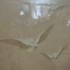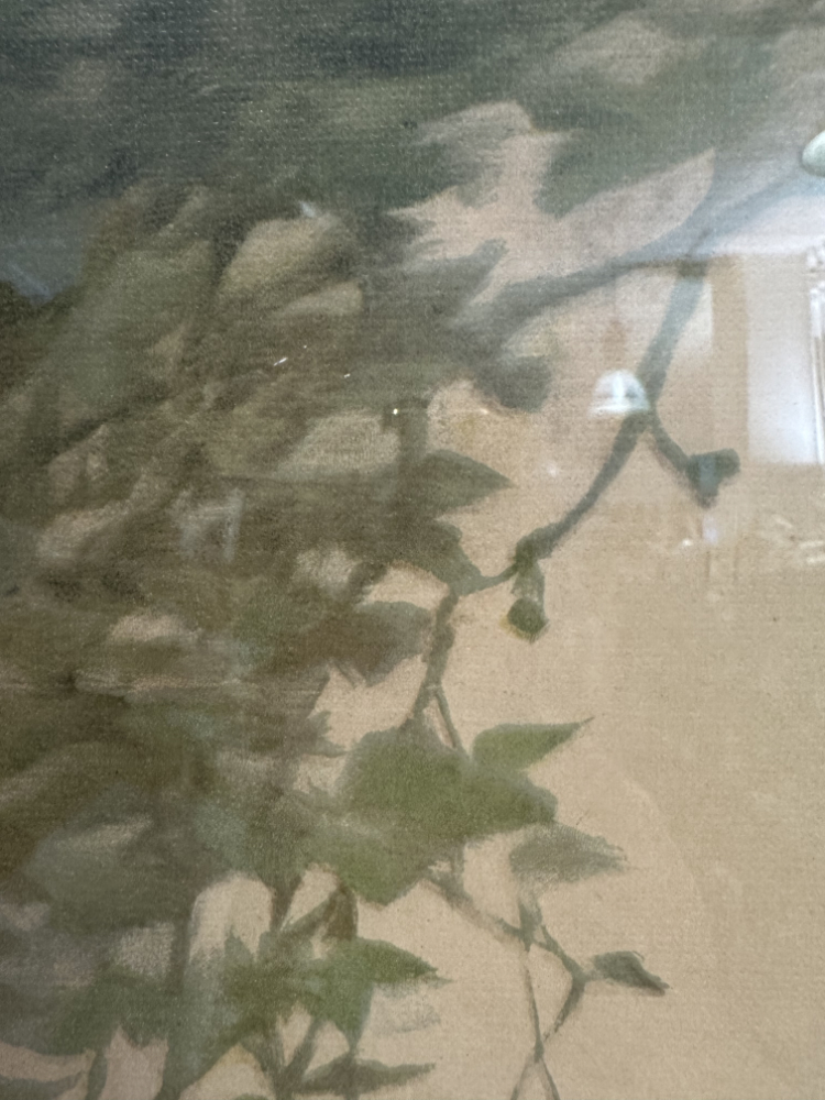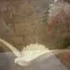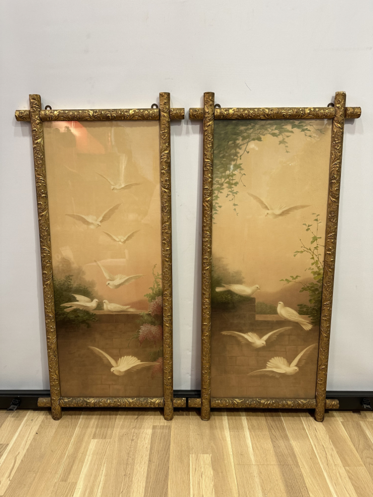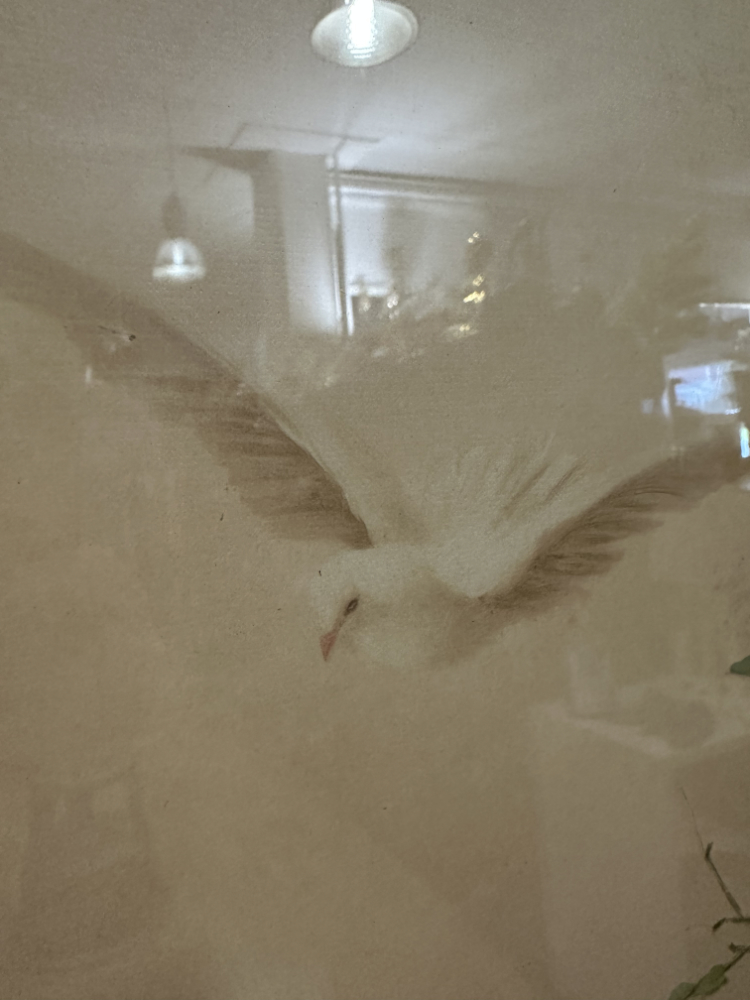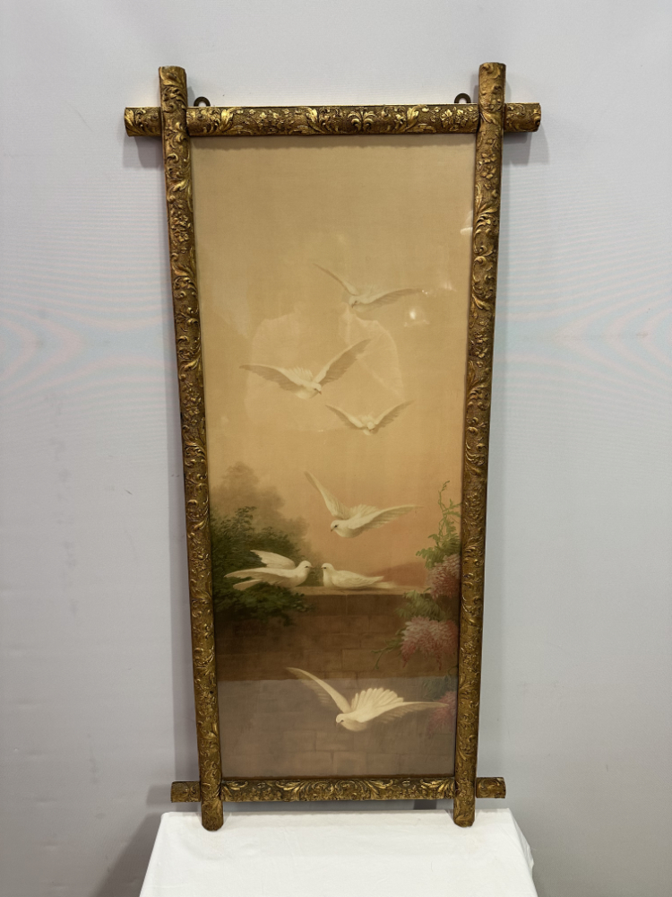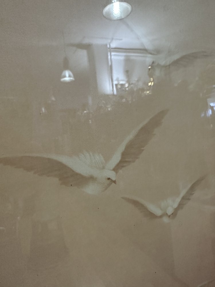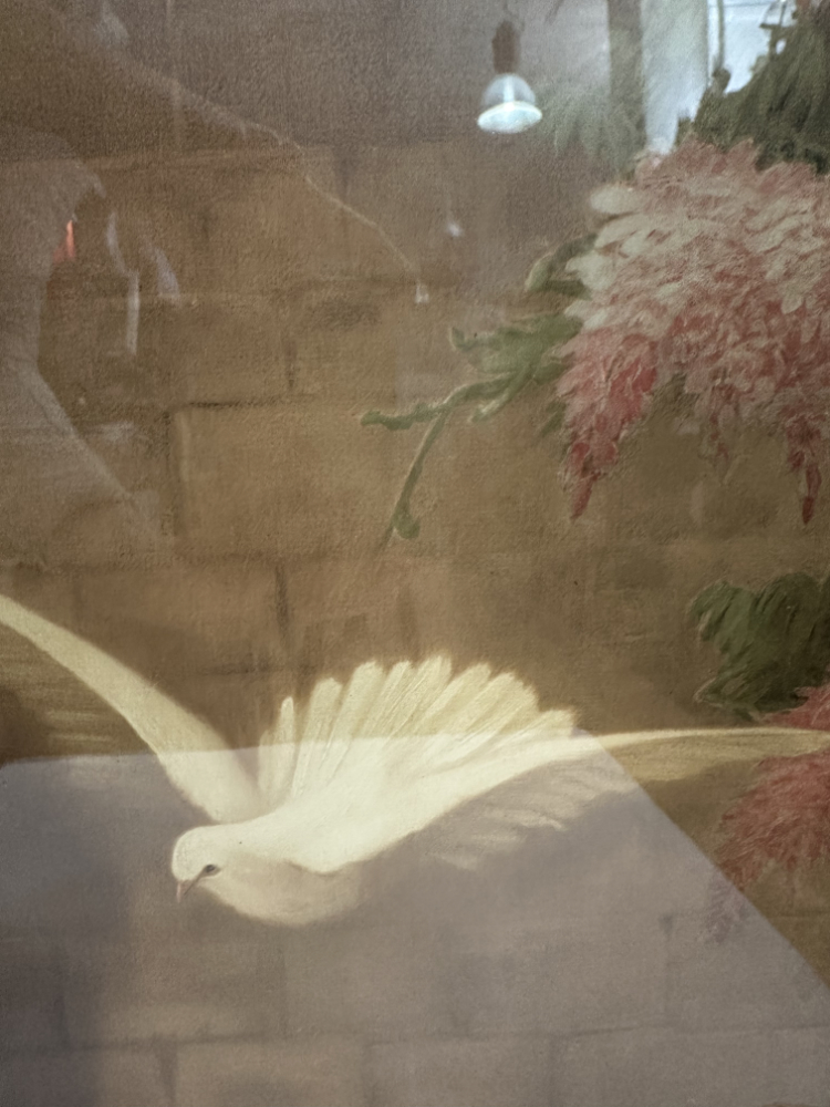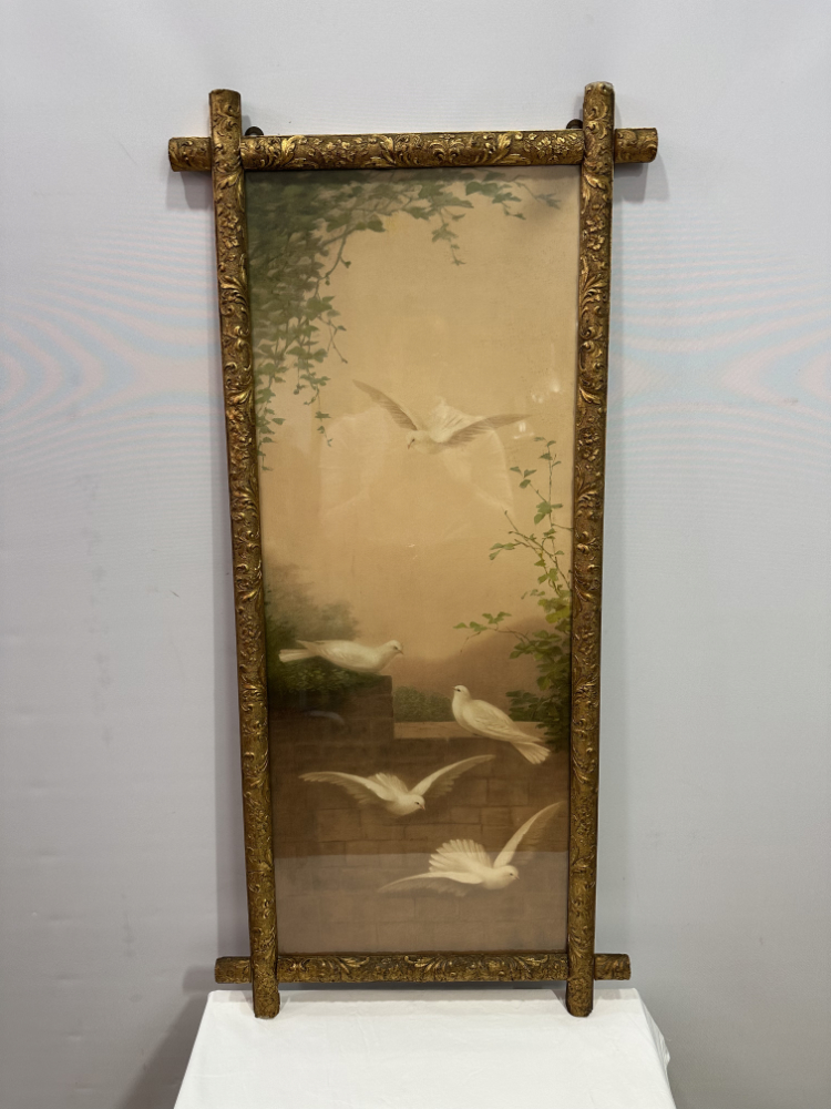 Feine Farbverläufe in zarten Grün-, Beige- und Rosatönen verleihen der Komposition eine ruhige, fast meditative Ausstrahlung. Das Spiel von Licht und Schatten ist meisterhaft ausgearbeitet, besonders in der Darstellung der Taubenflügel, die Transparenz und Bewegung zugleich zeigen. Das Gemälde ist hinter Glas gefasst, wodurch die Oberfläche optimal geschützt bleibt.