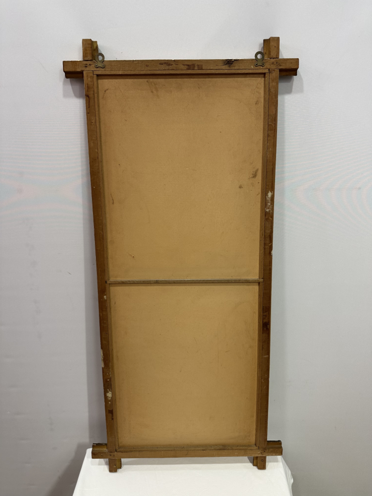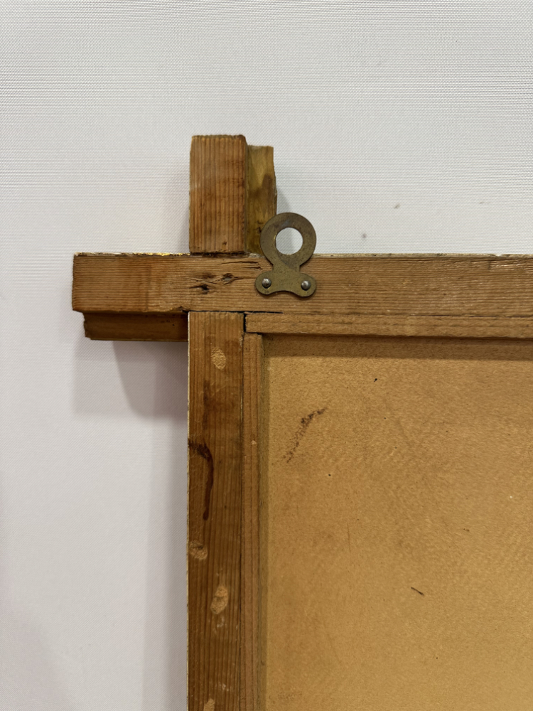 Der vergoldete Reliefrahmen im floralen Jugendstil betont den dekorativen Charakter des Werkes. Seine gekreuzte Holzform mit plastischen Ornamenten greift typische Elemente der Jahrhundertwende auf und macht das Gemälde zu einem besonderen Blickfang.