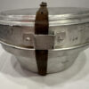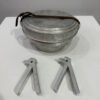 Dieses seltene Kochset der Marke META aus Basel stammt aus den 1950er Jahren und wurde vollständig aus robustem Aluminium gefertigt. Das Modell «META-50» gehört zu den frühen Schweizer Outdoor Kochsystemen, die für Camping, Armee- und Zivilschutzeinsätze entwickelt wurden. Es besteht aus mehreren stapelbaren Elementen, darunter Töpfe, Sieb, Deckel und Halterungen, sowie einem originalen Messingbrenner. Der lederne Trageriemen und die geprägte Herstellerprägung unterstreichen den authentischen Vintage Charakter.