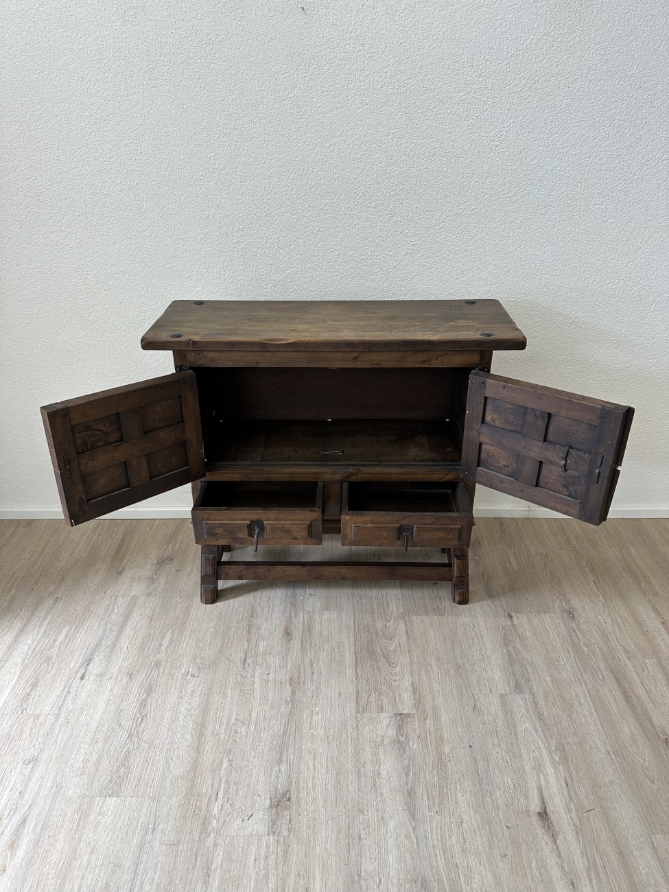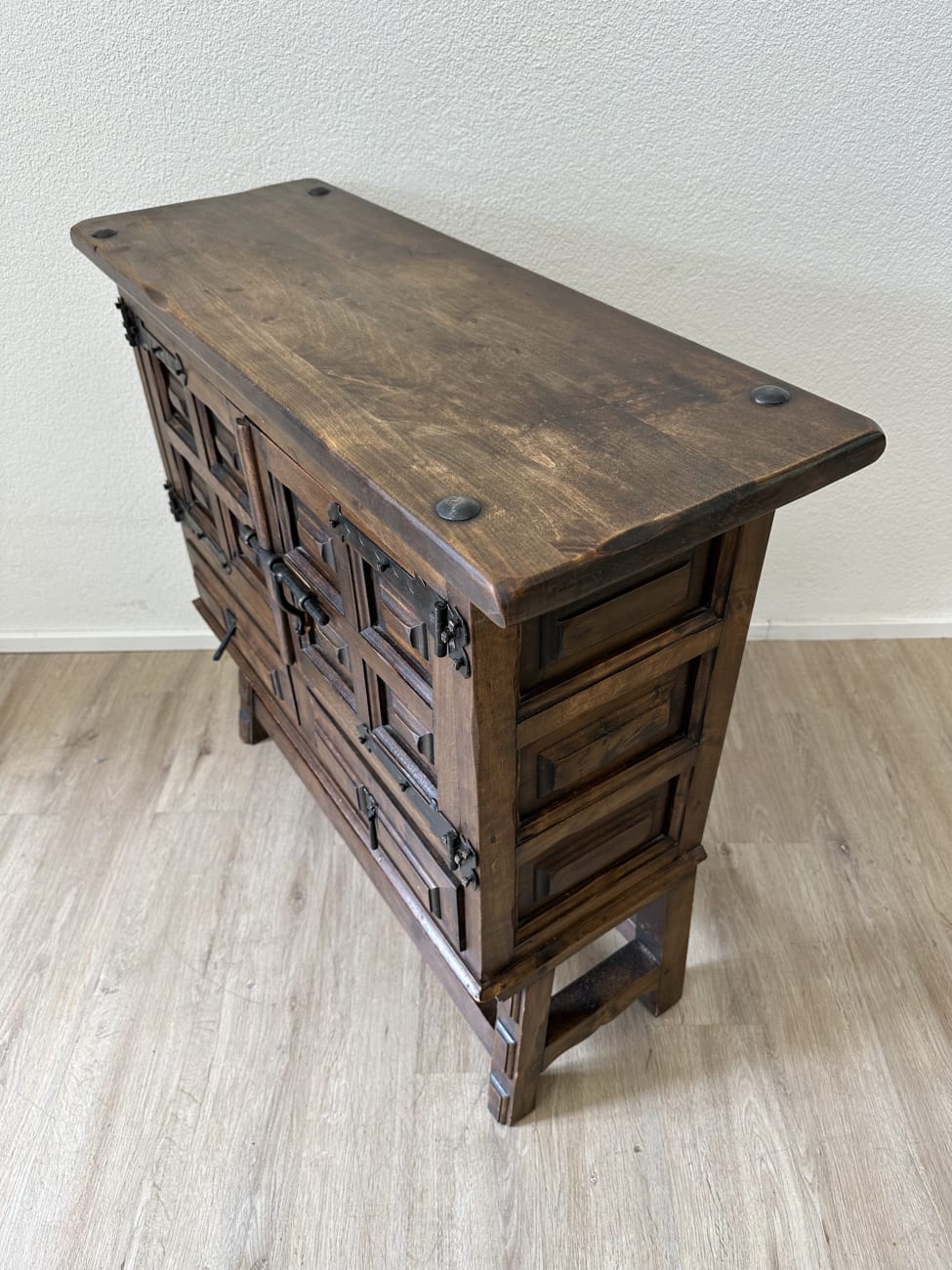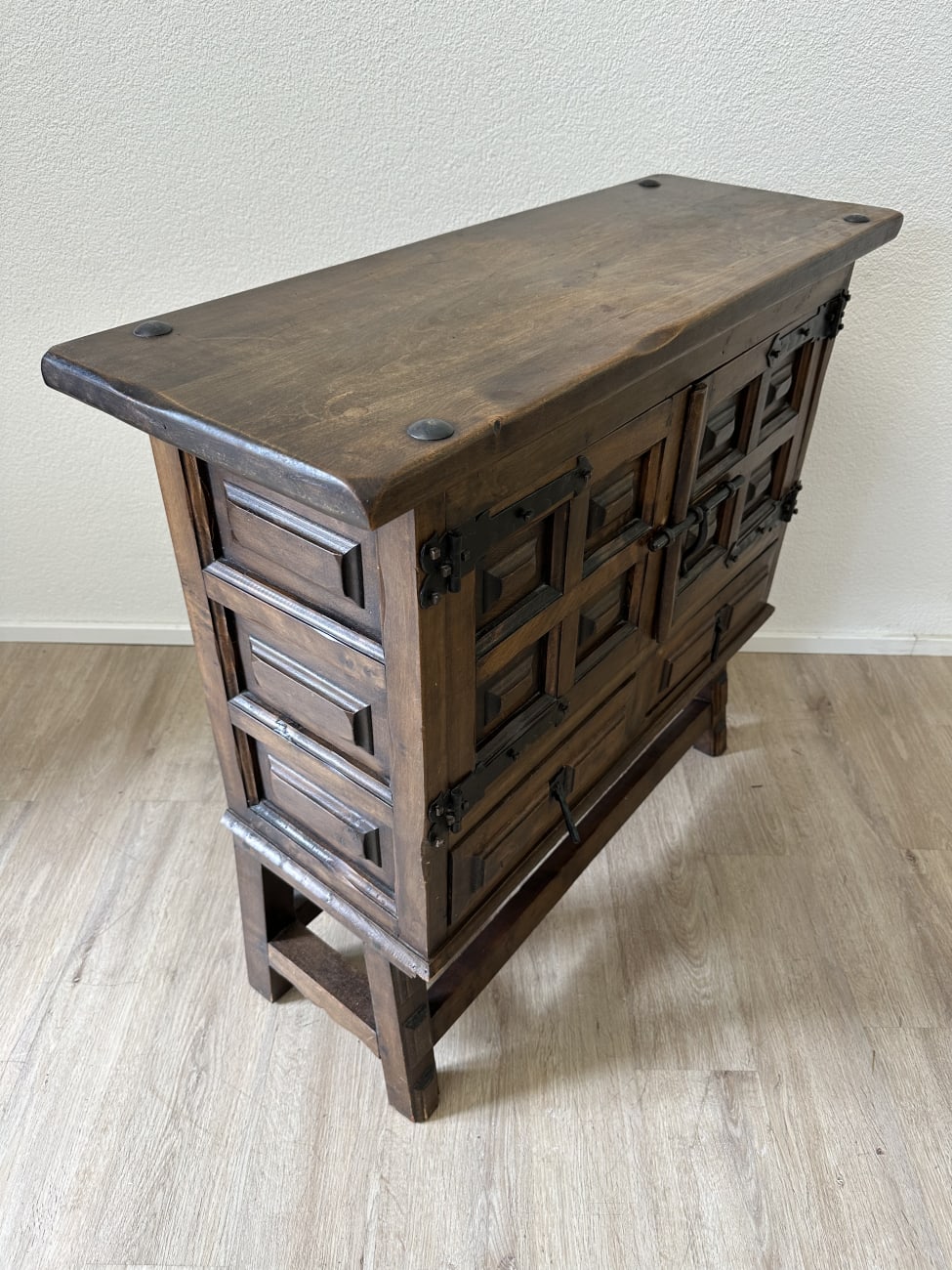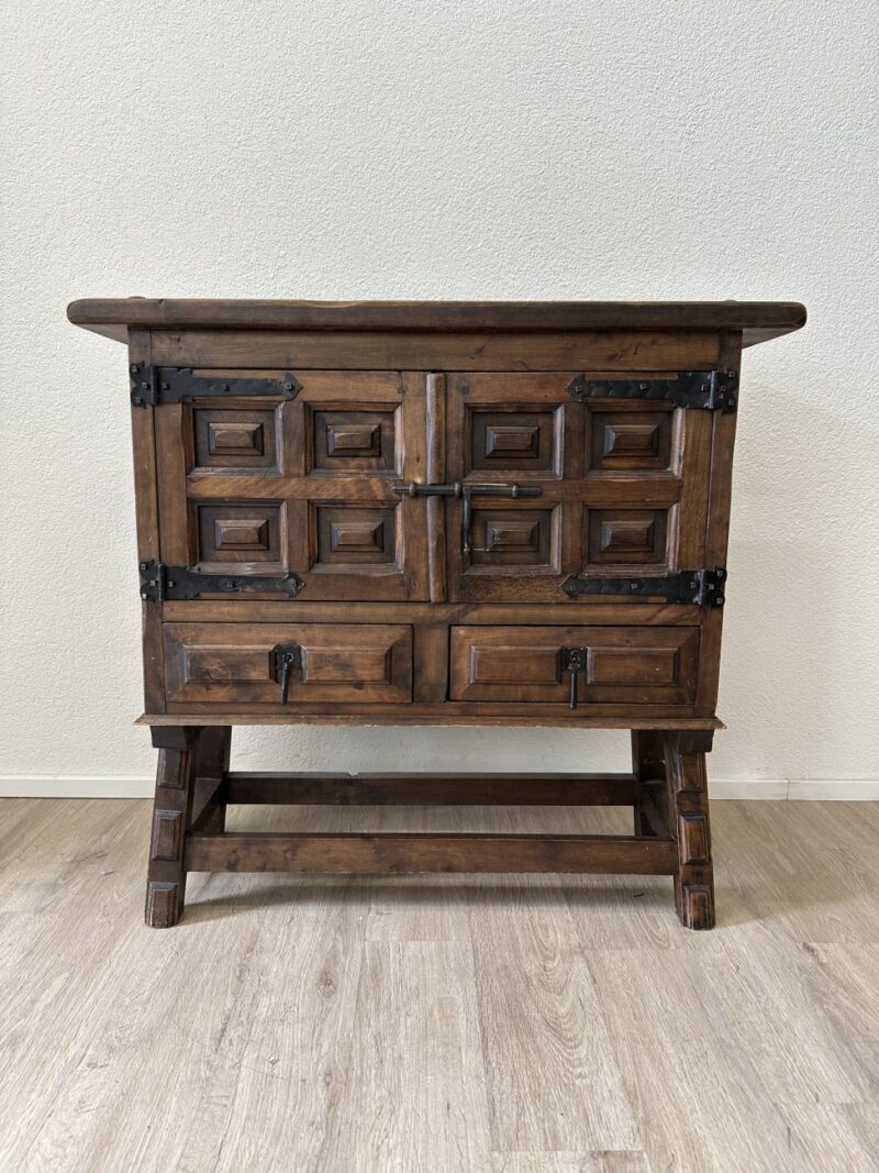 Dunkel gebeiztes Massivholz mit kräftiger Maserung und typischen Schmiedeeisen-Details zeigt klar den spanischen Stil dieser Zeit. Die Front ist mit tief gearbeiteten Kassettentüren aufgebaut, ergänzt durch massive Scharniere und einen zentralen Riegelverschluss. Das Möbel wirkt kompakt, stabil und sehr charaktervoll.