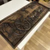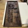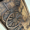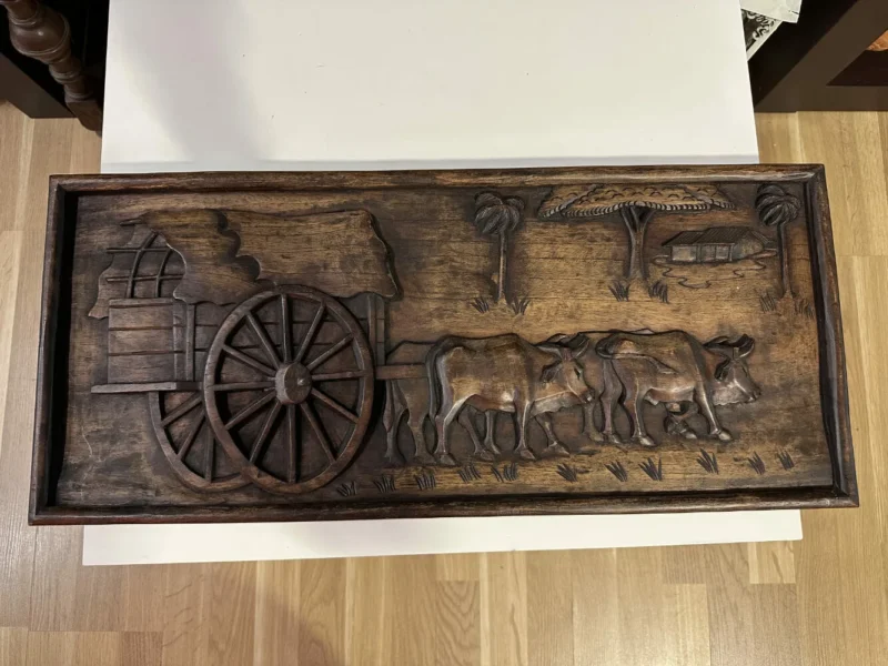 Vintage Wandbild aus Holzschnitzerei befindet sich in einem guten bis sehr guten Zustand. Dieses Wandbild bildet eine schöne Darstellung in Argentinien ab. Auf dem Bild zusehen ist eine Horde von Kühen, die einen Wagen ziehen. Das Bild strahlt stärke wie auch eine Ruhige Art aus, dass man in der Landschaft im Hintergrund wieder findet.