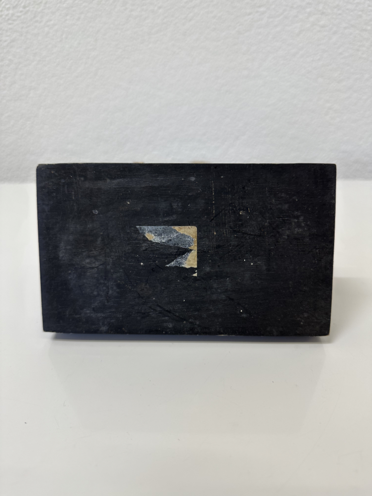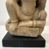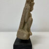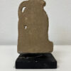 Gefertigt aus massivem Stein oder steinähnlichem Material, steht die Skulptur auf einem schlichten, schwarzen Sockel, der ihr Stabilität verleiht und die Figur optisch hervorhebt. Die Rückseite ist flach gehalten, was auf eine ursprünglich wandnahe Platzierung oder eine Reliefanlehnung hindeutet. Alters- und Gebrauchsspuren unterstreichen den handwerklichen Charakter.